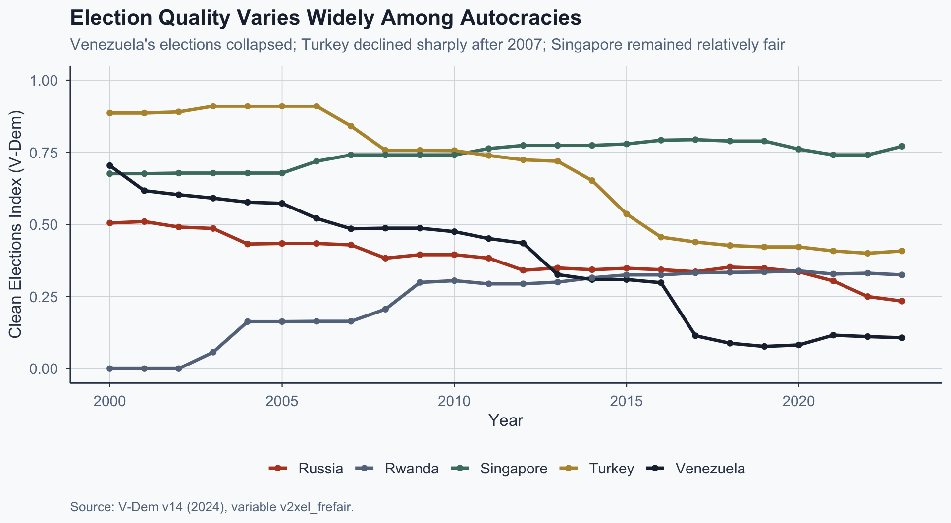 Gandhi, J., & Przeworski, A. (2007). Authoritarian institutions and the survival of autocrats. Comparative Political Studies, 40(11), 1279–1301.