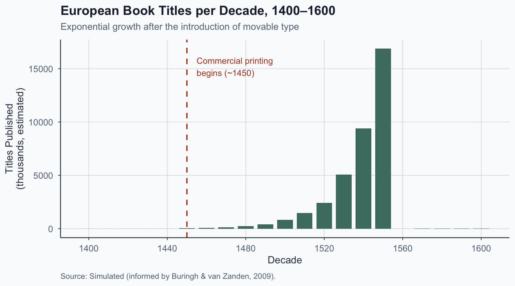 Around 1450, a single technology — the movable-type press — became available across Europe and the Islamic world.
