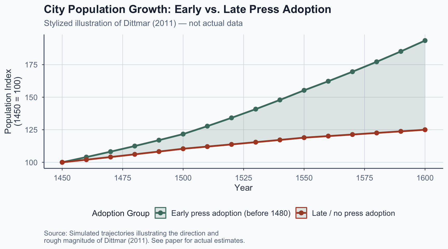 Figure 5: Stylized illustration of Dittmar’s (2011) main finding: early press cities grew substantially faster.