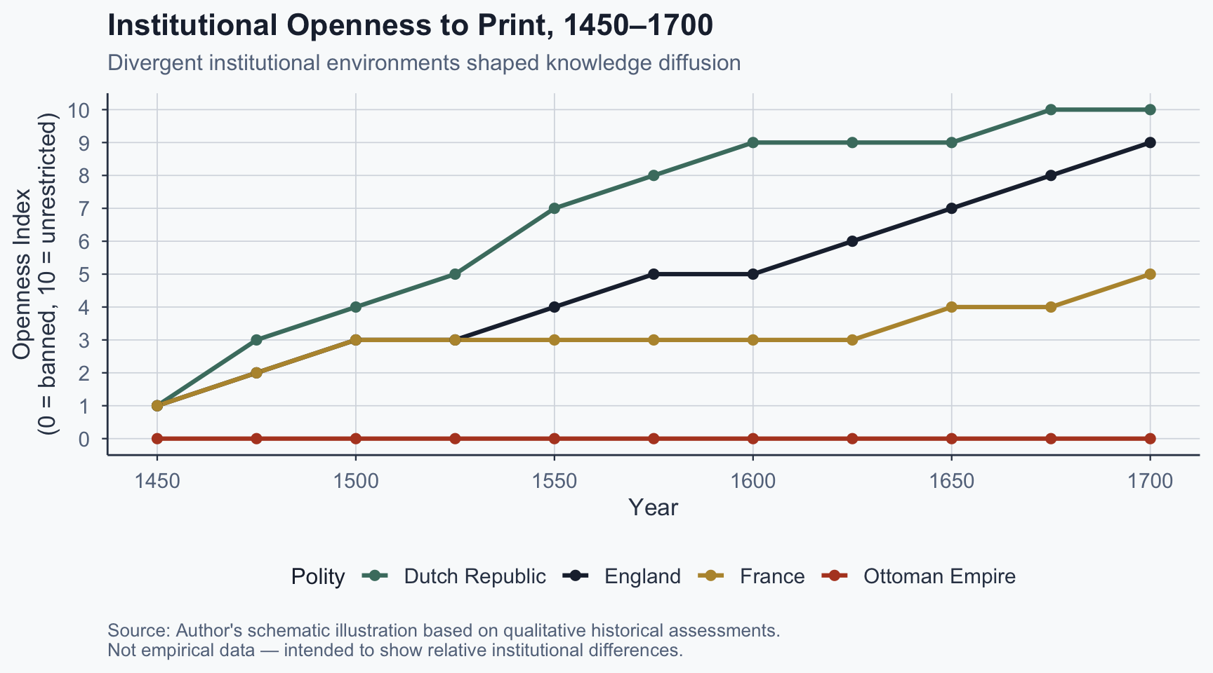 Result: England’s open knowledge market contributed to earlier industrialization.