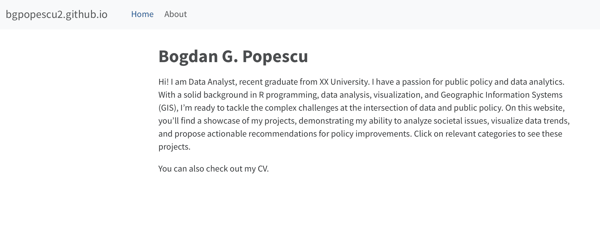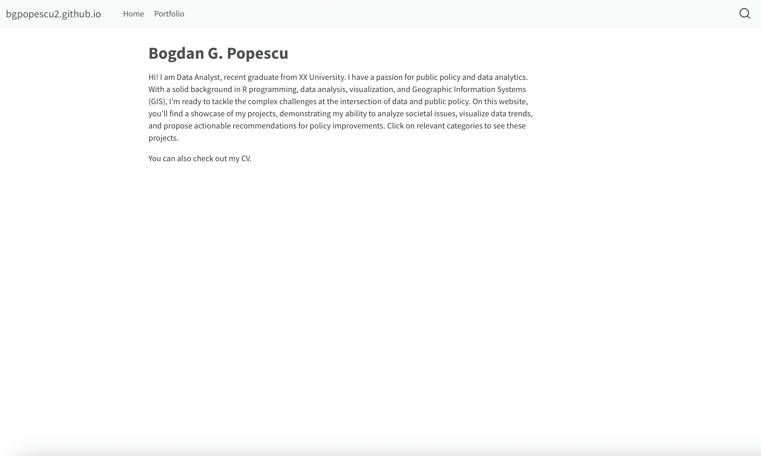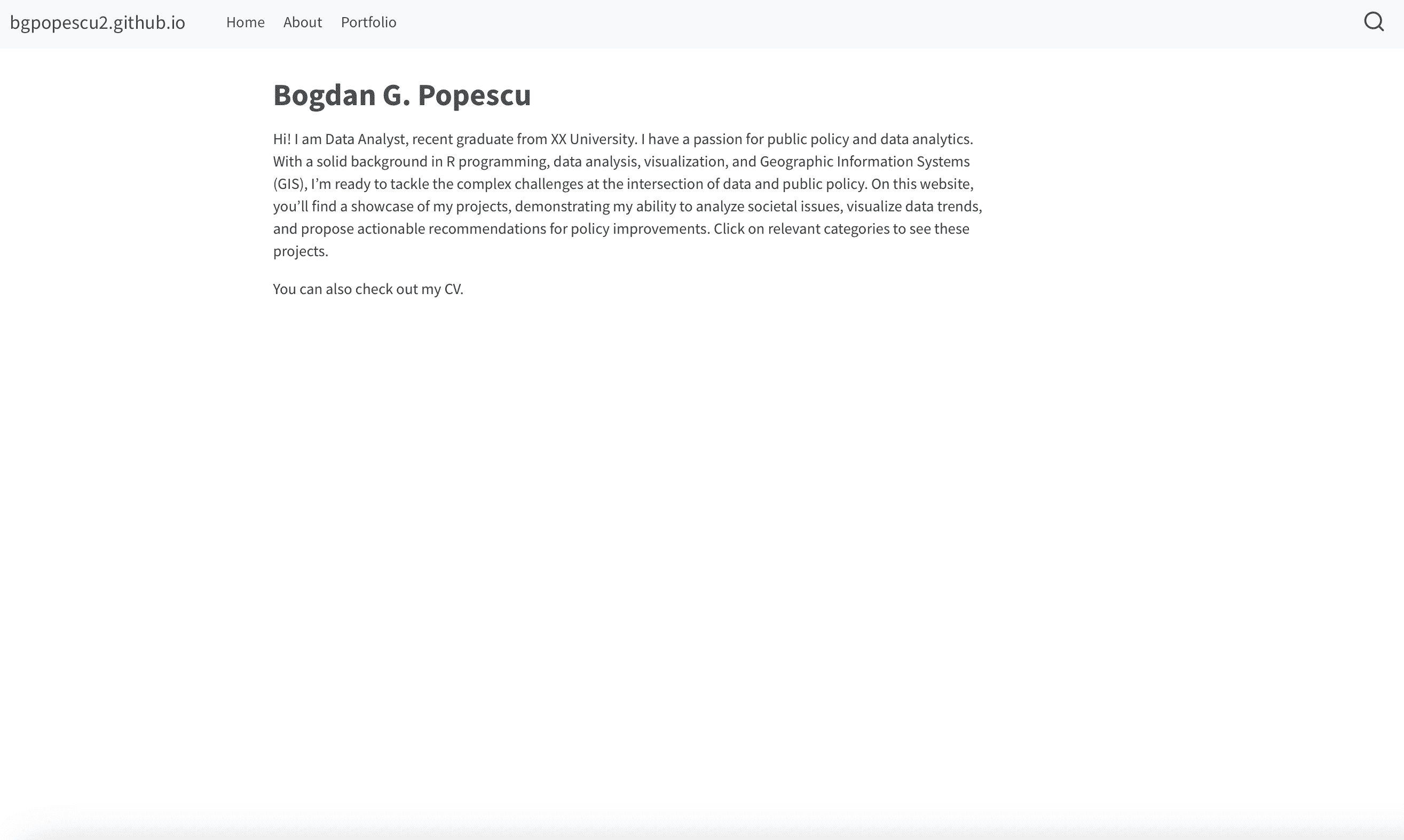 Hi! I am Data Analyst, recent graduate from XX University. I have a passion for public policy and data analytics. With a solid background in R programming, data analysis, visualization, and Geographic Information Systems (GIS), I’m ready to tackle the complex challenges at the intersection of data and public policy. On this website, you’ll find a showcase of my projects, demonstrating my ability to analyze societal issues, visualize data trends, and propose actionable recommendations for policy improvements. Click on relevant categories to see these projects.