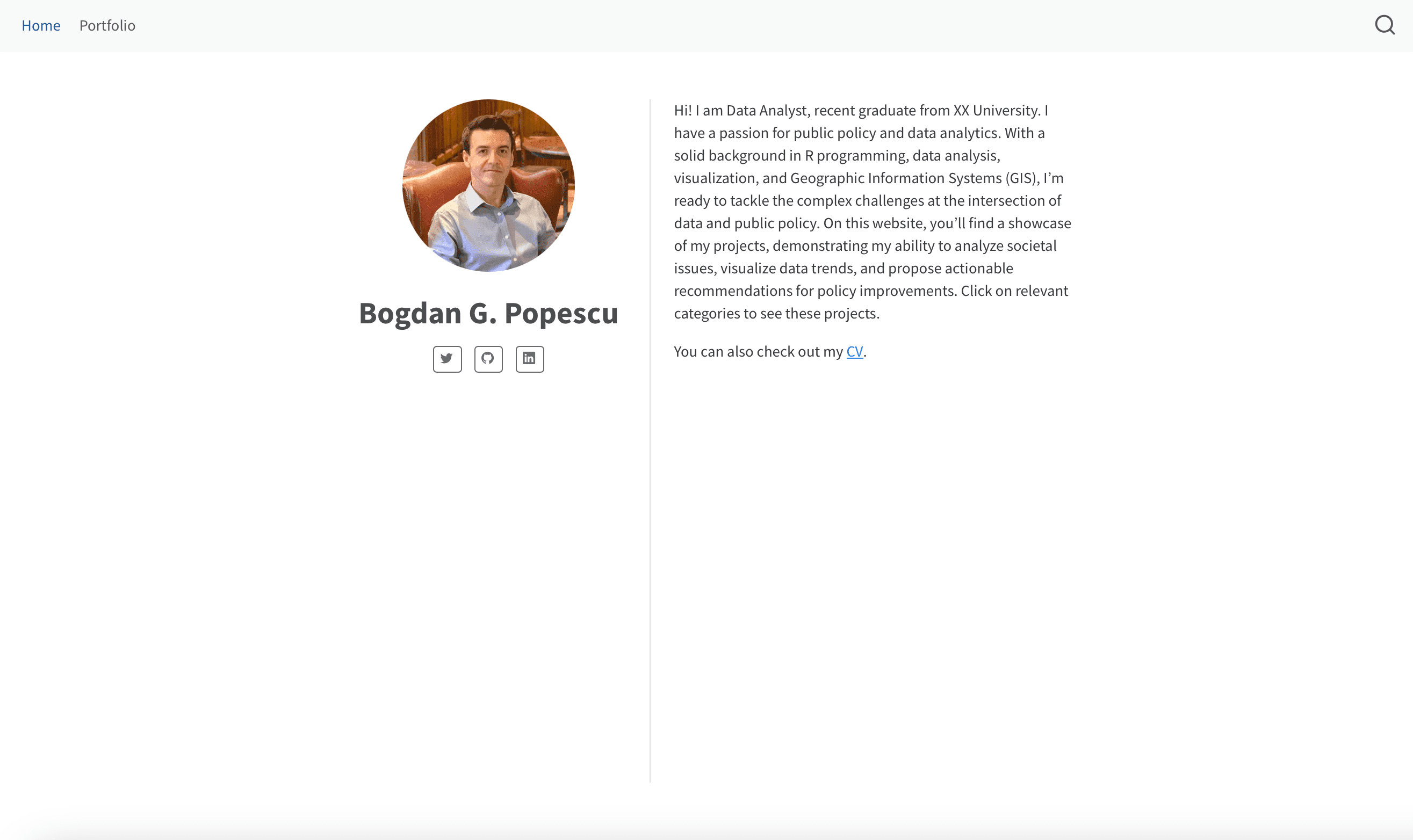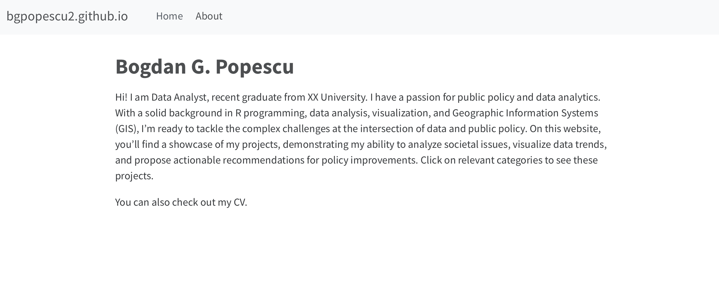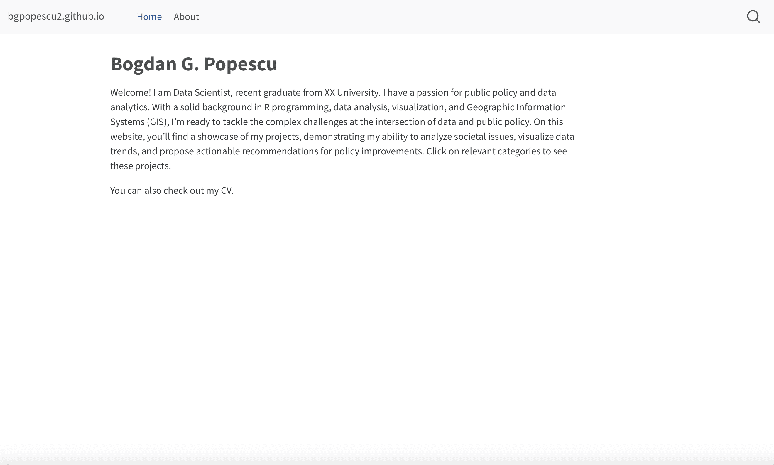 Hi! I am Data Analyst, recent graduate from XX University. I have a passion for public policy and data analytics. With a solid background in R programming, data analysis, visualization, and Geographic Information Systems (GIS), I’m ready to tackle the complex challenges at the intersection of data and public policy. On this website, you’ll find a showcase of my projects, demonstrating my ability to analyze societal issues, visualize data trends, and propose actionable recommendations for policy improvements. Click on relevant categories to see these projects.