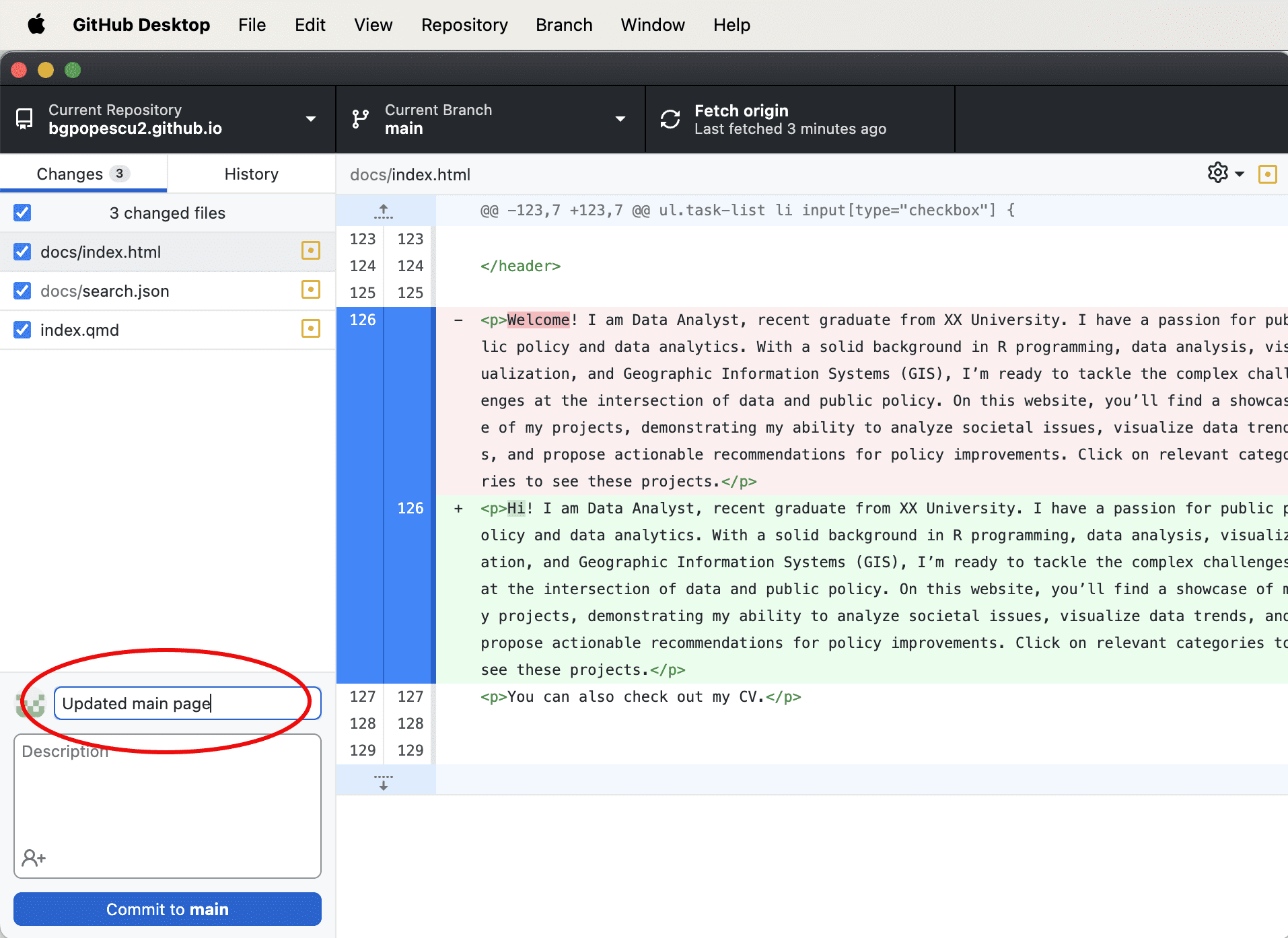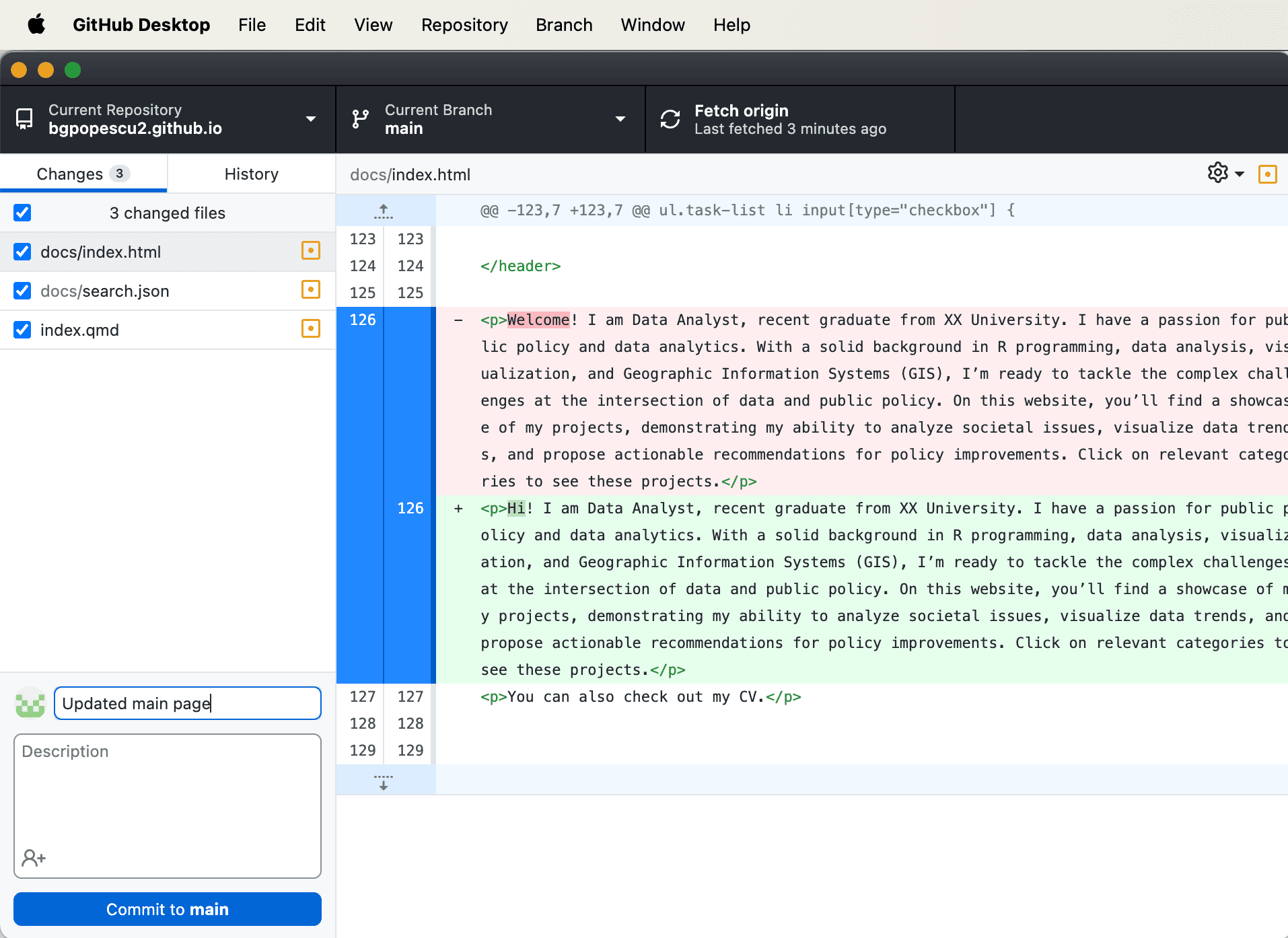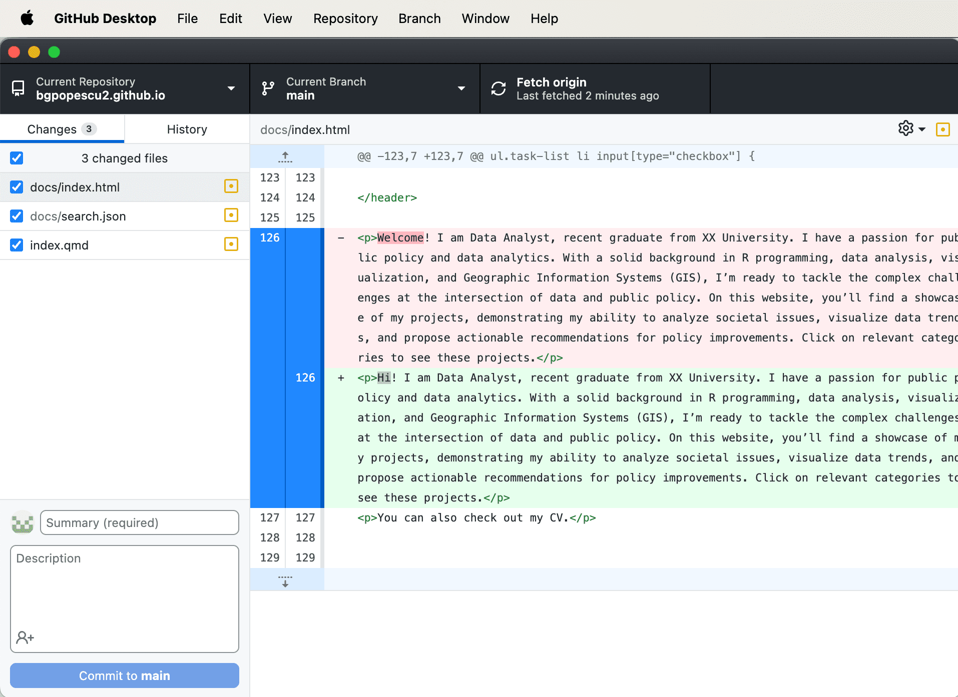 This is what “GitHub Desktop” looks like after making the changes.