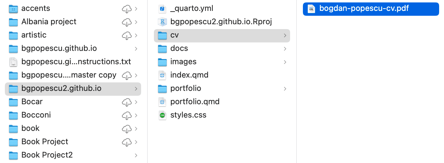The cv folder should have your cv in pdf: this is bogdan-popescu-cv in my case