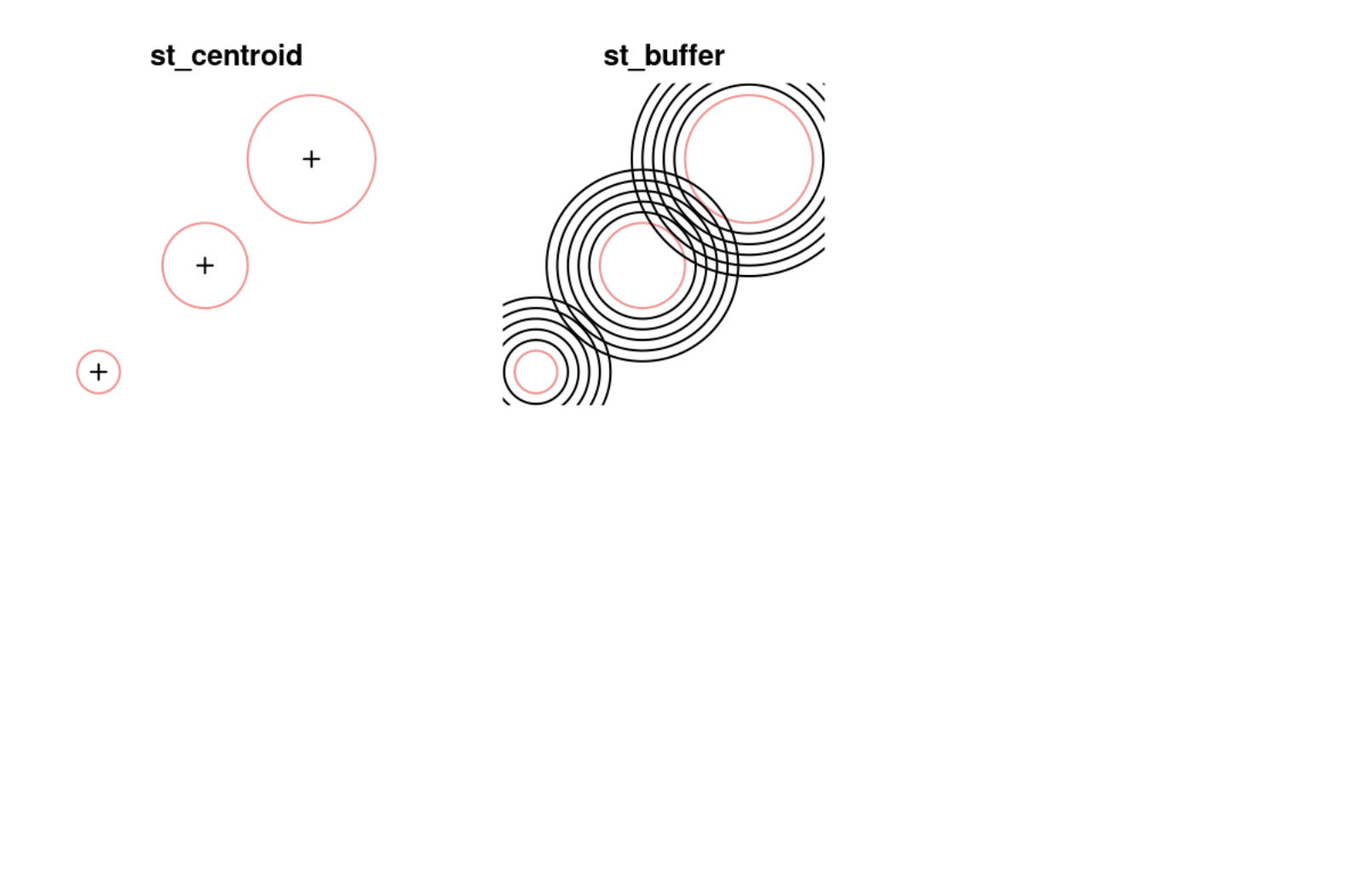 st_buffer calculates buffers - polygons encompassing all points up to the specified distance from a given geometry.