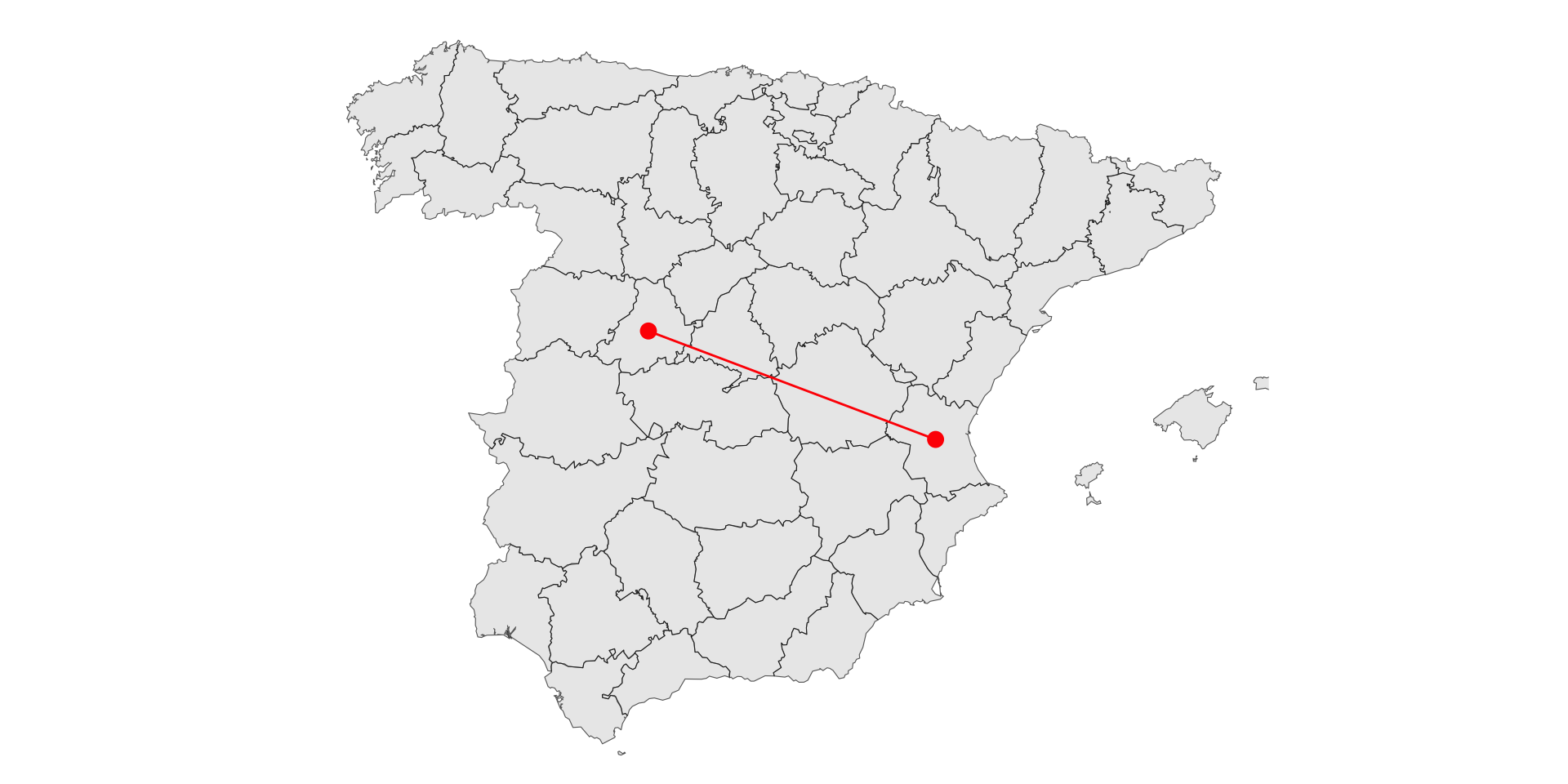 #Step1: Subsetting the citiesavila <-subset(esp1, NAME_2 =='Ávila')valencia <-subset(esp1, NAME_2 =='Valencia')#Step2: Union#This is necessary for later when we use st_combineavila <-st_union(avila)valencia <-st_union(valencia)#Step3: Calculating centroidsavila_ctr =st_centroid(avila)valencia_ctr =st_centroid(valencia)#Step4: Calculating distanced =st_distance(avila_ctr, valencia_ctr)d