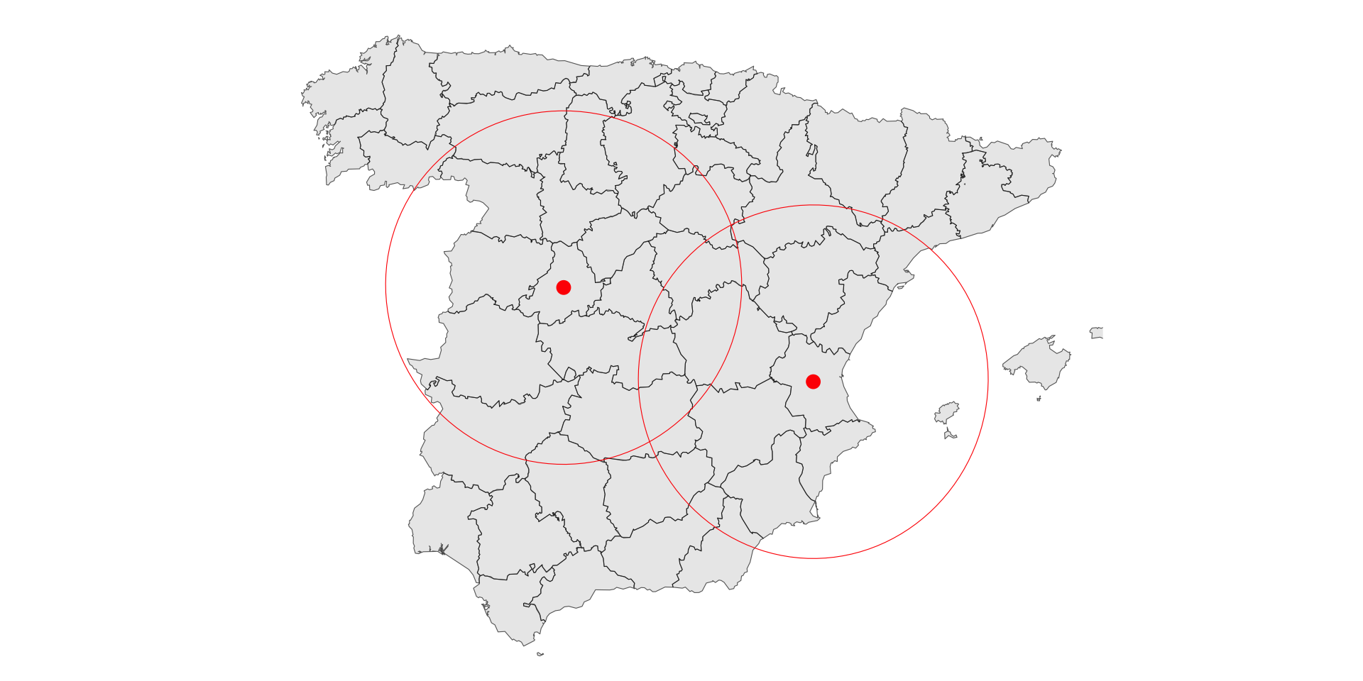 ggplot()+geom_sf(data=esp2)+geom_sf(data=avila_ctr, color ="red", size=3)+geom_sf(data=valencia_ctr, color ="red", size=3)+geom_sf(data=avila_250, color ="red", fill=NA)+geom_sf(data=valencia_250, color ="red", fill=NA)+theme_void() +coord_sf(xlim =c(min_lon_x - error, max_lon_x + error), ylim =c(min_lat_y - error, max_lat_y + error))