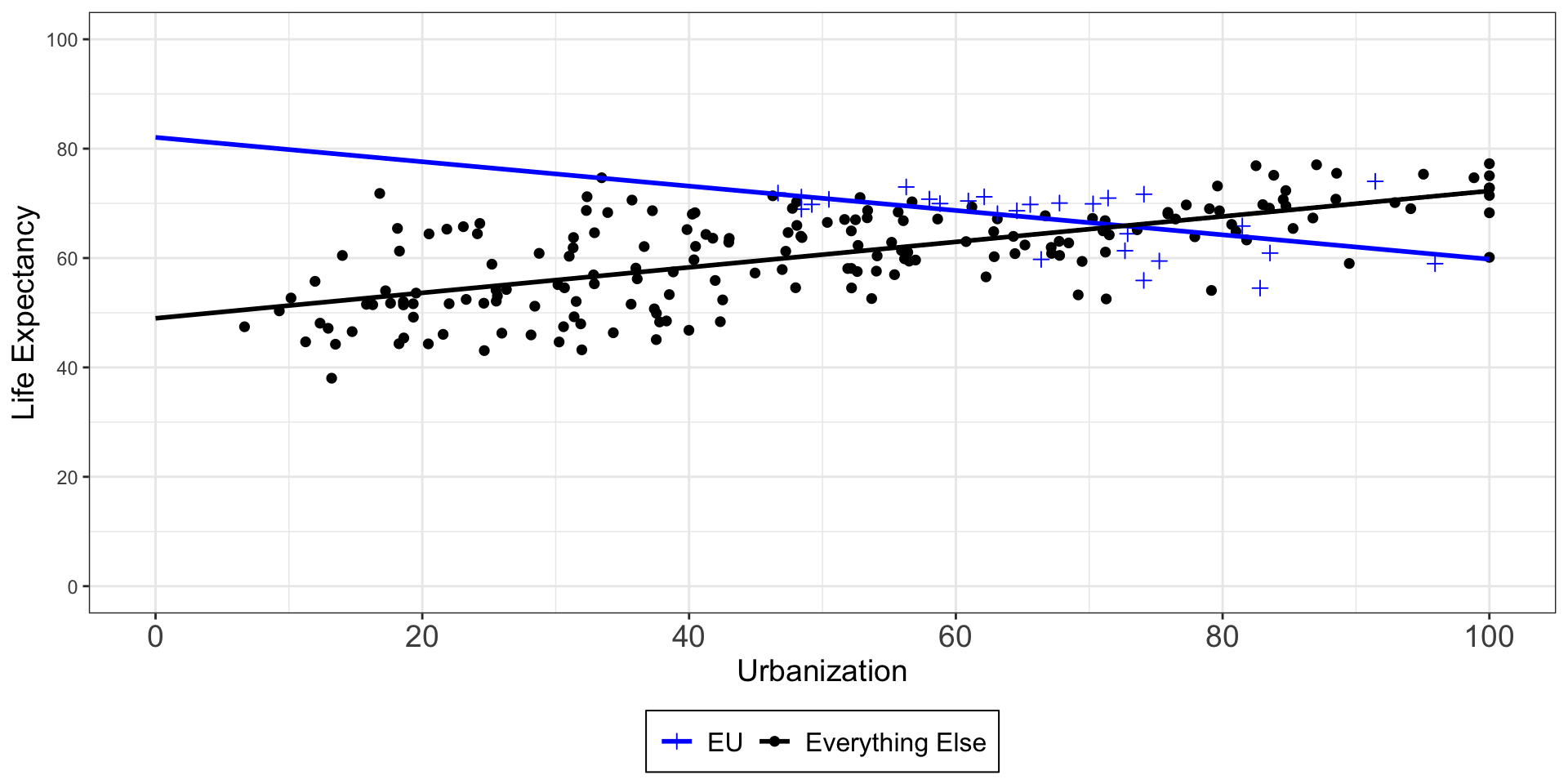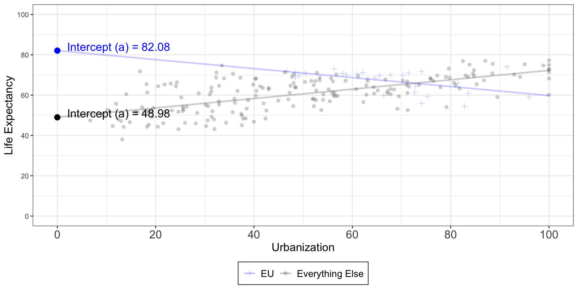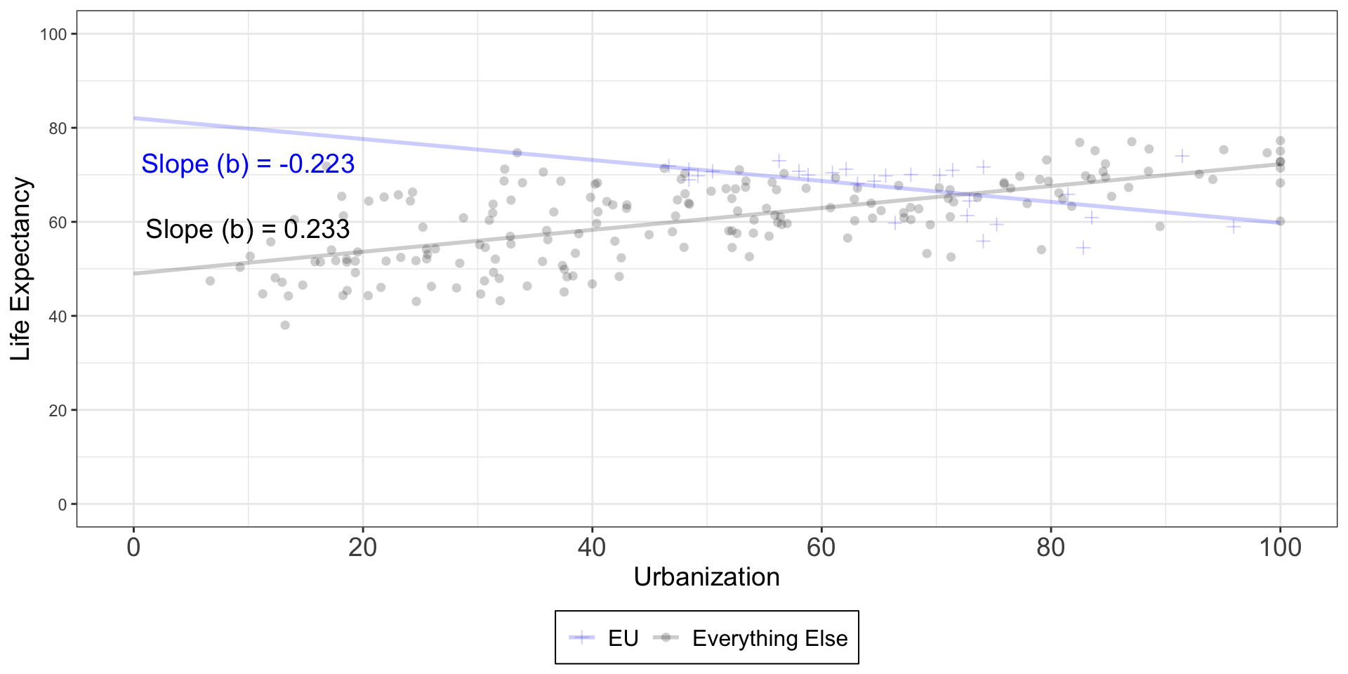 Similarly, EU * urbanization = 48.525 is not the slope for urbanization for the EU, but rather the offset in slope for the EU.