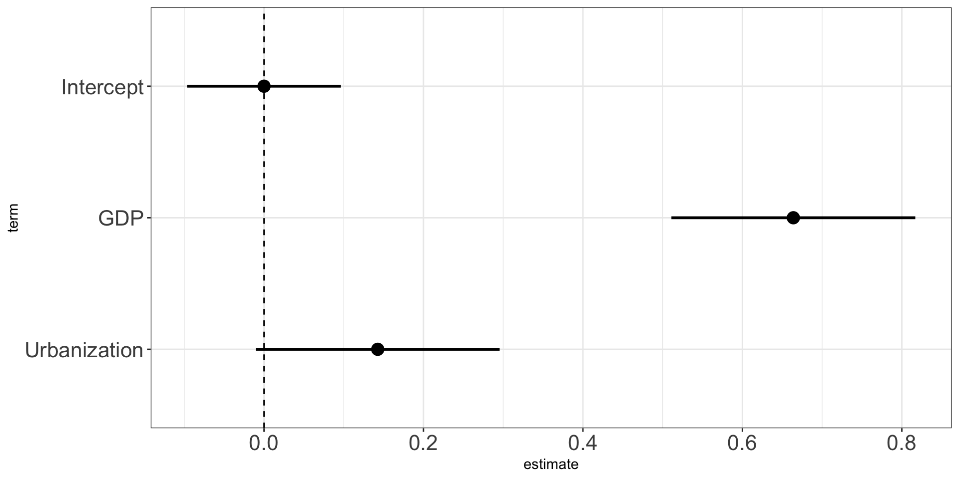 #Step1: To make readable graphs, we need to standardize our coefficients:# Scaling variables means subtracting the mean of the original variable from the raw value and then divide it by the standard deviation of the original variable.x5_b<-lm(scale(life_expectancy)~scale(urb_mean)+scale(log_gdp),data=merged_data3)#Step2: Tyding your coeficientsresults1_b <-tidy(x5_b)cm <-c('scale(urb_mean)'='Urbanization','scale(log_gdp)'='GDP',"(Intercept)"="Intercept")# Ensure the levels of 'term' match the names of cmresults1_b$term <-factor(results1_b$term, levels =names(cm))graph_results1_b <-ggplot(results1_b, aes(x = estimate, y = term)) +geom_point(position =position_dodge(width =0.4), size =4) +geom_errorbar(aes(xmin = estimate -1.96* std.error, xmax = estimate +1.96* std.error), size =1, width =0,position =position_dodge(width =0.4)) +geom_vline(xintercept =0, color ="black", linetype ="dashed") +scale_y_discrete(labels = cm) +theme_bw() +theme(axis.text.x =element_text(size =16),axis.text.y =element_text(size =16),legend.position =c(1, 0),legend.box.background =element_rect(fill ='white'),legend.background =element_blank(),legend.text =element_text(size =16))graph_results1_b