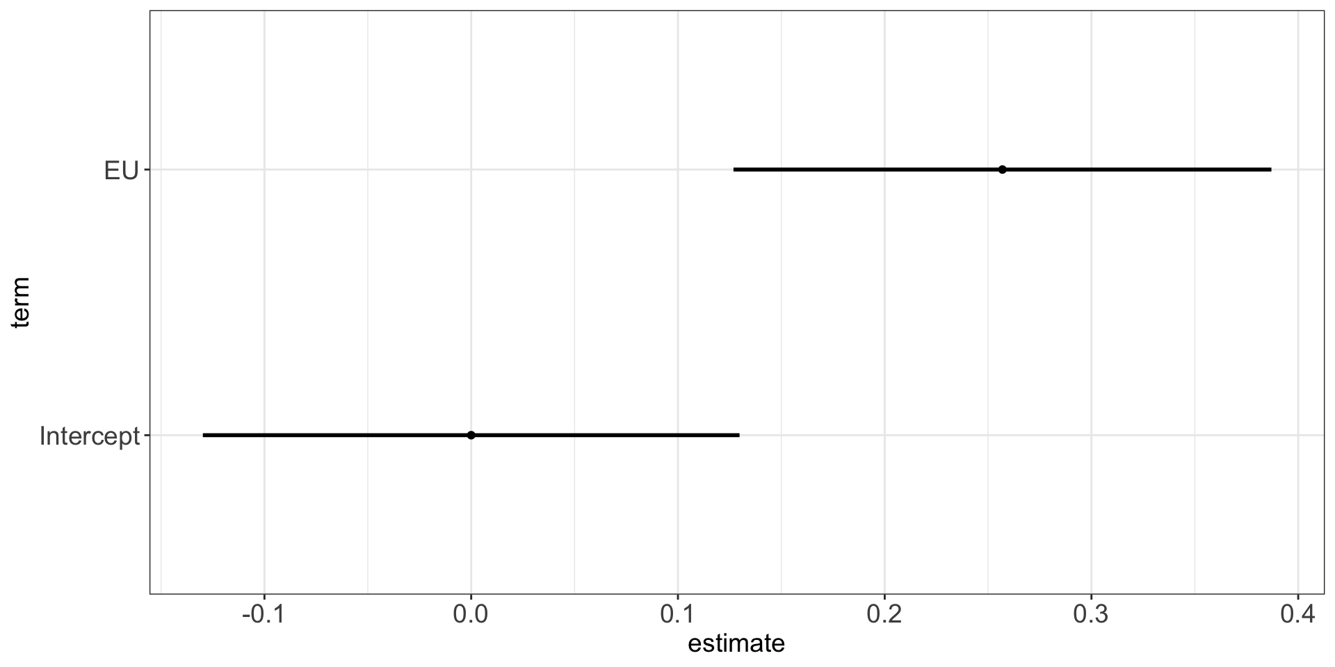 The intercept for the EU countries: the intercept + EU= 48.981 + (-0.456) = 48.525