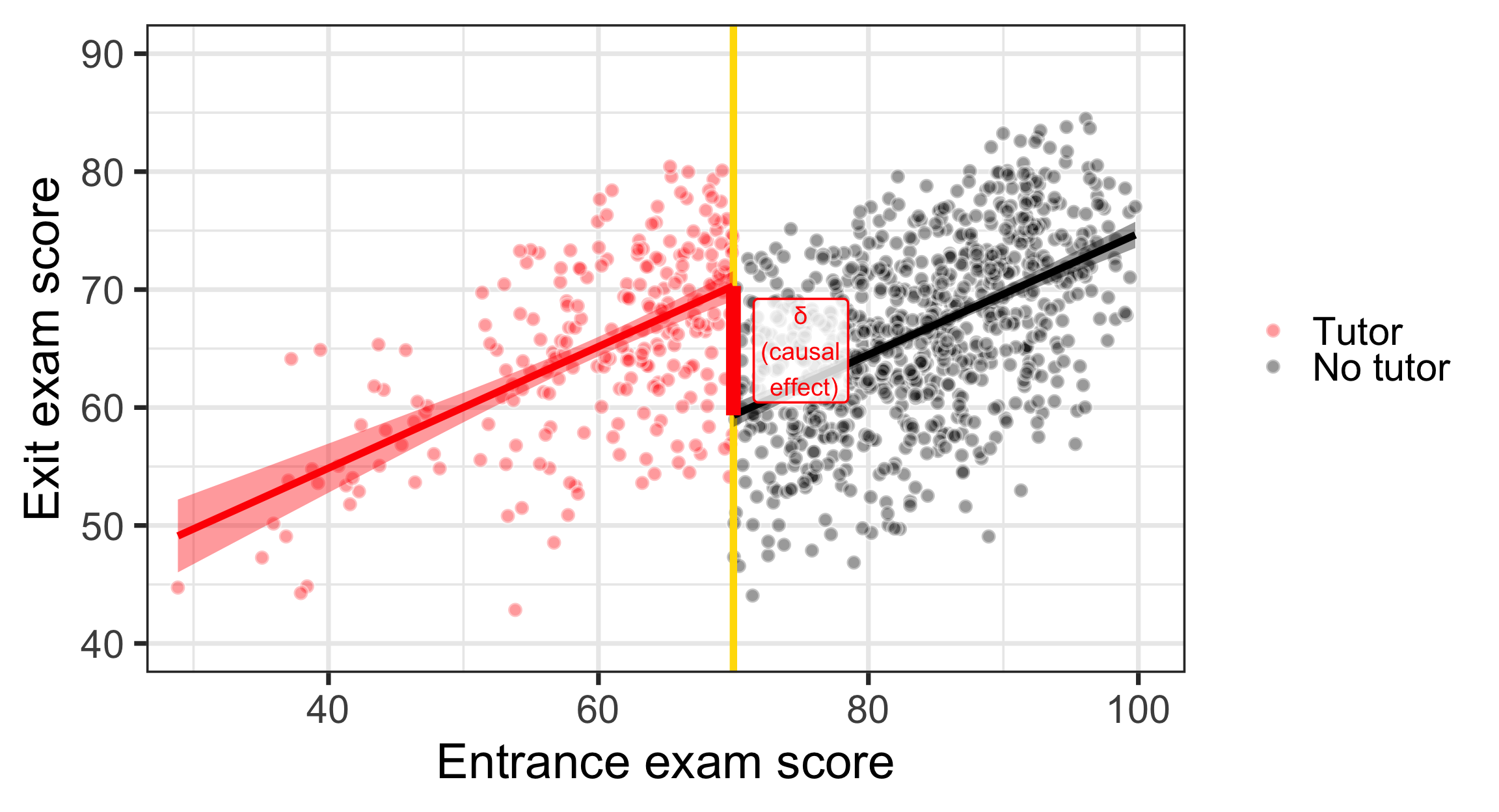 ggplot(tutoring, aes(x = entrance_exam, y = exit_exam, fill = tutoring_text)) +geom_point(size =3, pch =21, color ="white", alpha =0.4) +geom_vline(xintercept =70, size =2, color ="#FFDC00") +labs(x ="Entrance exam score", y ="Exit exam score") +#guides(fill = "none") +guides(fill =guide_legend(reverse =TRUE)) +geom_smooth(data =filter(tutoring, entrance_exam <=70),method ="lm",color="red",#aes(color = tutoring_text),size =2, show.legend =FALSE) +geom_smooth(data =filter(tutoring, entrance_exam >70),method ="lm", color="black",#aes(color = tutoring_text),size =2, show.legend =FALSE) +scale_fill_manual(values =c("black", "red"), name =NULL) +scale_color_manual(values =c("black", "red")) +theme_bw(base_size =28)+annotate(geom ="segment", x =70, xend =70, y = effect_control, yend = effect_treatment,size =4, color ="red") +annotate(geom ="label", x =75, y = effect_treatment - (late /2),label ="δ\n(causal\n effect)",size=5,color ="red", fill =alpha(c("white"),0.8))+coord_cartesian(xlim =c(30, 100), ylim =c(40, 90))