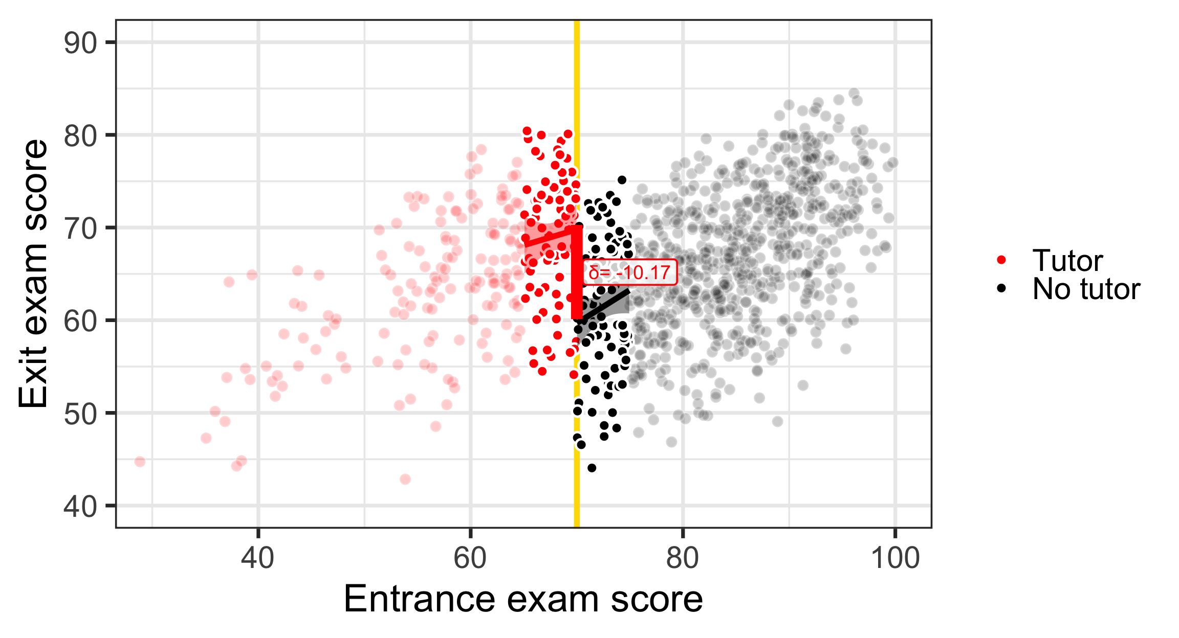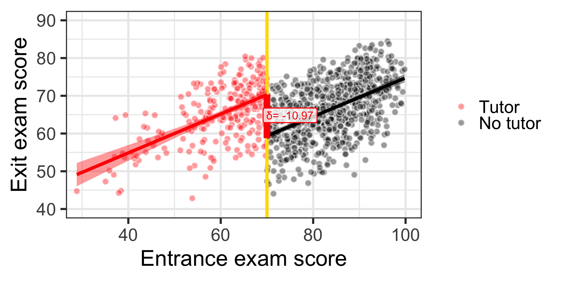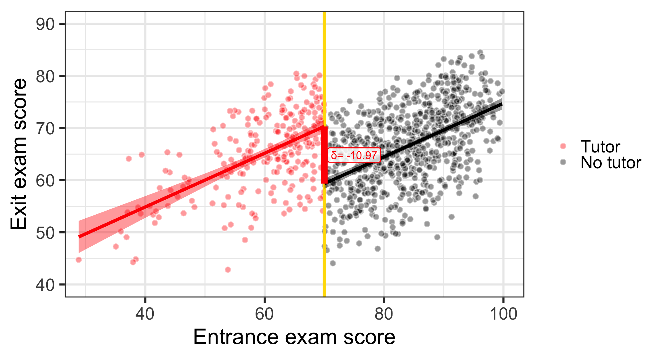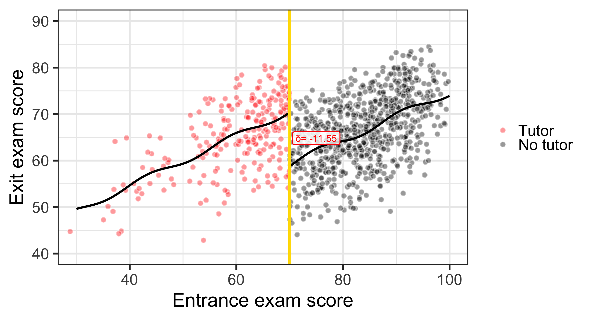 program_data <- tutoring %>%mutate(entrance_centered = entrance_exam -70)model1 <-lm(exit_exam ~ entrance_centered + tutoring,data = program_data)x<-tidy(model1)late<-round(x$estimate[x$term=="tutoringFALSE"],2)const<-round(x$estimate[x$term=="(Intercept)"],2)ggplot(tutoring, aes(x = entrance_exam, y = exit_exam, fill = tutoring_text)) +geom_point(size =3, pch =21, color ="white", alpha =0.4) +geom_vline(xintercept =70, size =2, color ="#FFDC00") +labs(x ="Entrance exam score", y ="Exit exam score") +#guides(fill = "none") +guides(fill =guide_legend(reverse =TRUE)) +geom_smooth(data =filter(tutoring, entrance_exam <=70),method ="lm",color="red",#aes(color = tutoring_text),size =2, show.legend =FALSE) +geom_smooth(data =filter(tutoring, entrance_exam >70),method ="lm", color="black",#aes(color = tutoring_text),size =2, show.legend =FALSE) +scale_fill_manual(values =c("black", "red"), name =NULL) +scale_color_manual(values =c("black", "red")) +theme_bw(base_size =28)+annotate(geom ="segment", x =70, xend =70, y = effect_control, yend = effect_treatment,size =4, color ="red") +annotate(geom ="label", x =75, y = const + (late /2),label =paste("δ=", late),size=5,color ="red", fill =alpha(c("white"),0.8))+coord_cartesian(xlim =c(30, 100), ylim =c(40, 90))
