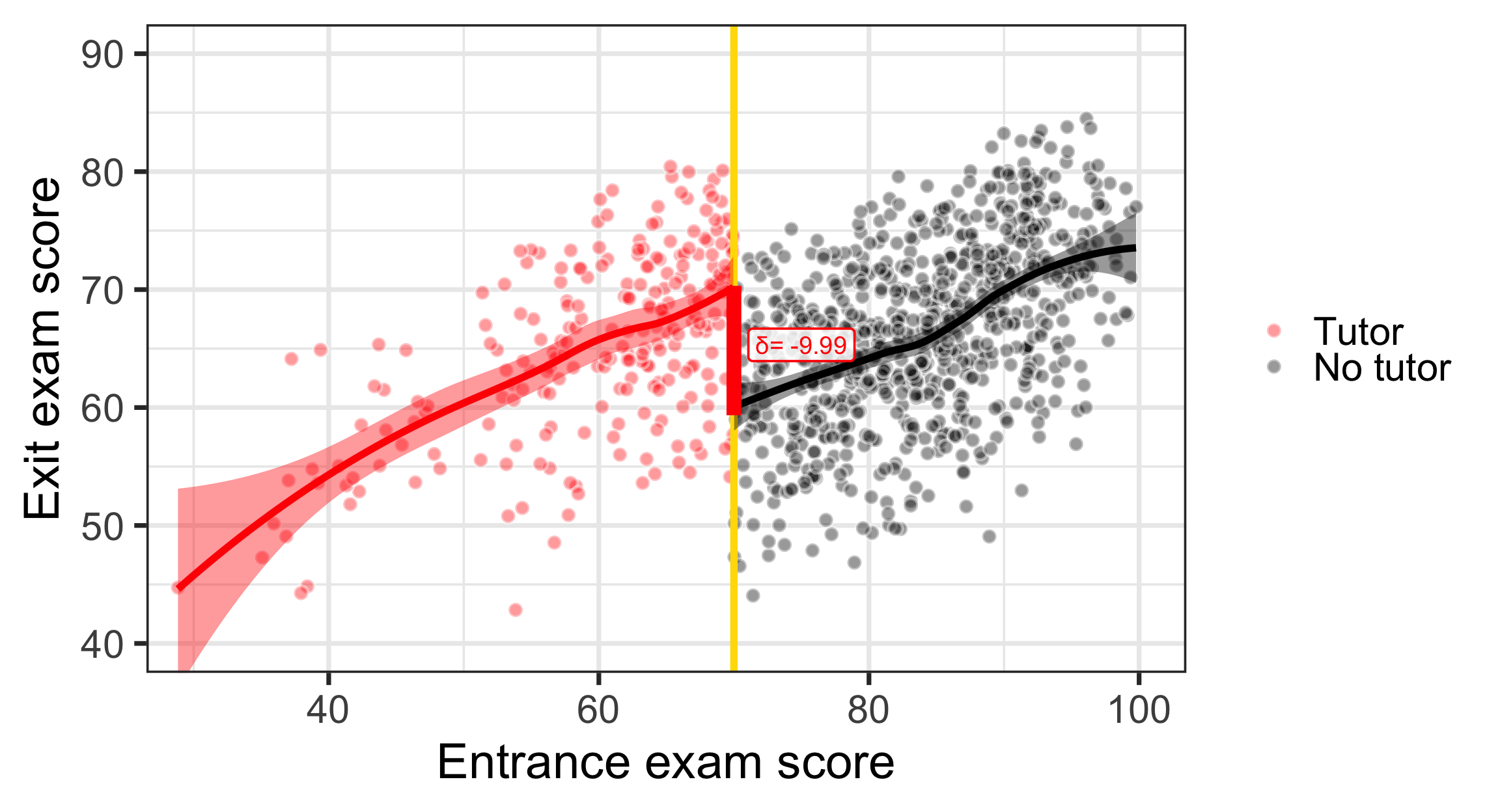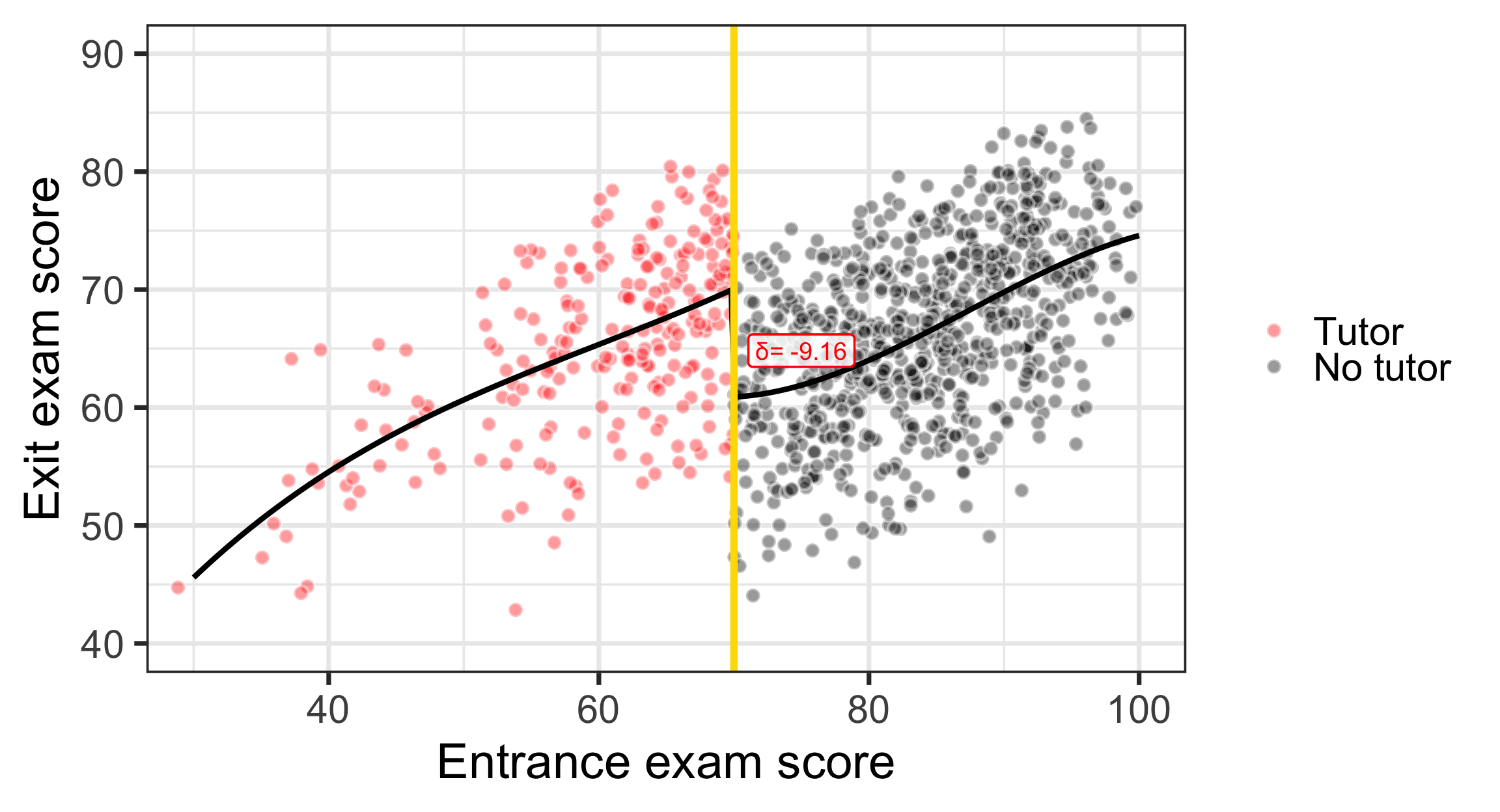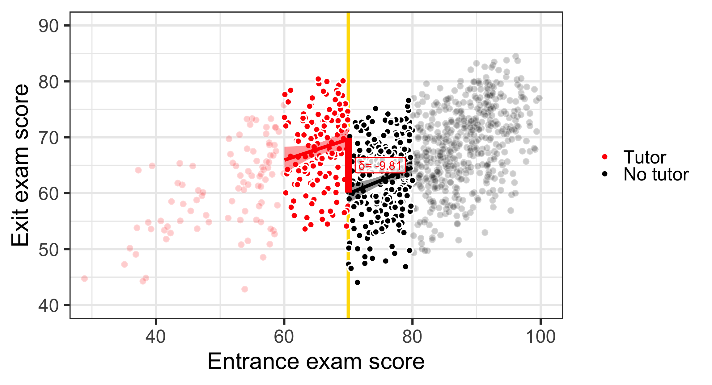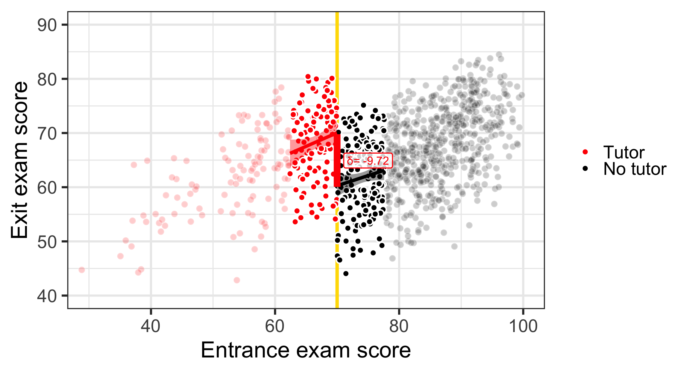 program_data <- tutoring %>%mutate(entrance_centered = entrance_exam -70)model1 <-lm(exit_exam ~ entrance_centered + tutoring,data = program_data)x<-tidy(model1)late<-round(x$estimate[x$term=="tutoringFALSE"],2)const<-round(x$estimate[x$term=="(Intercept)"],2)ggplot(tutoring, aes(x = entrance_exam, y = exit_exam, fill = tutoring_text)) +geom_point(size =3, pch =21, color ="white", alpha =0.4) +geom_vline(xintercept =70, size =2, color ="#FFDC00") +labs(x ="Entrance exam score", y ="Exit exam score") +#guides(fill = "none") +guides(fill =guide_legend(reverse =TRUE)) +geom_smooth(data =filter(tutoring, entrance_exam <=70),method ="lm",color="red",#aes(color = tutoring_text),size =2, show.legend =FALSE) +geom_smooth(data =filter(tutoring, entrance_exam >70),method ="lm", color="black",#aes(color = tutoring_text),size =2, show.legend =FALSE) +scale_fill_manual(values =c("black", "red"), name =NULL) +scale_color_manual(values =c("black", "red")) +theme_bw(base_size =28)+annotate(geom ="segment", x =70, xend =70, y = effect_control, yend = effect_treatment,size =4, color ="red") +annotate(geom ="label", x =75, y = const + (late /2),label =paste("δ=", late),size=5,color ="red", fill =alpha(c("white"),0.8))+coord_cartesian(xlim =c(30, 100), ylim =c(40, 90))