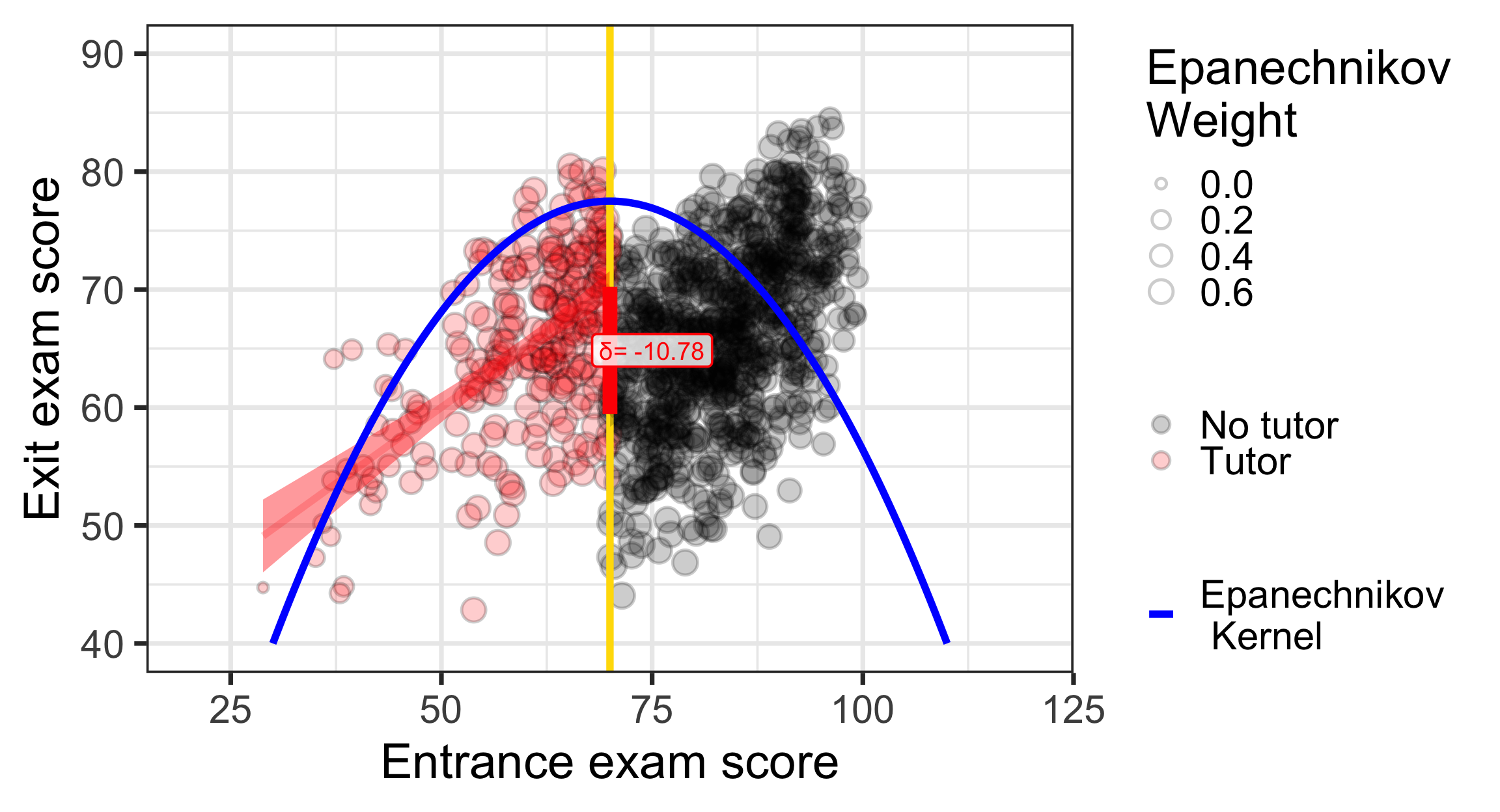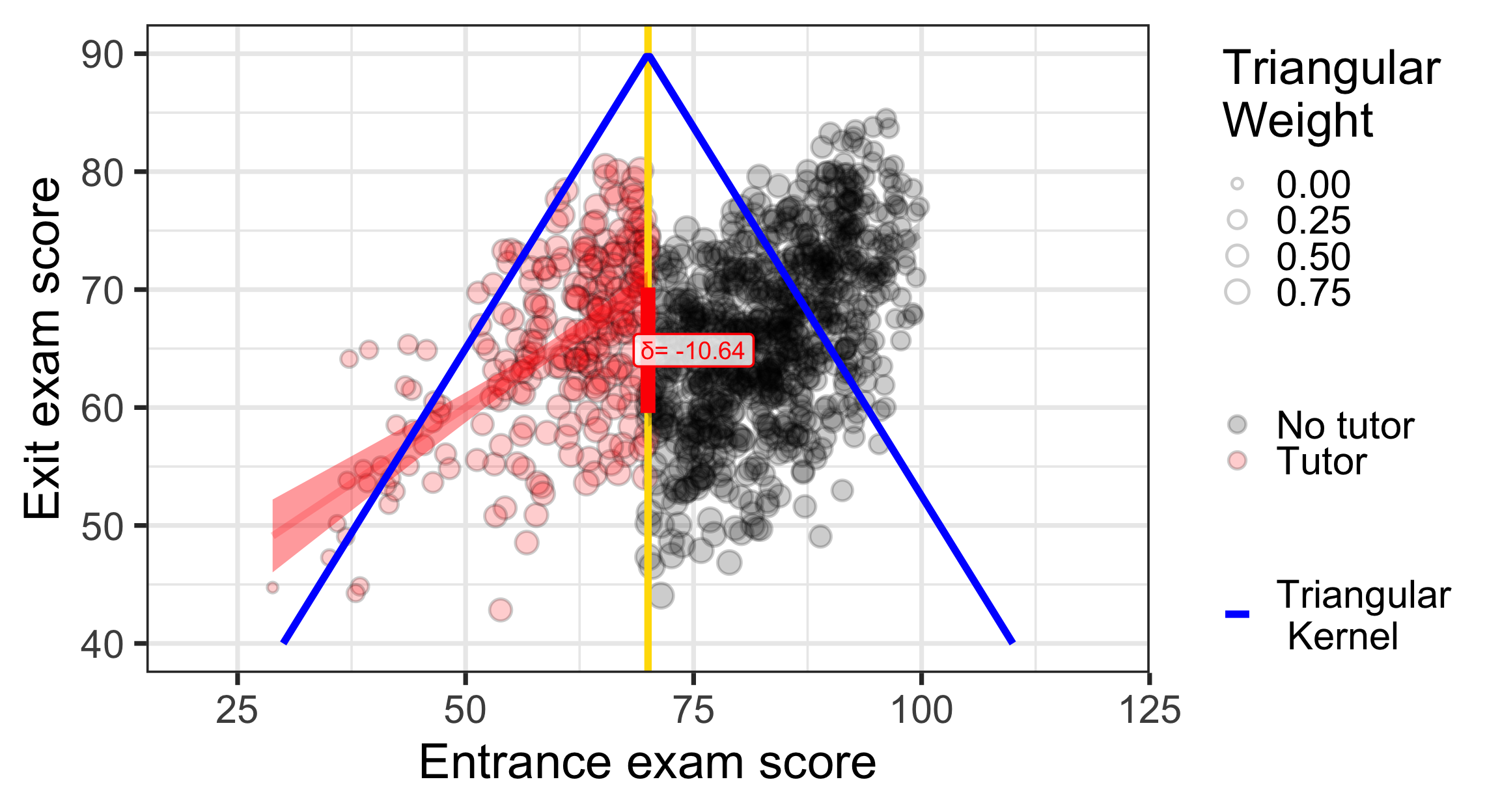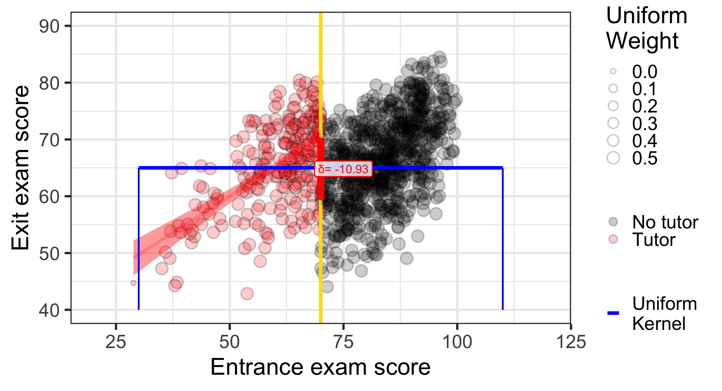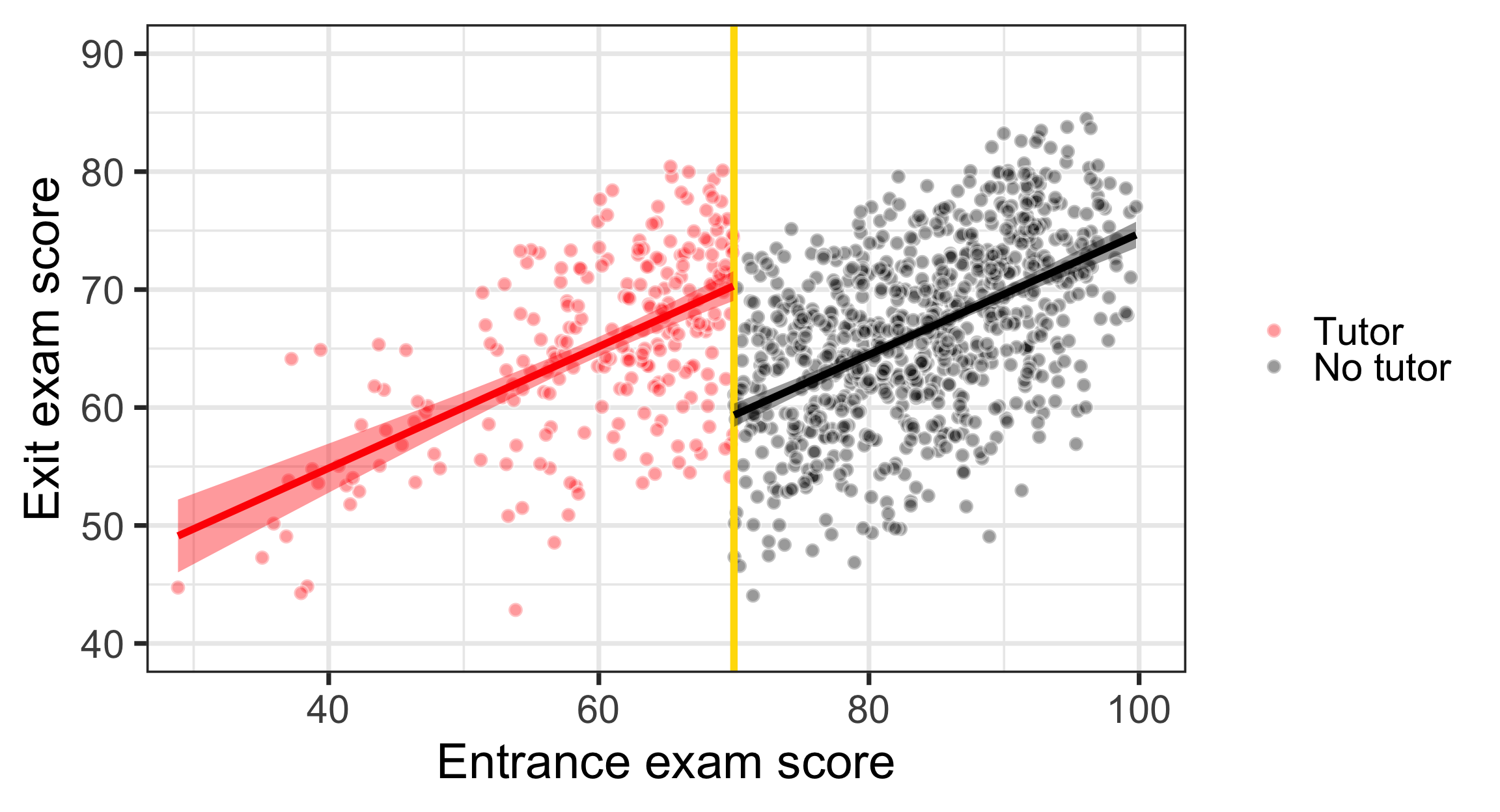 program_data <- tutoring %>%mutate(entrance_centered = entrance_exam -70)model1 <-lm(exit_exam ~ entrance_centered + tutoring,data = program_data)x<-tidy(model1)late<-round(x$estimate[x$term=="tutoringFALSE"],2)const<-round(x$estimate[x$term=="(Intercept)"],2)ggplot(tutoring, aes(x = entrance_exam, y = exit_exam, fill = tutoring_text)) +geom_point(size =3, pch =21, color ="white", alpha =0.4) +geom_vline(xintercept =70, size =2, color ="#FFDC00") +labs(x ="Entrance exam score", y ="Exit exam score") +#guides(fill = "none") +guides(fill =guide_legend(reverse =TRUE)) +geom_smooth(data =filter(tutoring, entrance_exam <=70),method ="lm",color="red",#aes(color = tutoring_text),size =2, show.legend =FALSE) +geom_smooth(data =filter(tutoring, entrance_exam >70),method ="lm", color="black",#aes(color = tutoring_text),size =2, show.legend =FALSE) +scale_fill_manual(values =c("black", "red"), name =NULL) +scale_color_manual(values =c("black", "red")) +theme_bw(base_size =28)+annotate(geom ="segment", x =70, xend =70, y = effect_control, yend = effect_treatment,size =4, color ="red") +annotate(geom ="label", x =75, y = const + (late /2),label =paste("δ=", late),size=5,color ="red", fill =alpha(c("white"),0.8))+coord_cartesian(xlim =c(30, 100), ylim =c(40, 90))