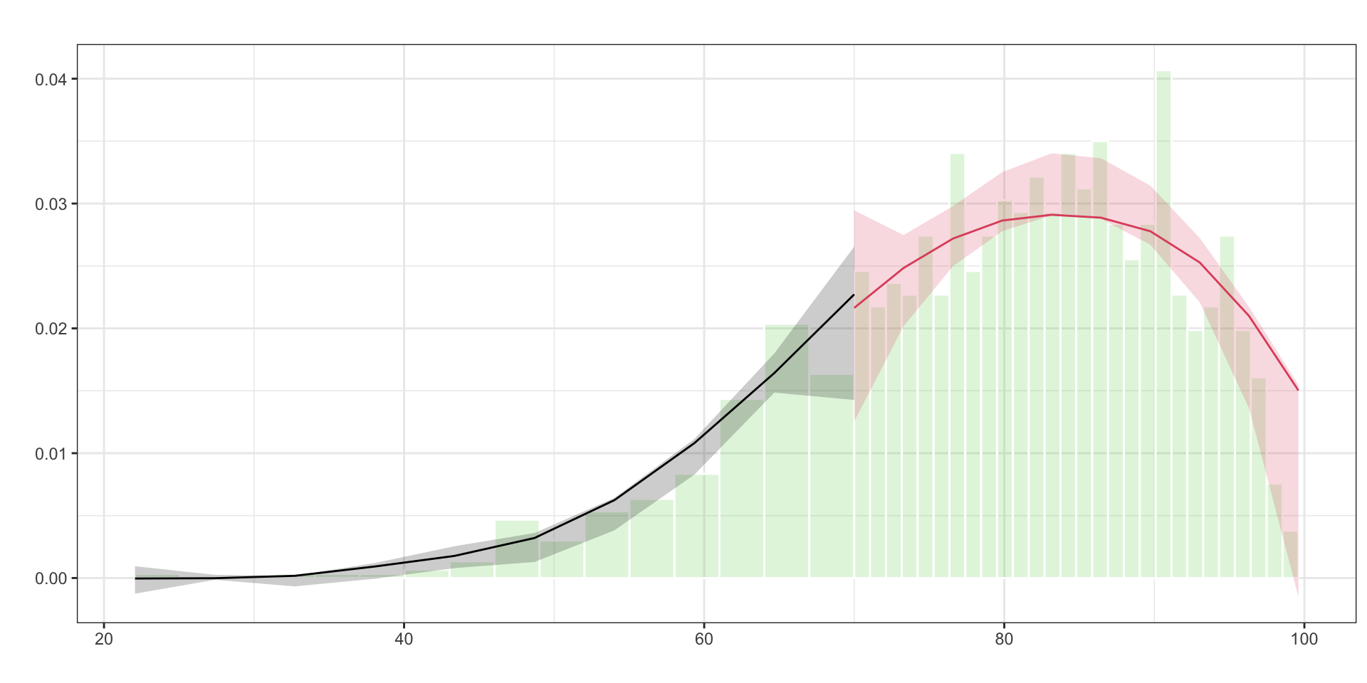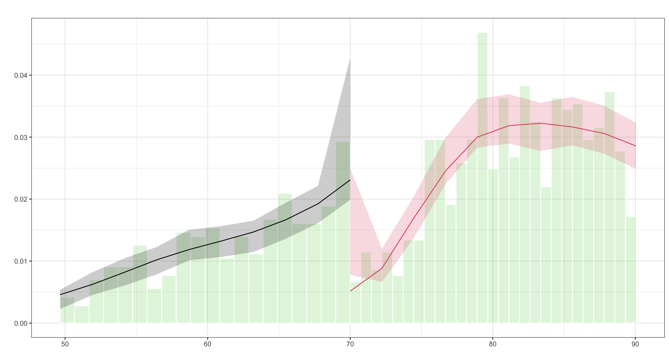 set.seed(123) # for reproducibilitynum_students <-1500# a bit more to have room for thinningtutoring2 <-tibble(id =1:num_students,entrance_exam =rbeta(num_students, shape1 =7, shape2 =2),exit_exam =rbeta(num_students, shape1 =5, shape2 =3)) |>mutate(entrance_exam = entrance_exam *100) |># 🔥 Add manipulation: fewer people just above the cutofffilter(!(entrance_exam >70& entrance_exam <75&runif(n()) <0.5)) |># randomly drop 50% just above cutoffmutate(# Assignmenttutoring_assignment = entrance_exam <=70,# Fuzzy compliancetutoring_fuzzy =case_when( tutoring_assignment &runif(n()) <0.85~TRUE,!tutoring_assignment &runif(n()) <0.15~TRUE,TRUE~FALSE ),# Outcomeexit_exam = exit_exam *40+10* tutoring_fuzzy + entrance_exam /2,# Labelstutoring_text =factor(tutoring_assignment, levels =c(FALSE, TRUE), labels =c("No tutor", "Tutor")),tutoring_fuzzy_text =factor(tutoring_fuzzy, levels =c(FALSE, TRUE), labels =c("No tutor", "Tutor")),entrance_centered = entrance_exam -70 )library(rddensity)mtest <-rddensity(X = tutoring2$entrance_exam, c=70)man<-rdplotdensity(mtest,X = tutoring2$entrance_exam)$Estplot+geom_vline(xintercept=70, linetype="dashed") +labs(x="Entrance exam score", y="Density")