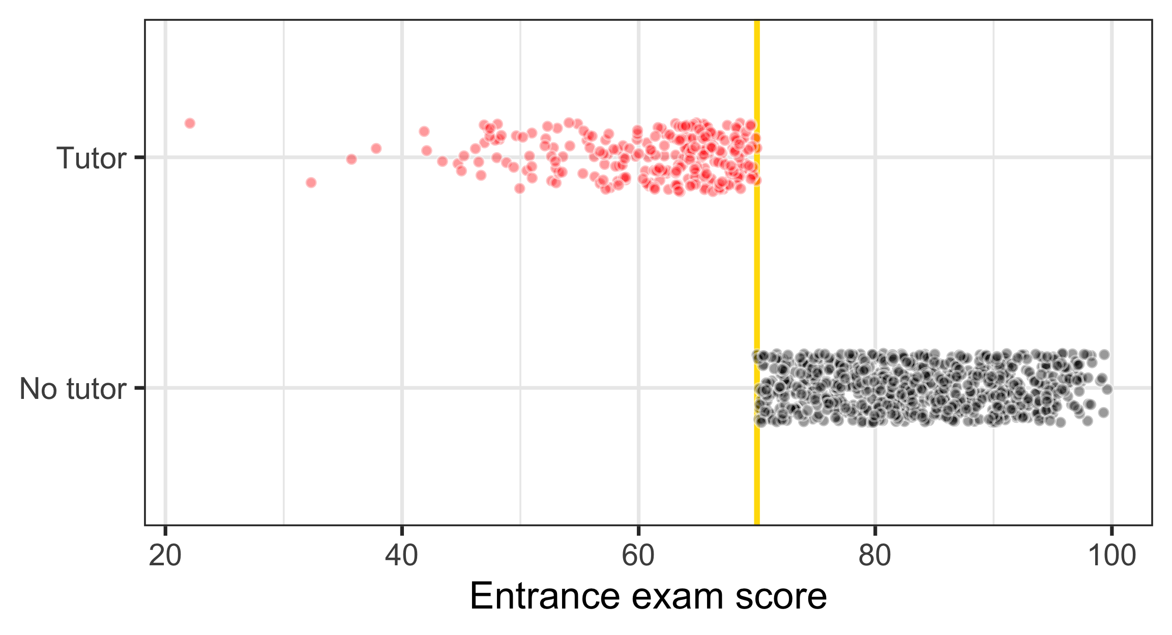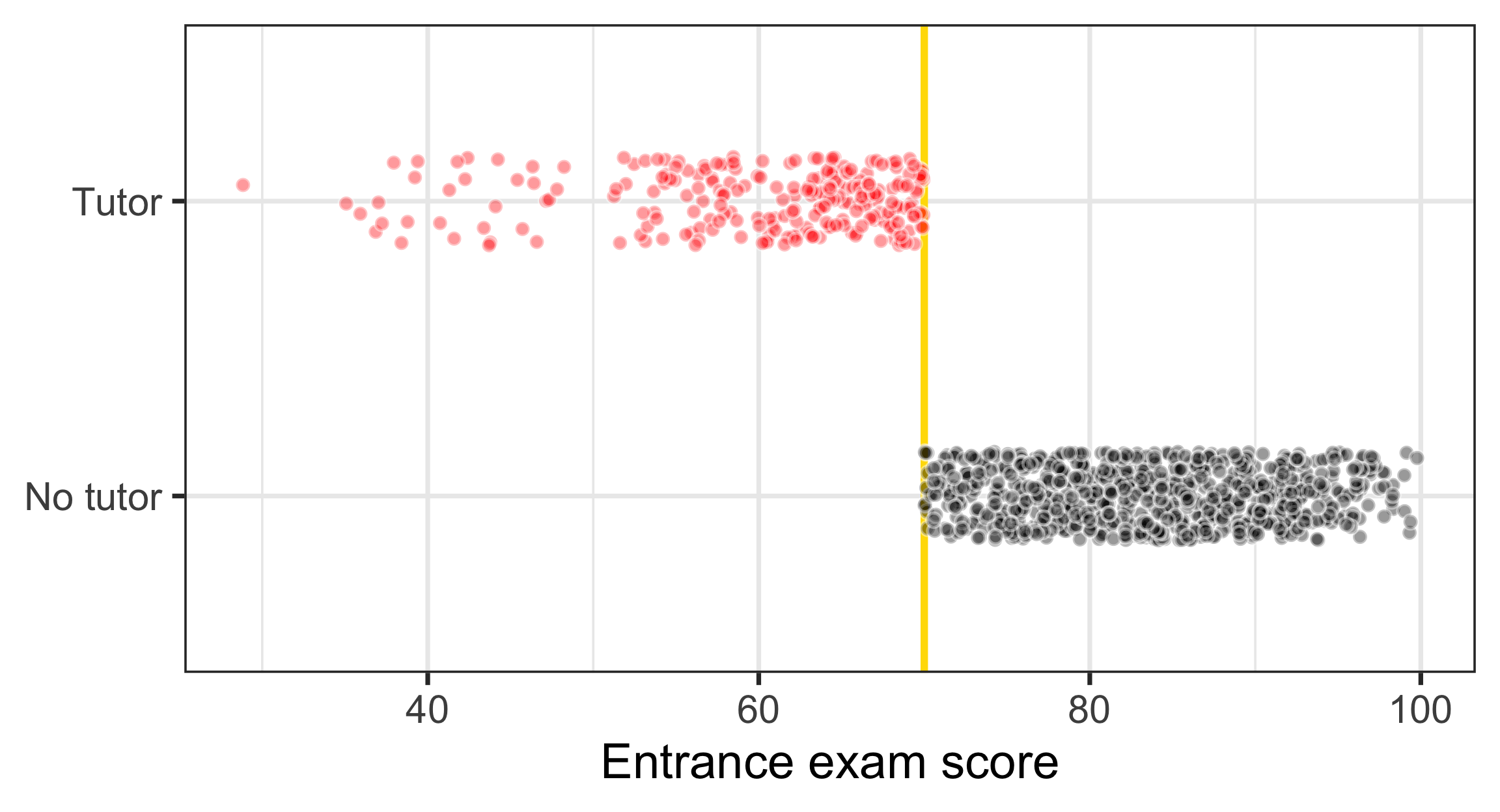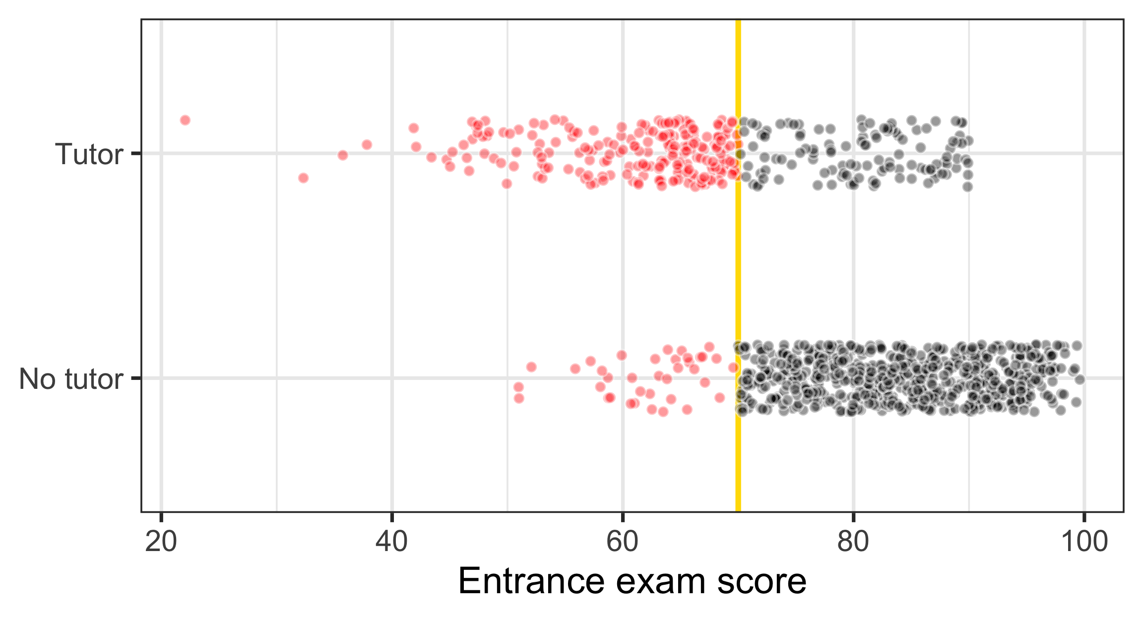 ggplot(tutoring, aes(x = entrance_exam, y = tutoring_text, fill = tutoring_text)) +geom_vline(xintercept =70, linewidth =2, color ="#FFDC00") +geom_point(size =3, pch =21, color ="white", alpha =0.4,position =position_jitter(width =0, height =0.15, seed =1234)) +labs(x ="Entrance exam score", y =NULL) +guides(fill ="none") +scale_fill_manual(values =c("black", "red"), name =NULL) +theme_bw(base_size =28)
