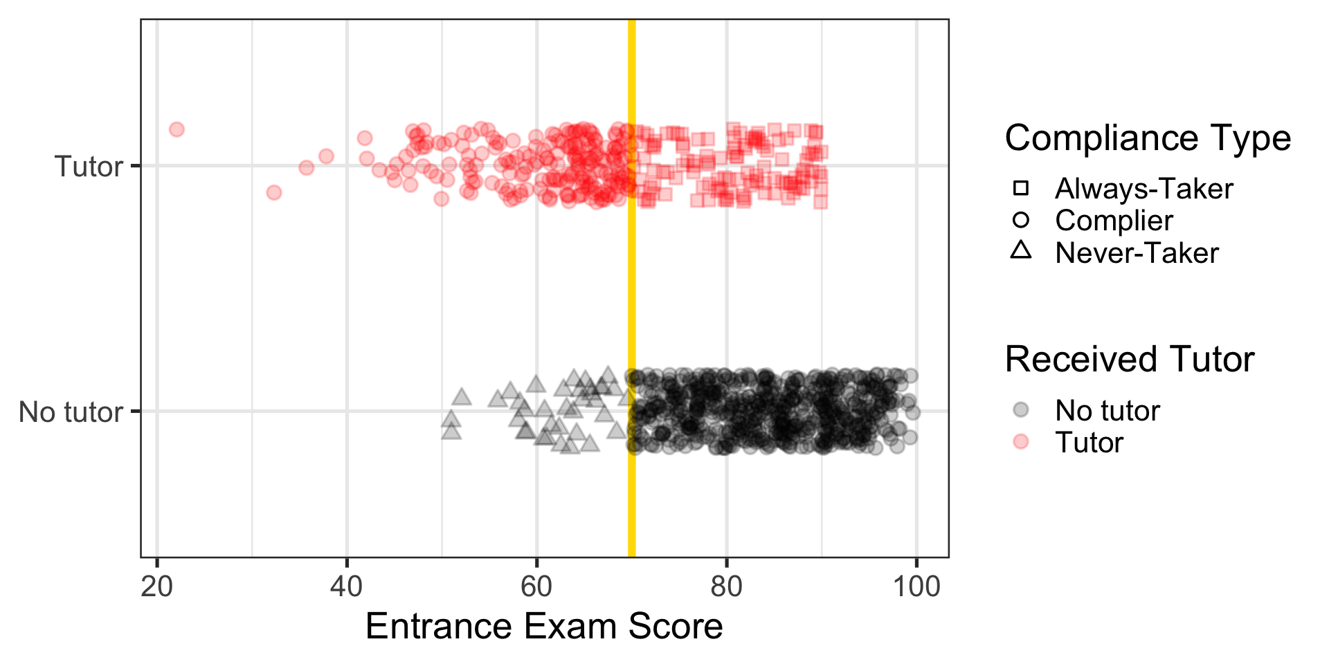 ggplot(tutoring, aes(x = entrance_exam, y = tutoring_text, fill = tutoring_text)) +geom_vline(xintercept =70, linewidth =2, color ="#FFDC00") +annotate(geom ="rect", fill ="grey50", alpha =0.25, ymin =-Inf, ymax =Inf,xmin =70-5, xmax =70+5) +annotate(geom ="rect", fill ="grey50", alpha =0.5, ymin =-Inf, ymax =Inf,xmin =70-2, xmax =70+2) +geom_point(size =3, pch =21, color ="white", alpha =0.4,position =position_jitter(width =0, height =0.15, seed =1234)) +labs(x ="Entrance exam score", y =NULL) +guides(fill ="none") +scale_fill_manual(values =c("black", "red"), name =NULL) +theme_bw(base_size =28)