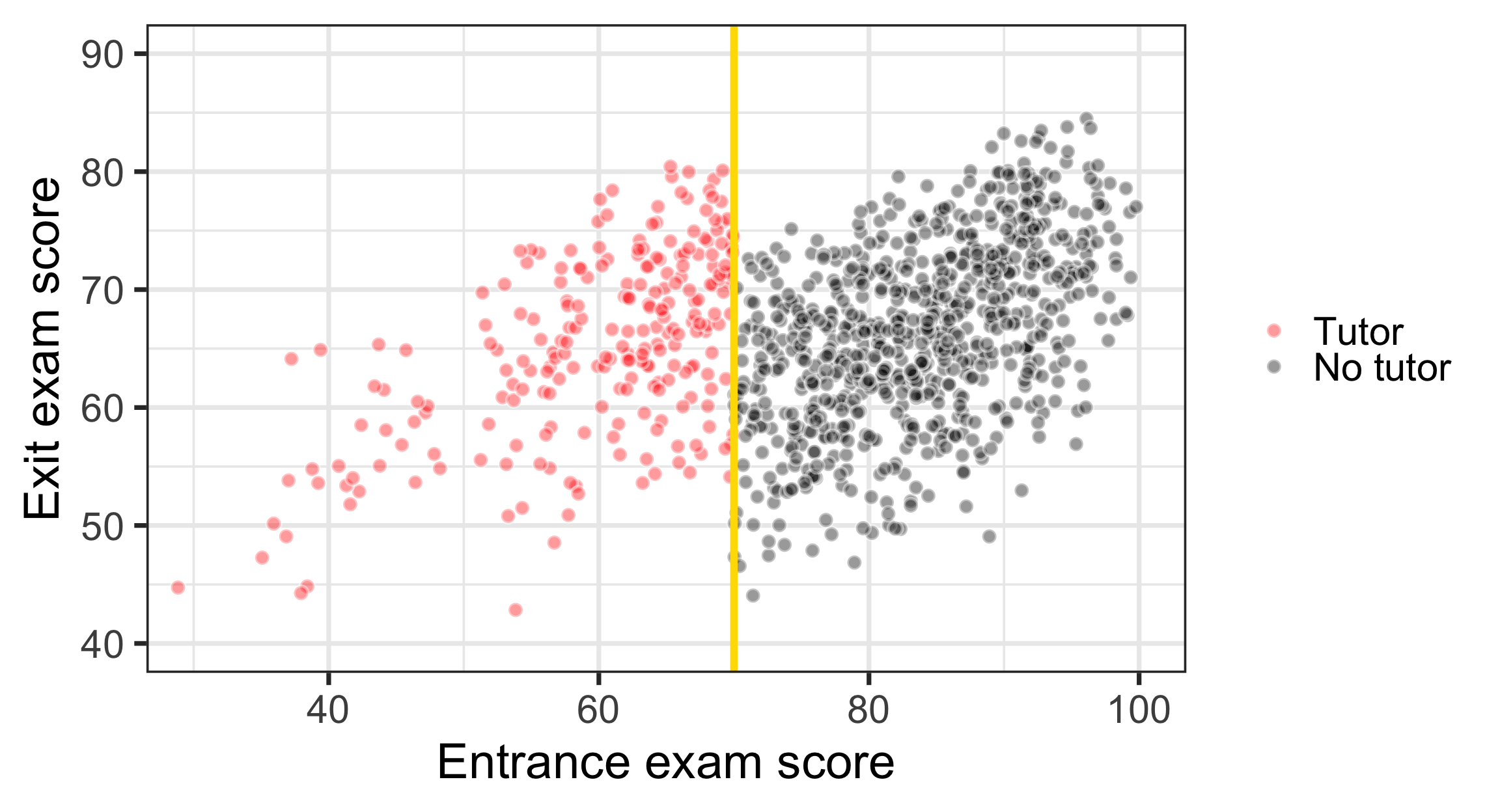 ggplot(tutoring, aes(x = entrance_exam, y = exit_exam, fill = tutoring_text)) +geom_point(size =3, pch =21, color ="white", alpha =0.4)+geom_vline(xintercept =70, size =2, color ="#FFDC00") +labs(x ="Entrance exam score", y ="Exit exam score") +#guides(fill = "none") +guides(fill =guide_legend(reverse =TRUE)) +scale_fill_manual(values =c("black", "red"), name =NULL) +theme_bw(base_size =28)+coord_cartesian(xlim =c(30, 100),ylim =c(40, 90))