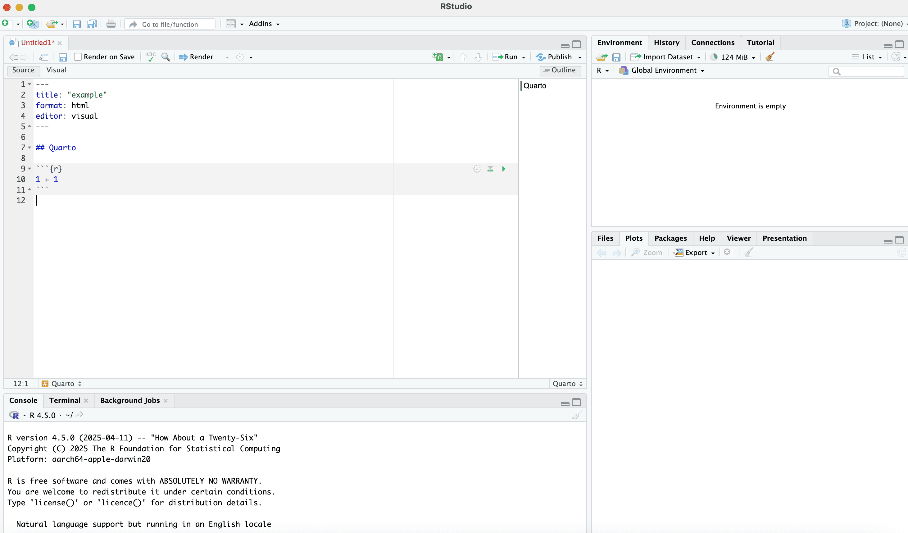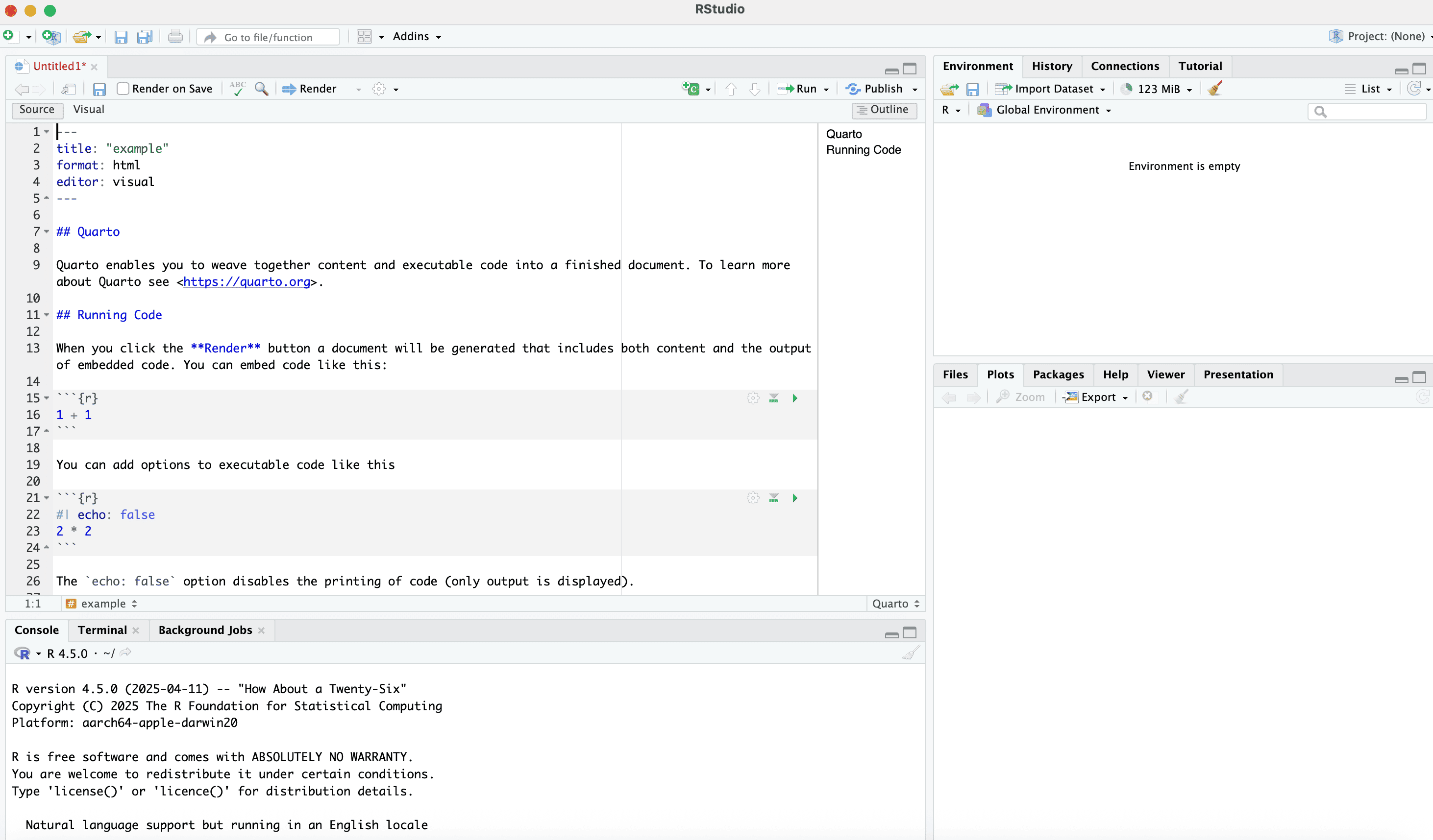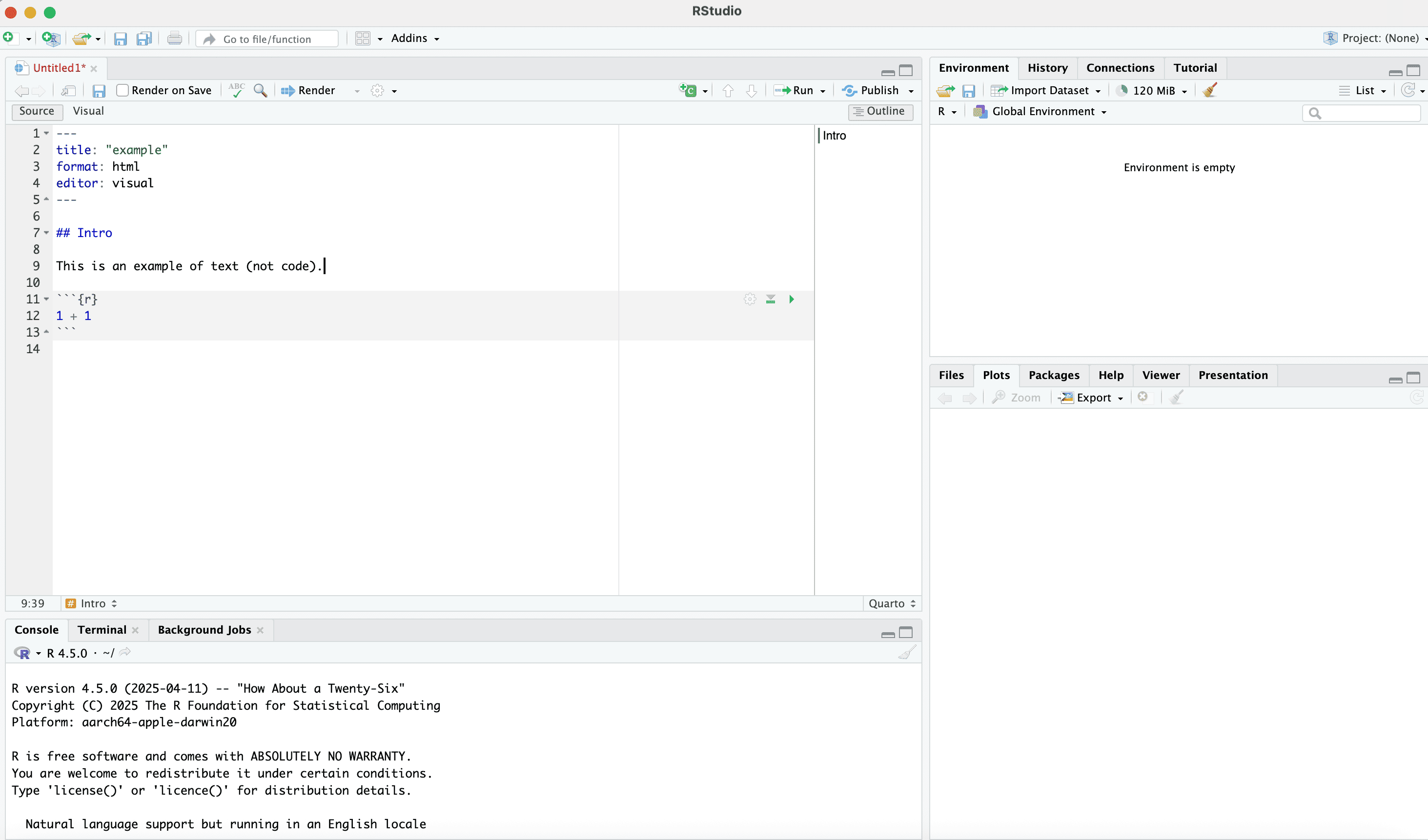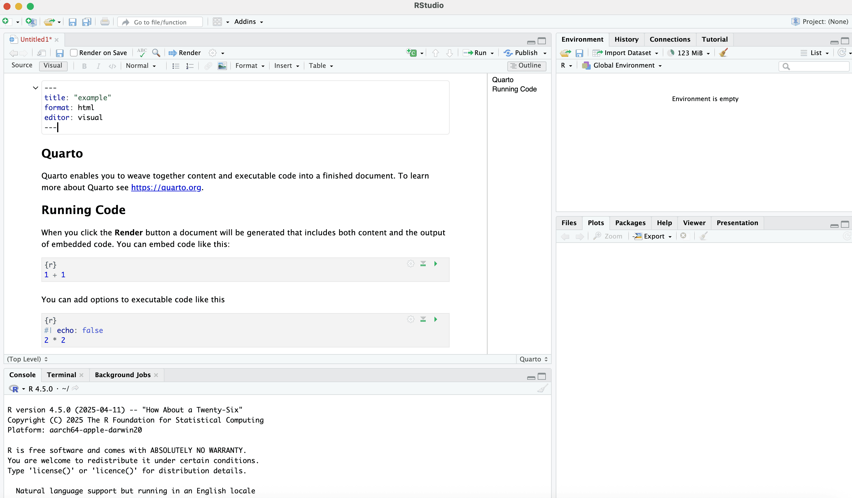 Quarto is a version of R Markdown from RStudio that allows us to run code and write text.