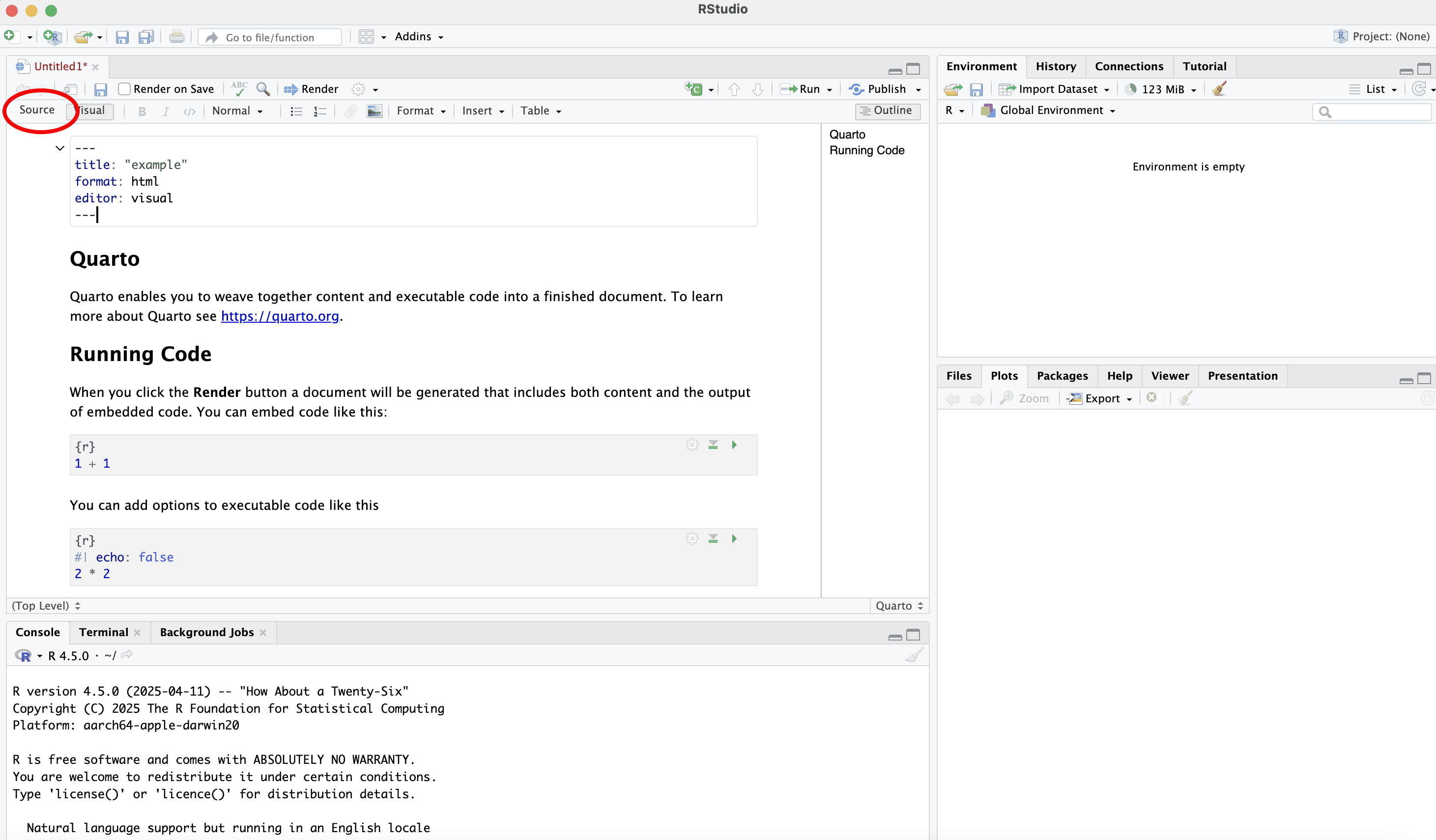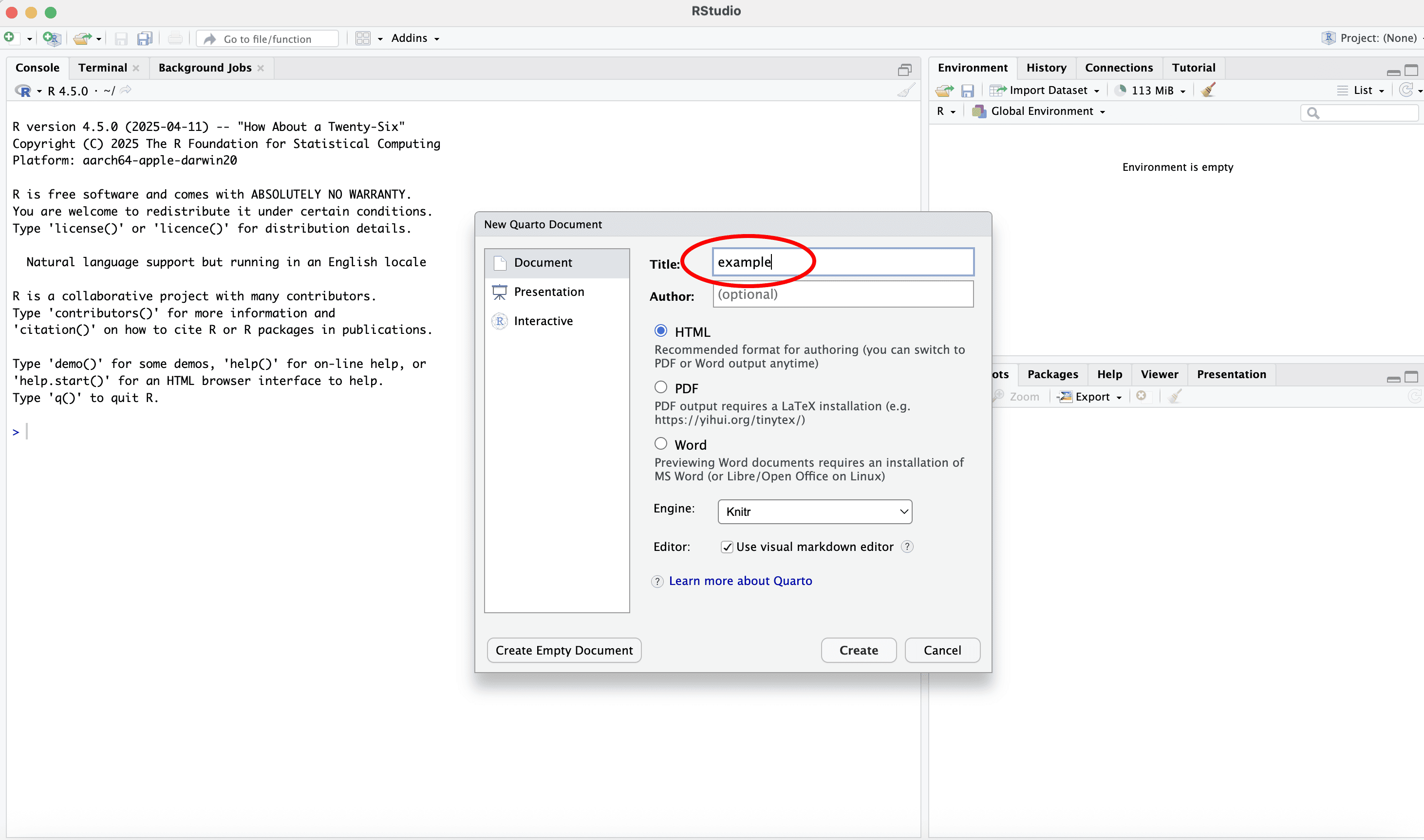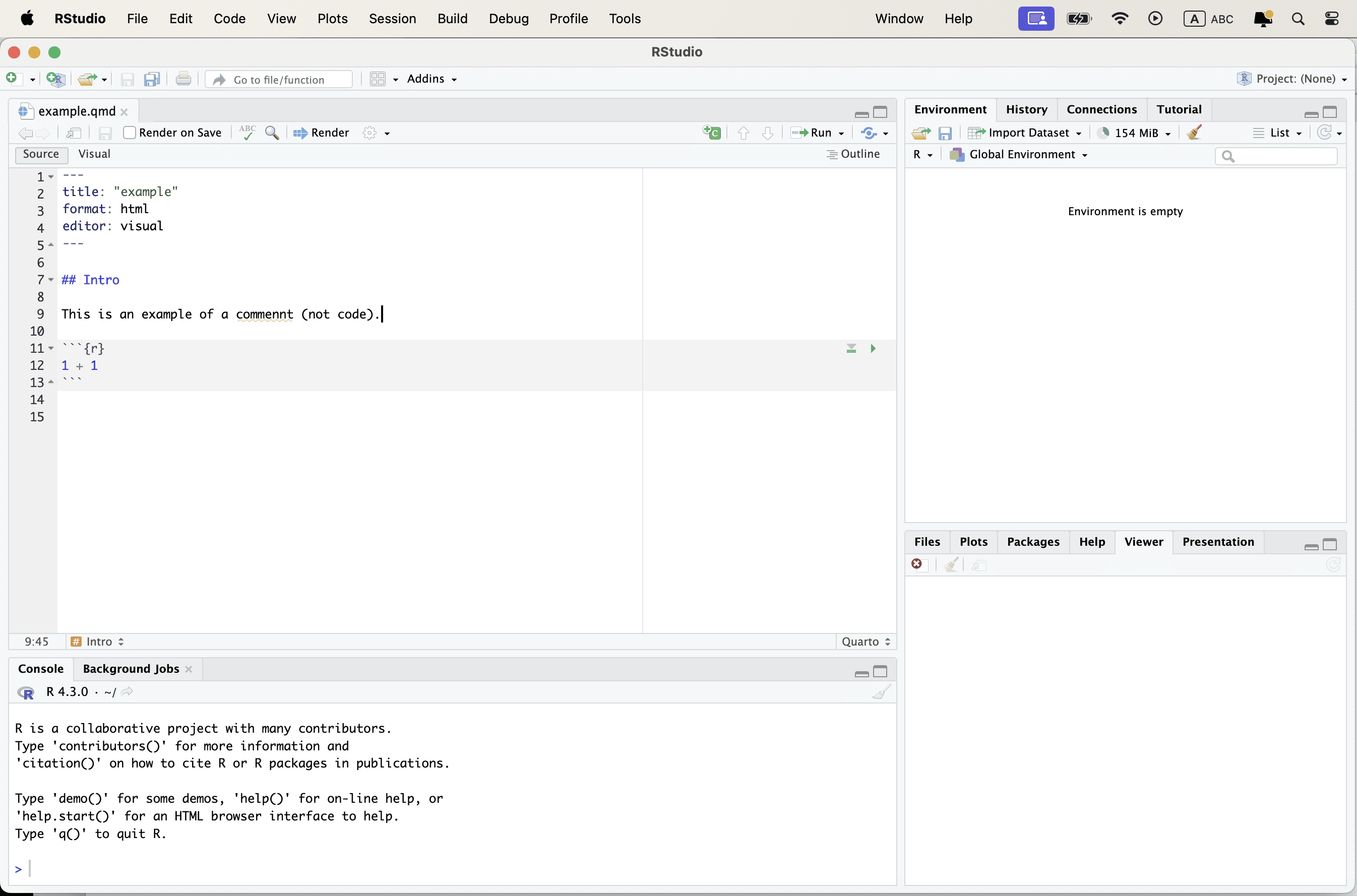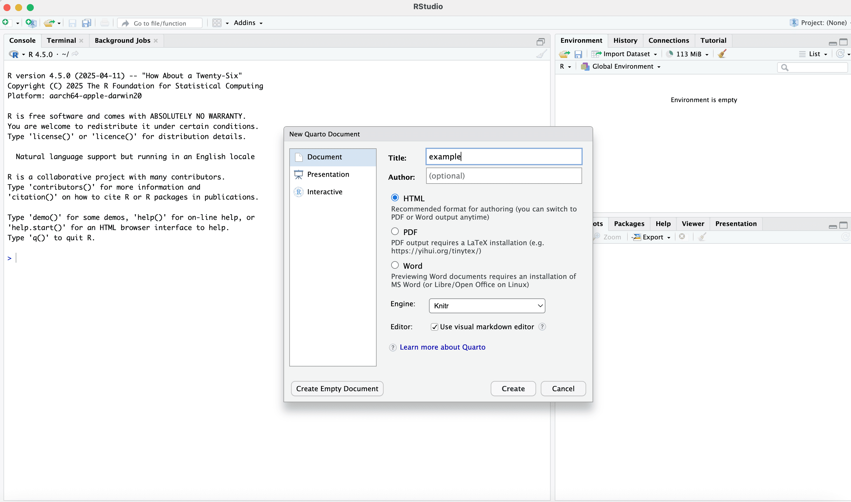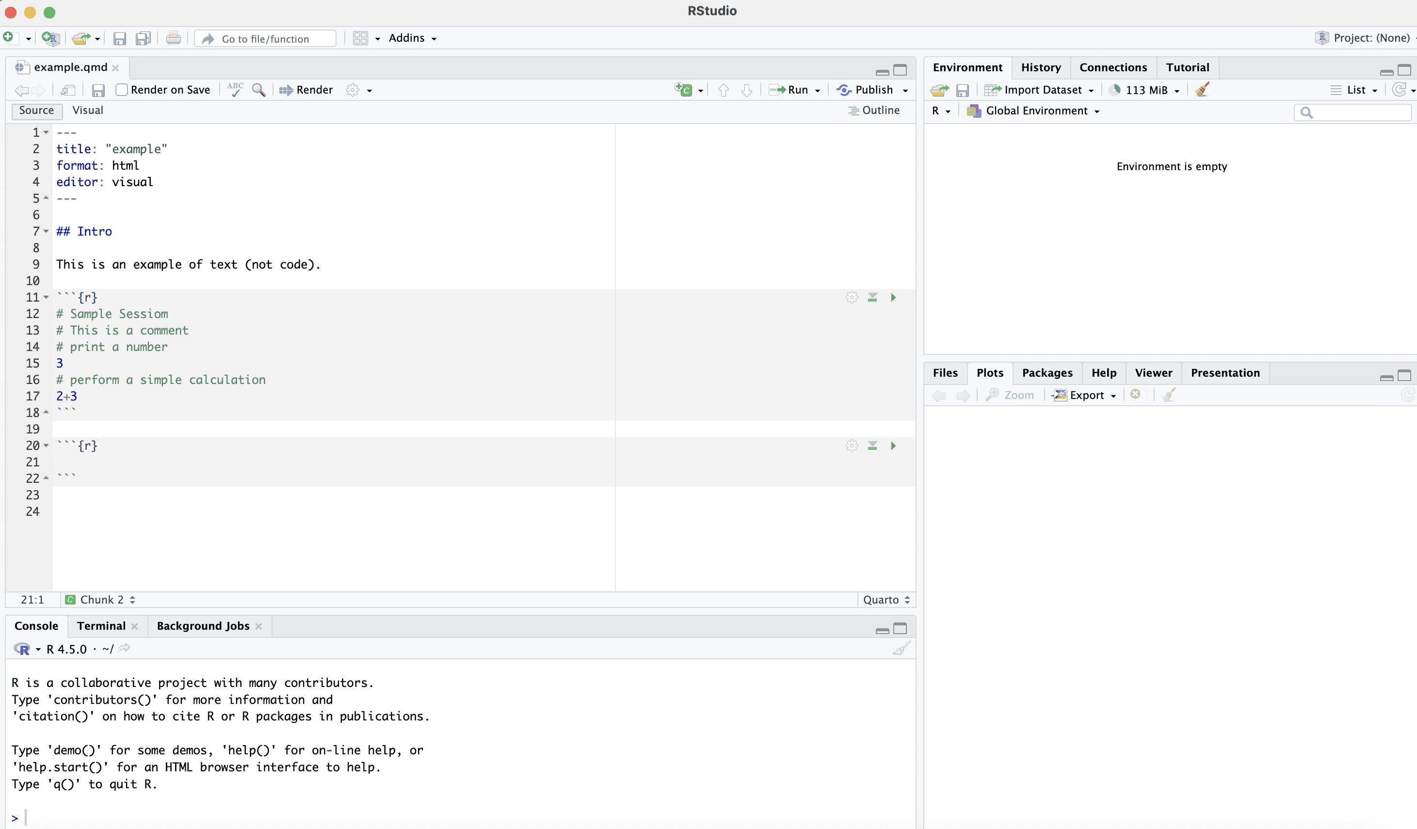 Quarto is a version of R Markdown from RStudio that allows us to run code and write text.