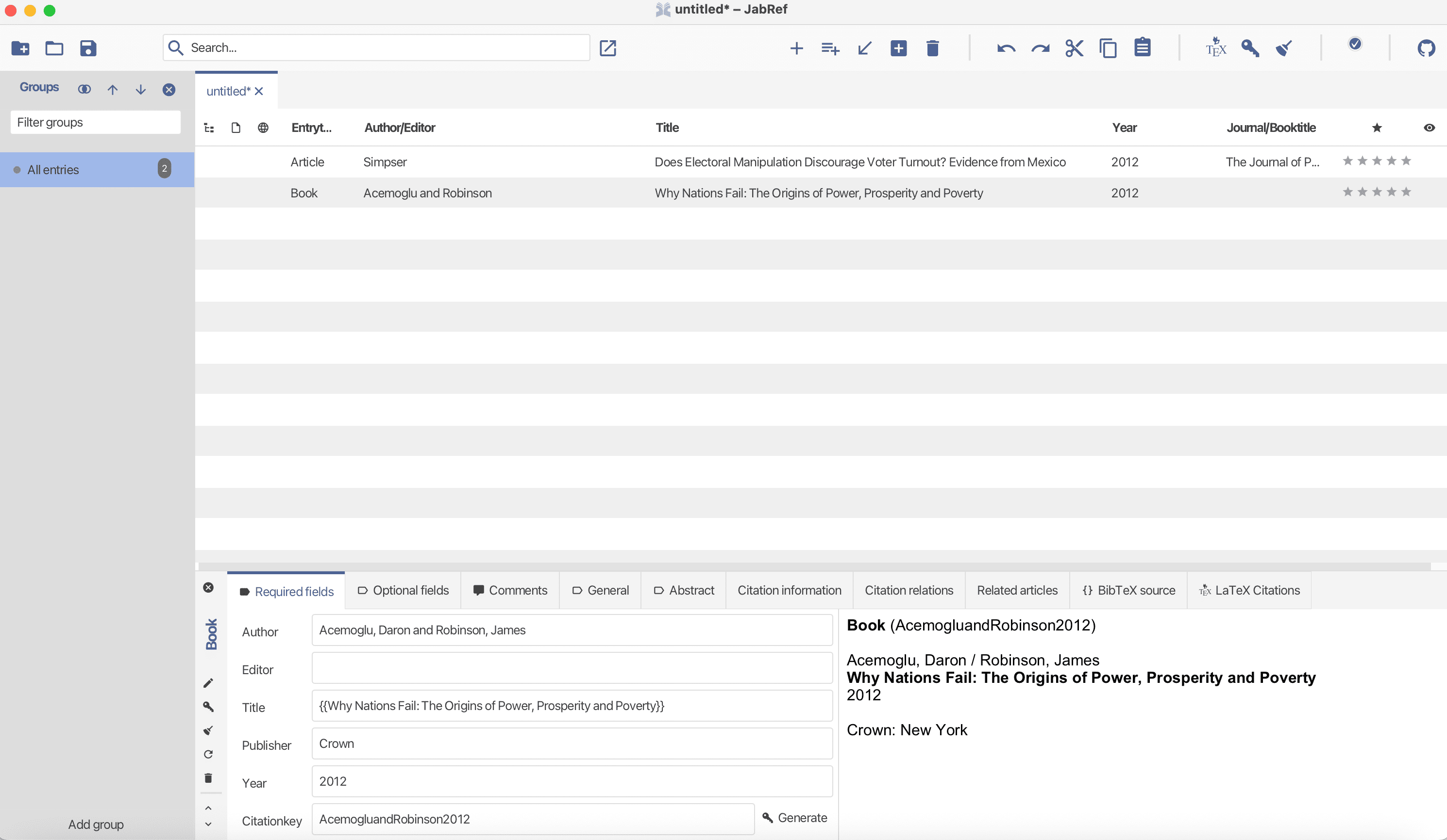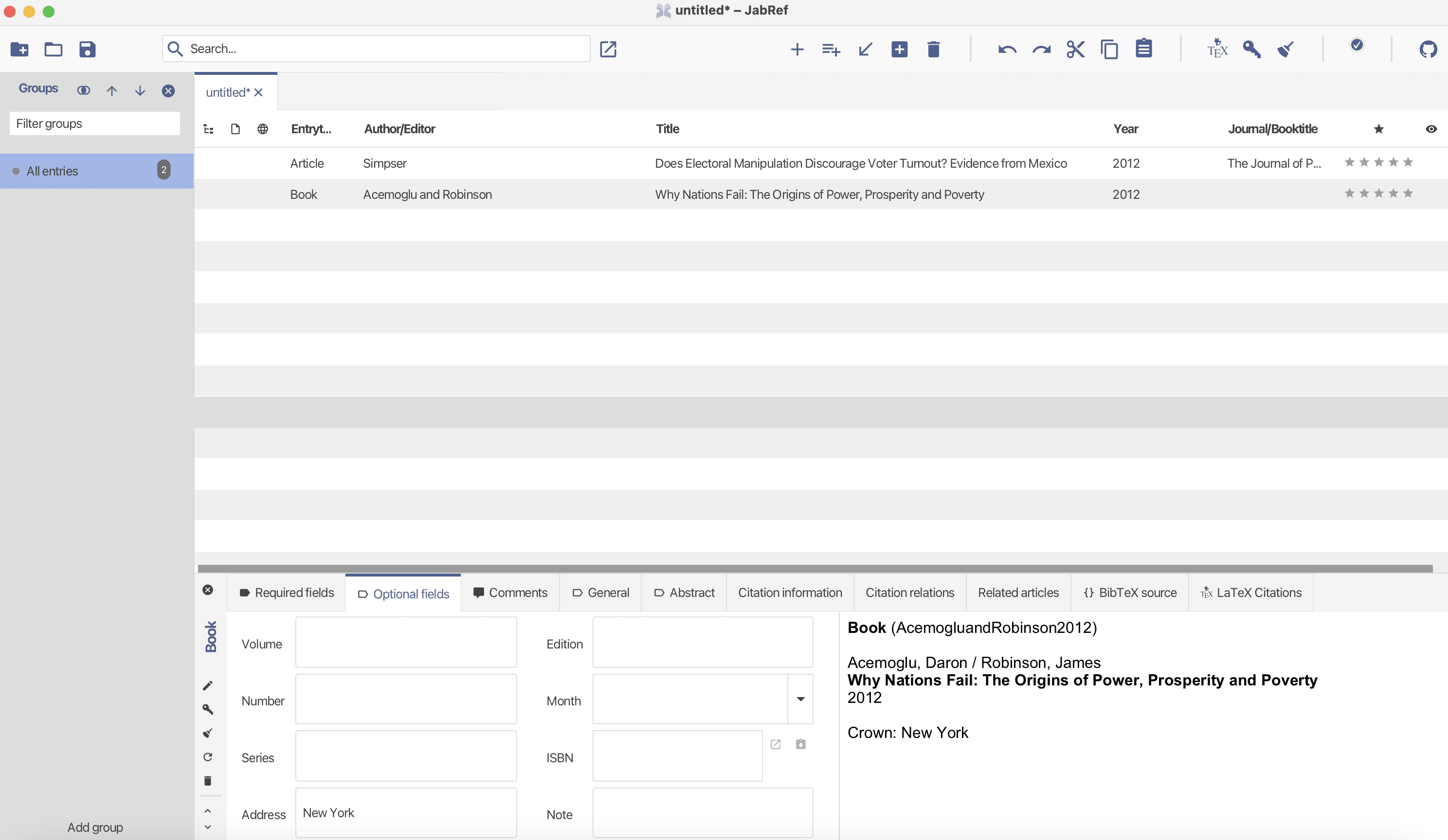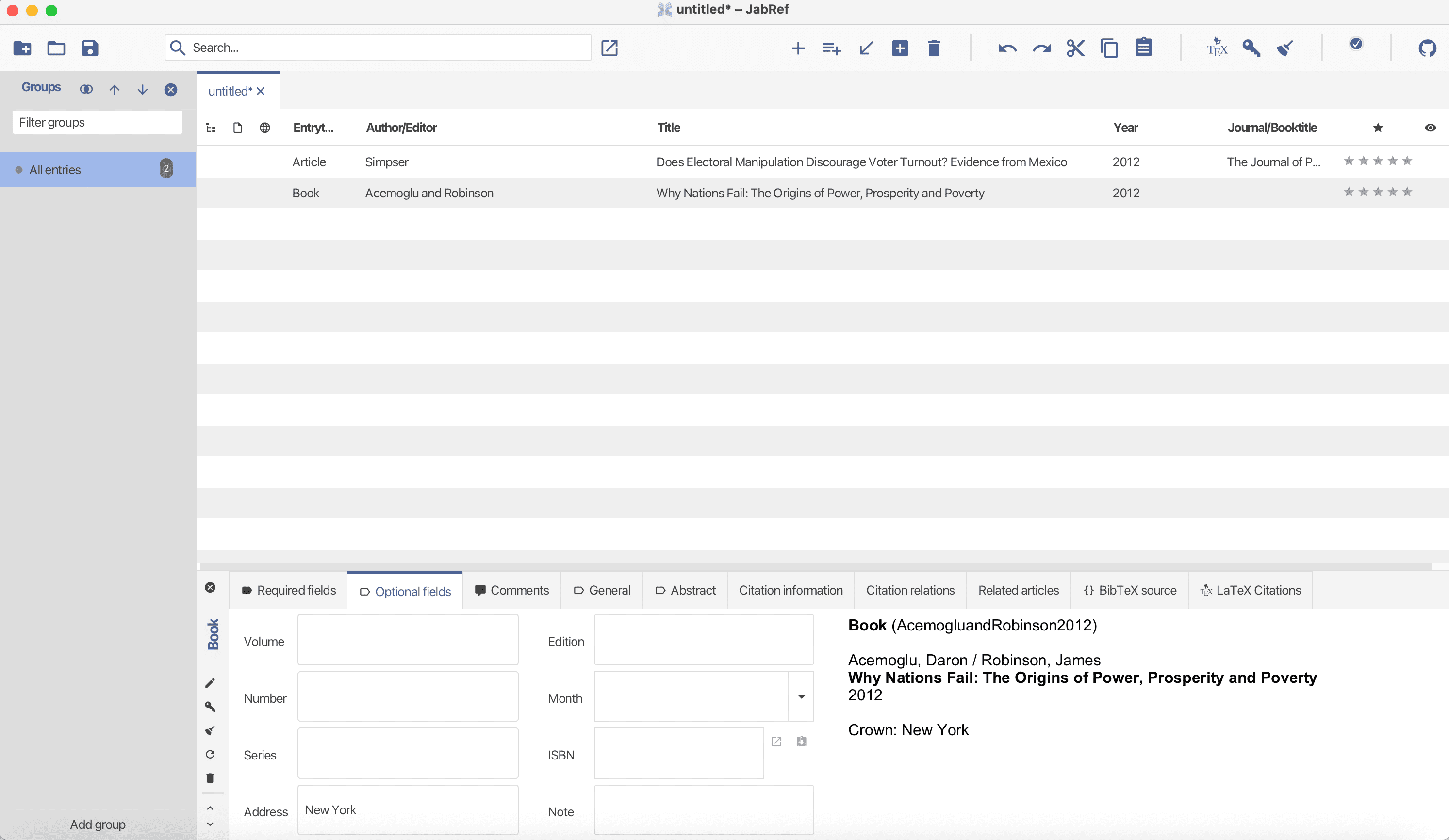 Note that if you have more than one author you need to write them under the author section in JabRef:
