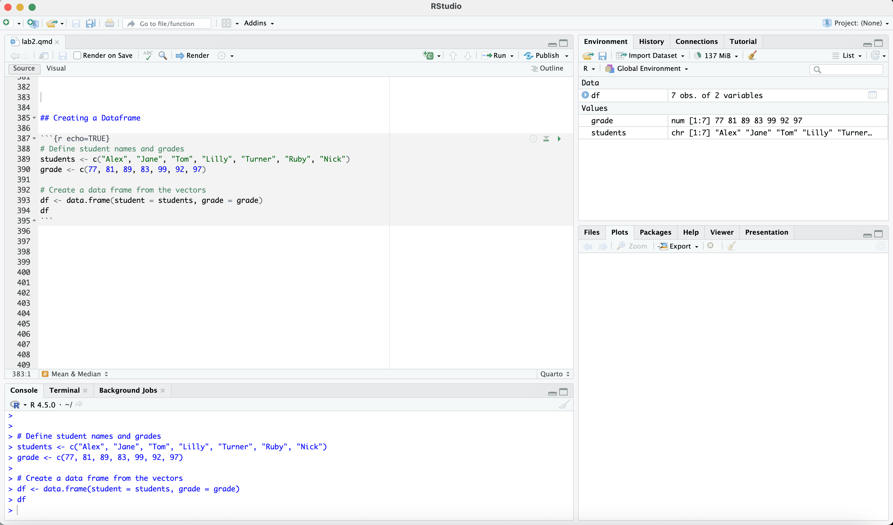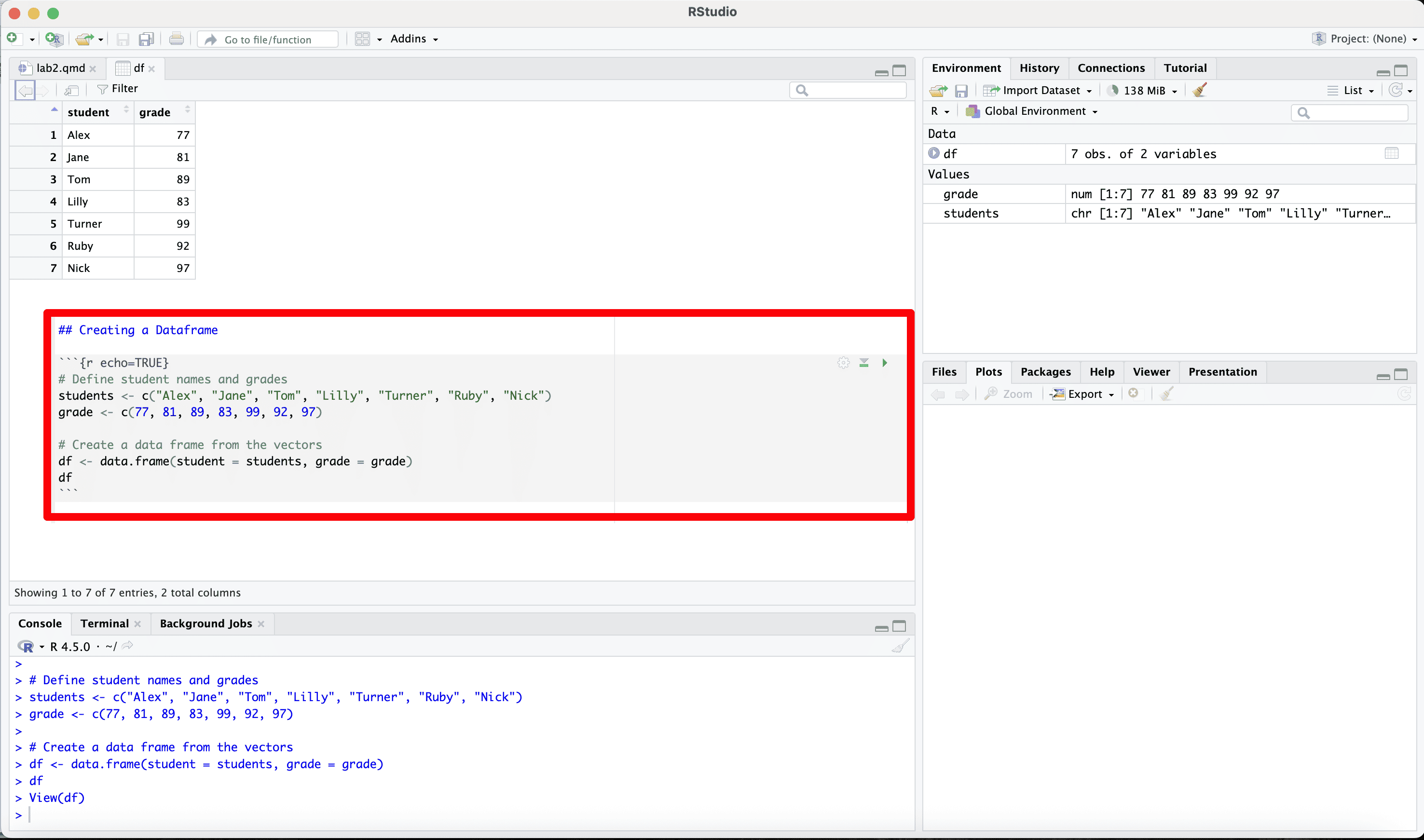 df has two variables: student and gradeThis is how we can calculate average for the two variables from the two dataframes