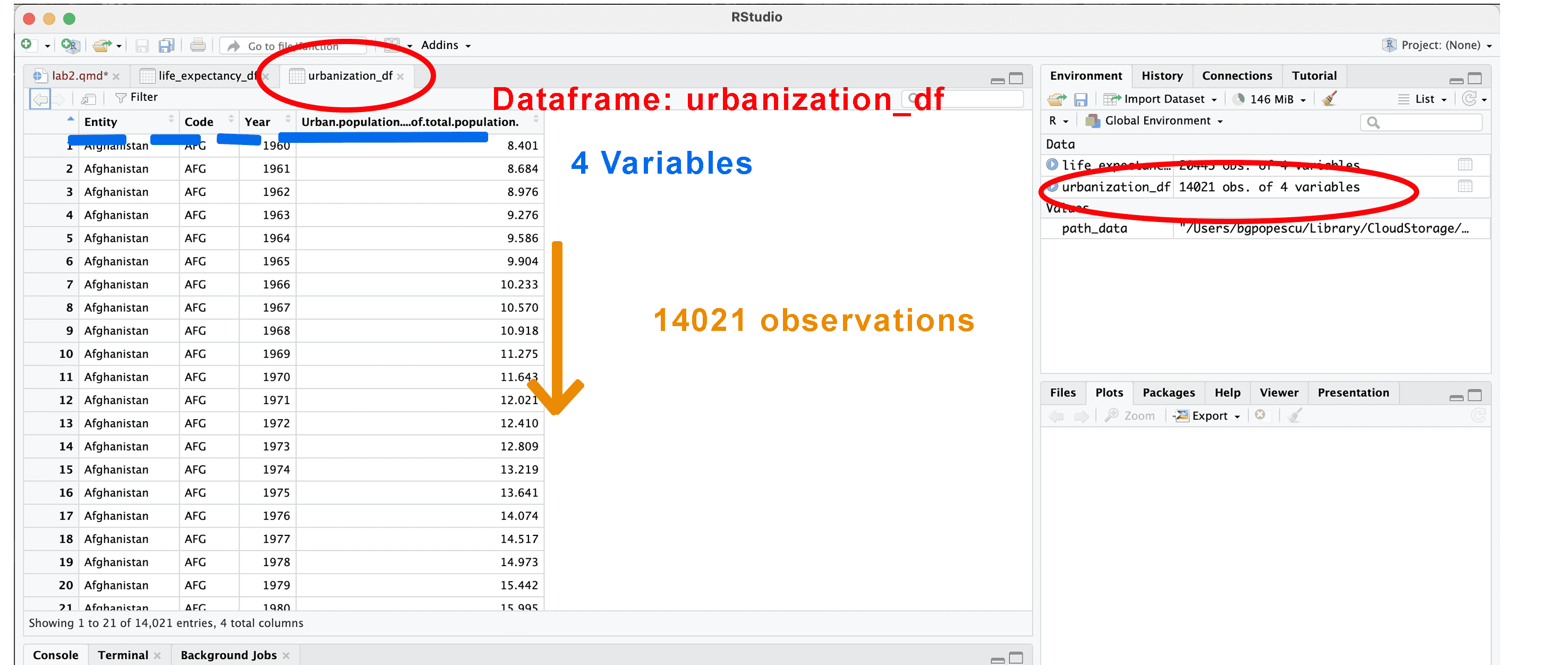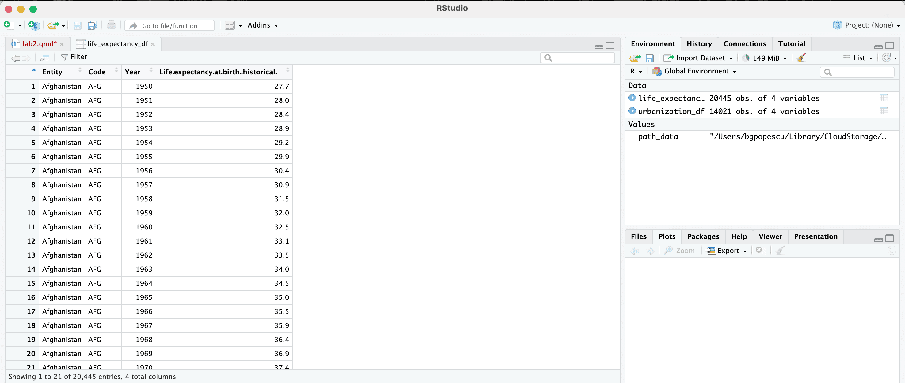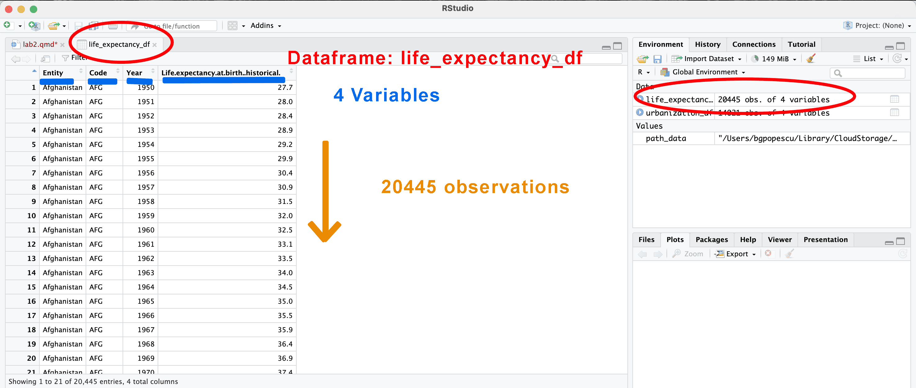Entity: the country: “Afghanistan”, “Albania”, “Algeria”, etc.Code: the country code: “AFG”, “ALB”, “DZA”, etcYear: year 1950, 1951, 1952, etc.Life.expectancy.at.birth..historical.: life expectancy corresponding to that year.csv and .xlsxPopescu (JCU): Dataframes, Lists, External Files, Paths