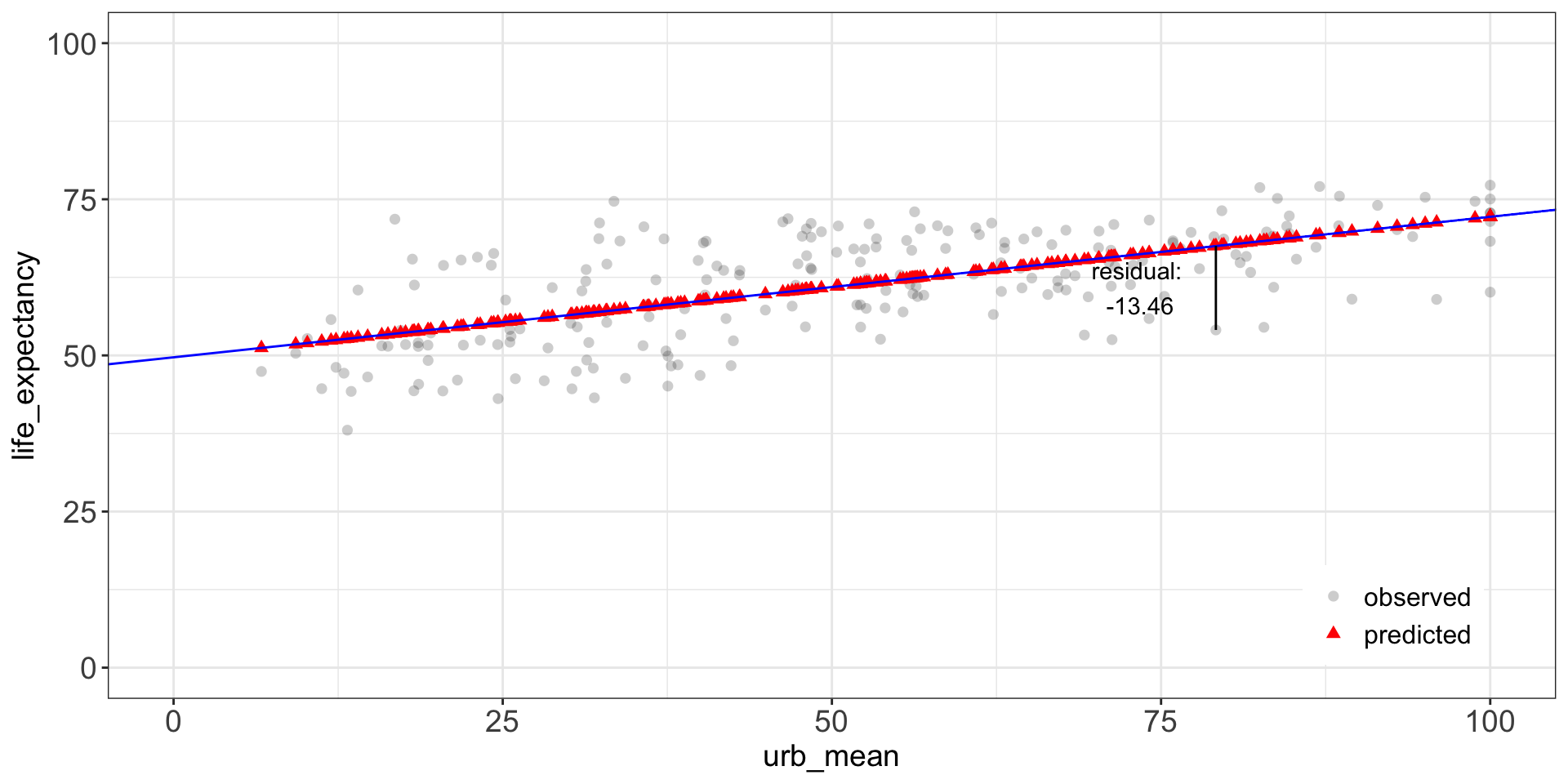 Actual (circles) - predicted value (triangles) = residual.