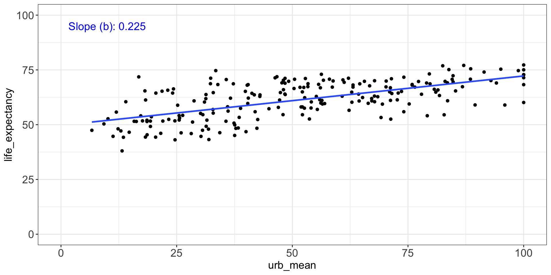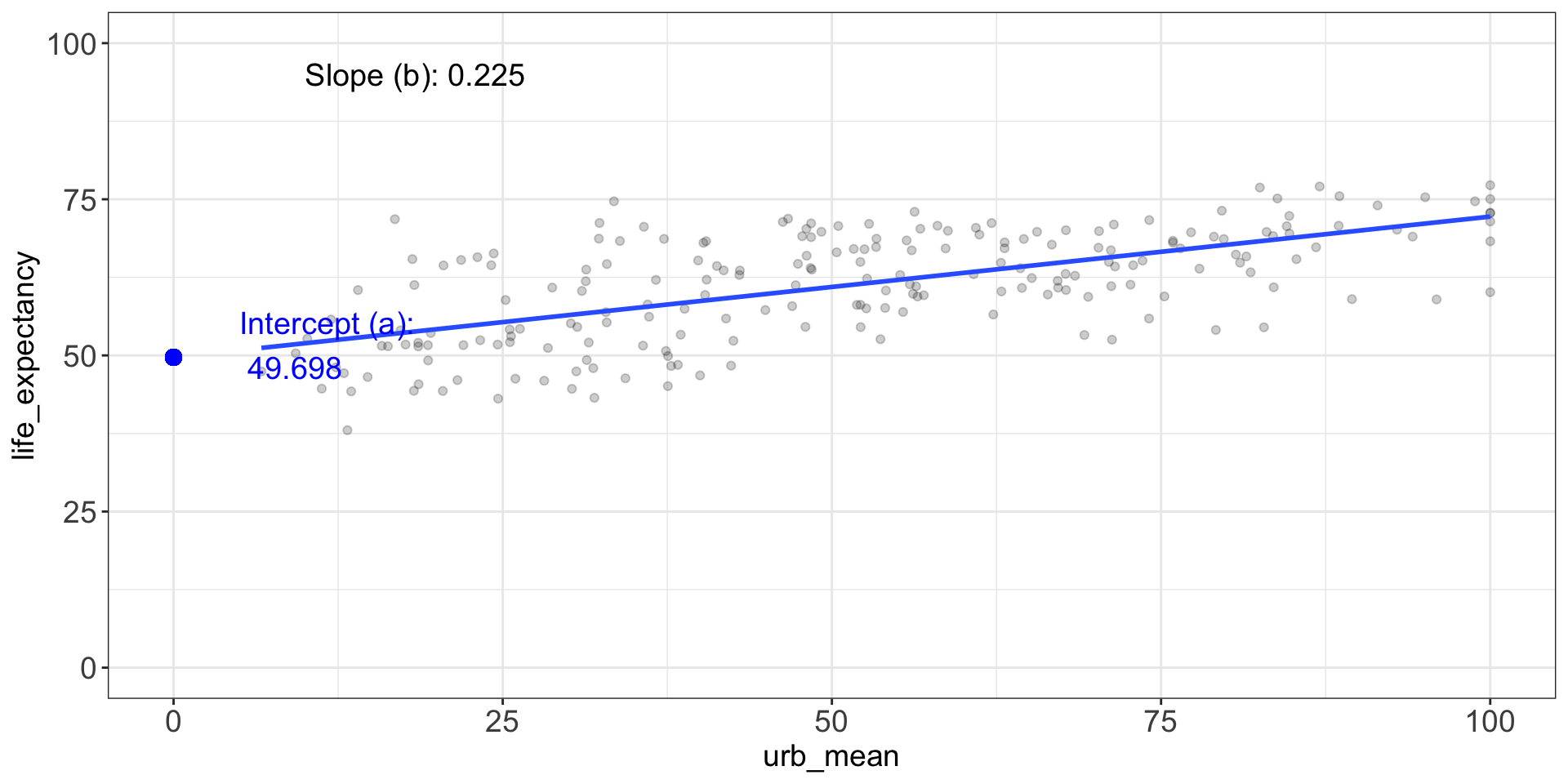 Intercept = 49.698 When urbanization is 0%, the predicted life expectancy is 49.698 years.