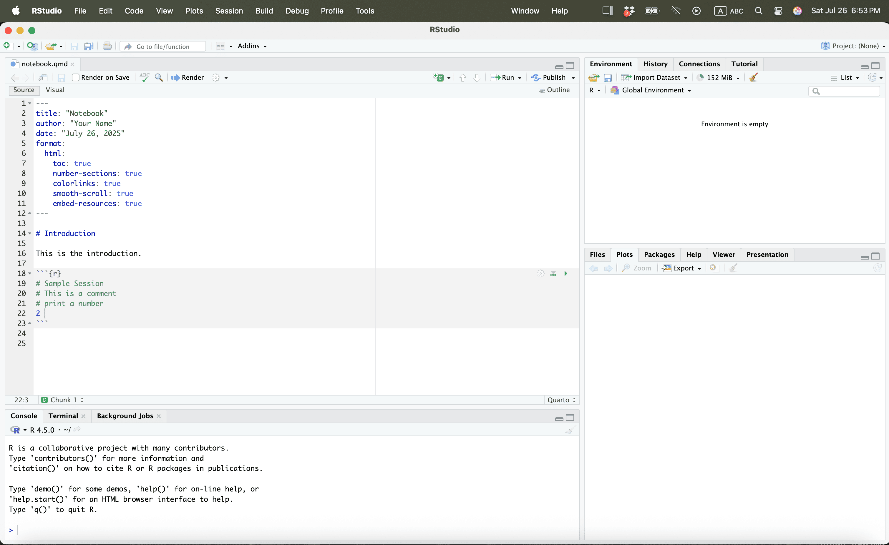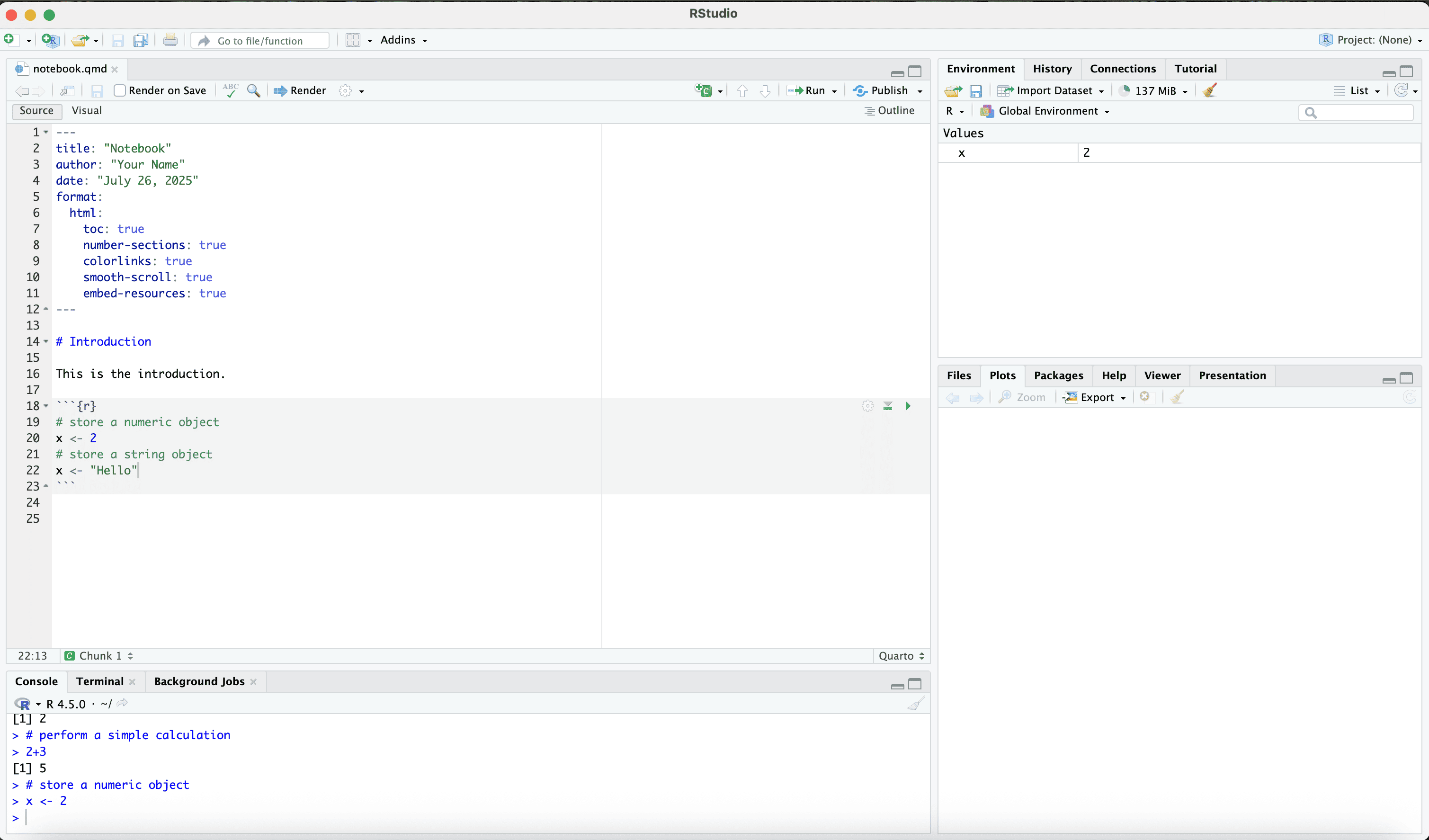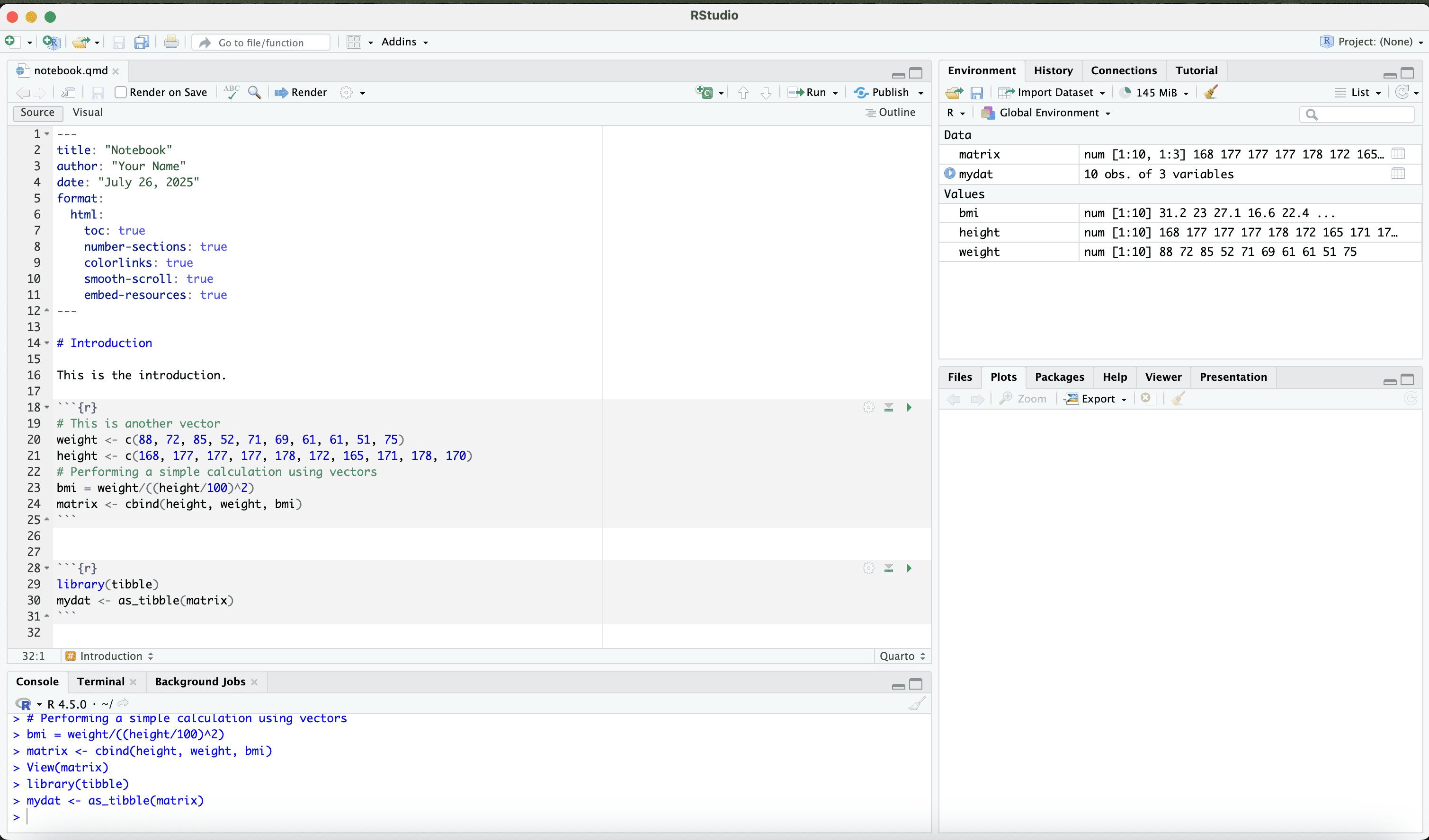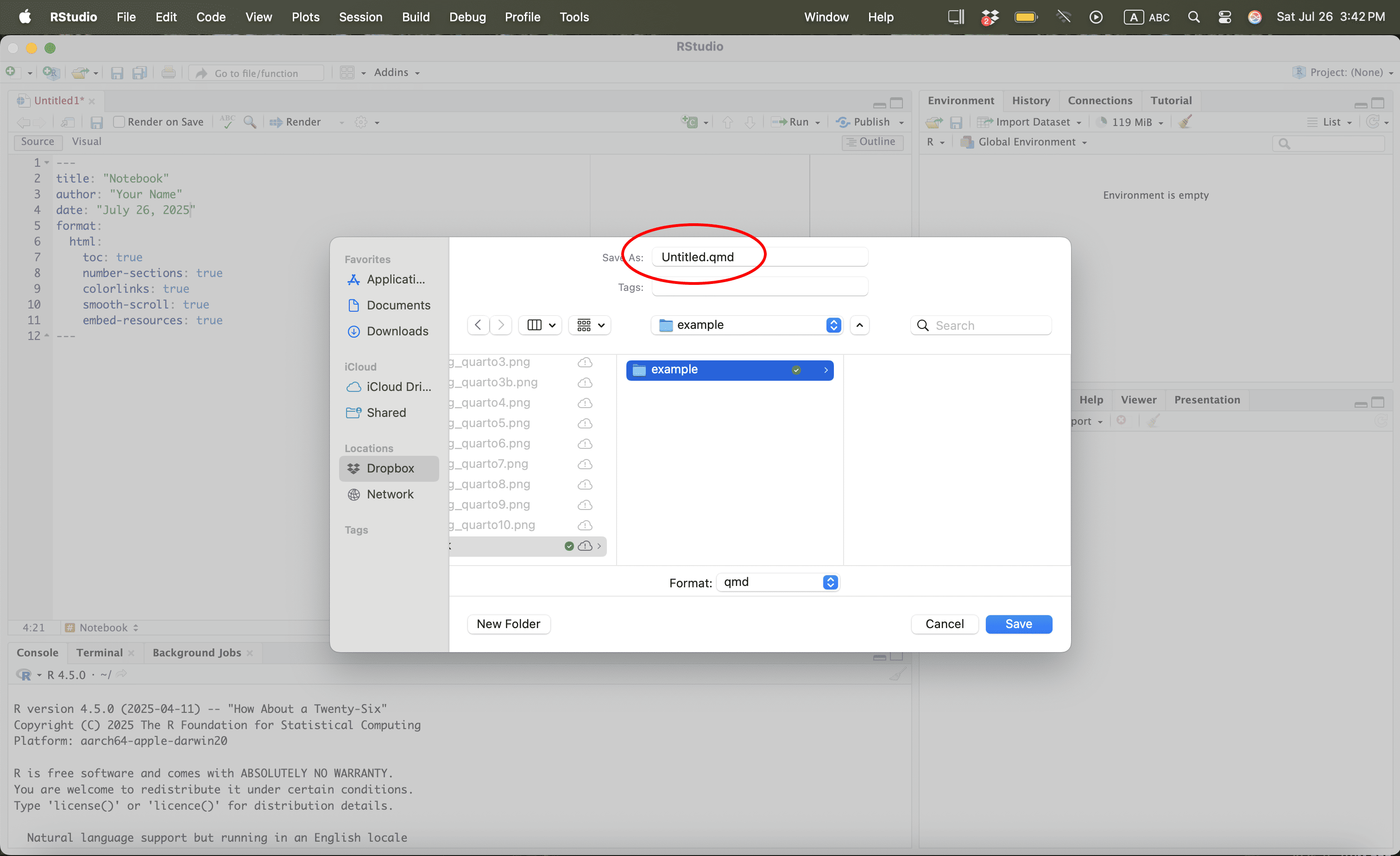 Let us save the quarto file in a work folder called “example”.