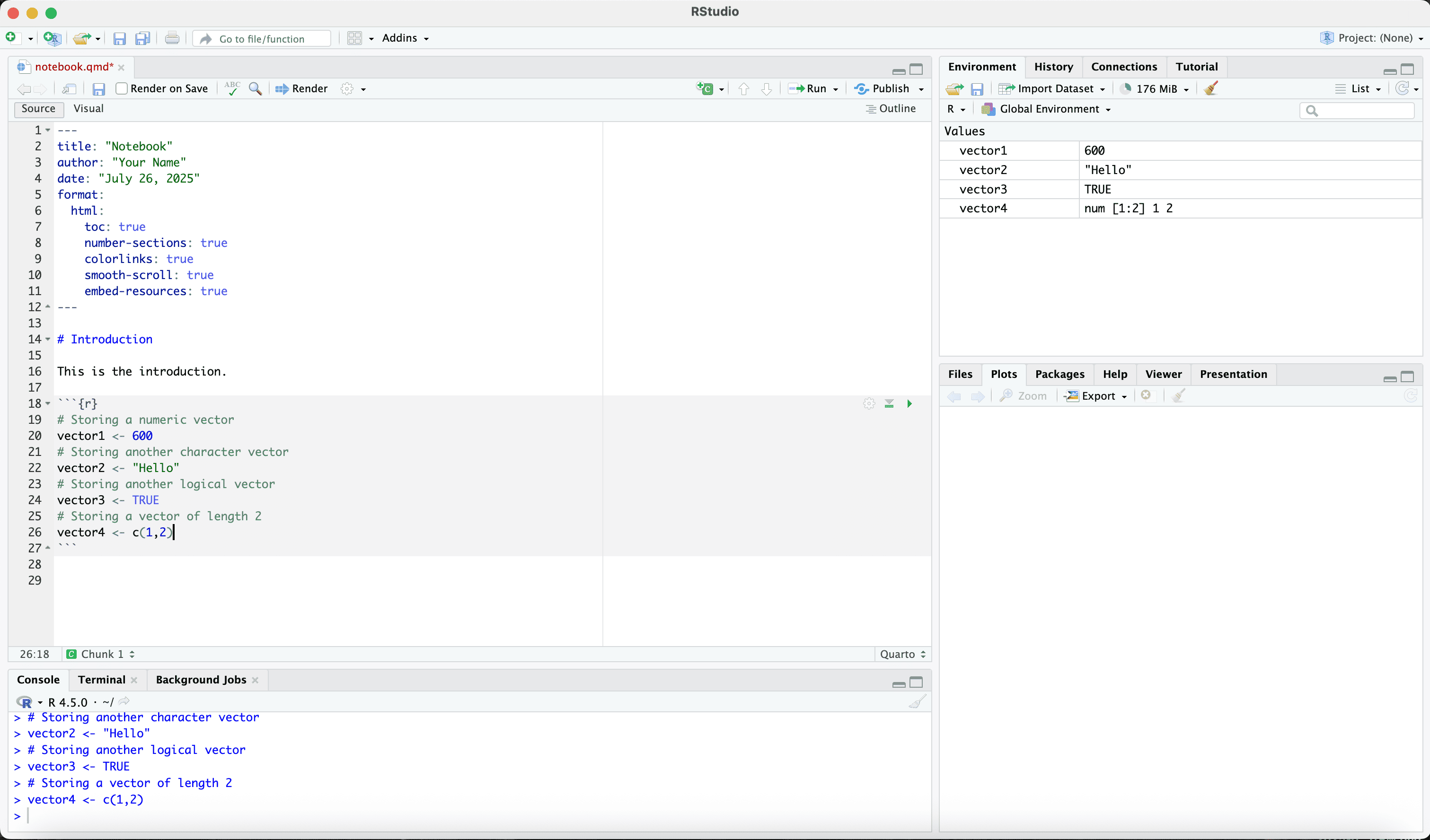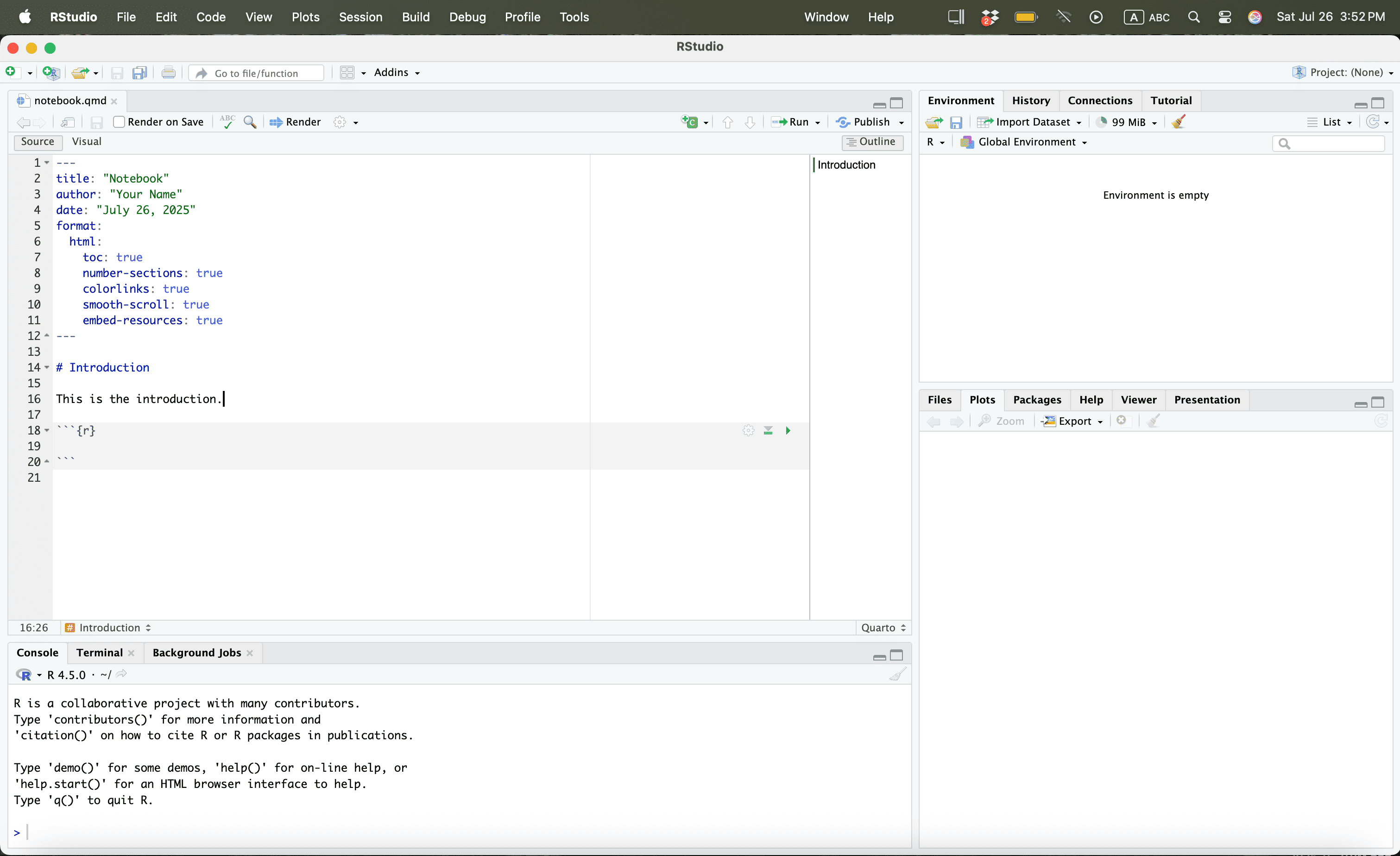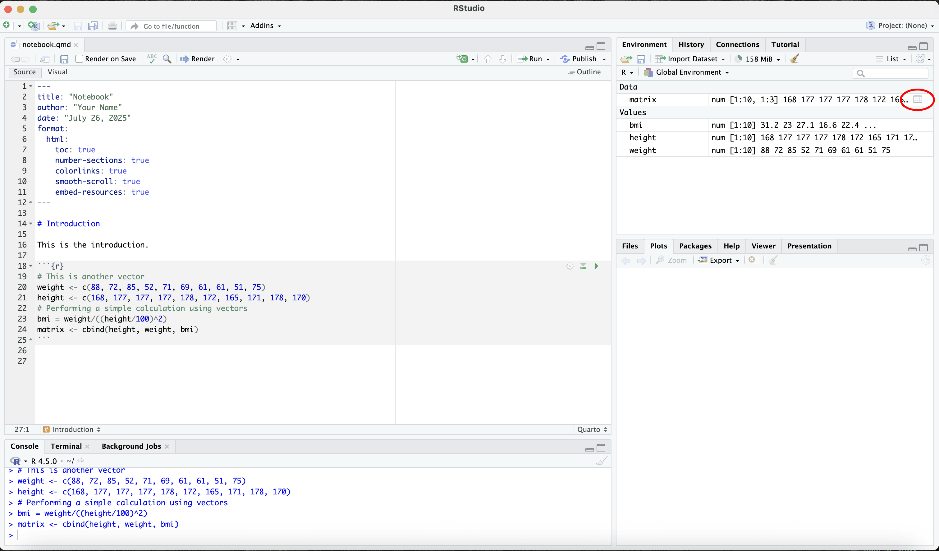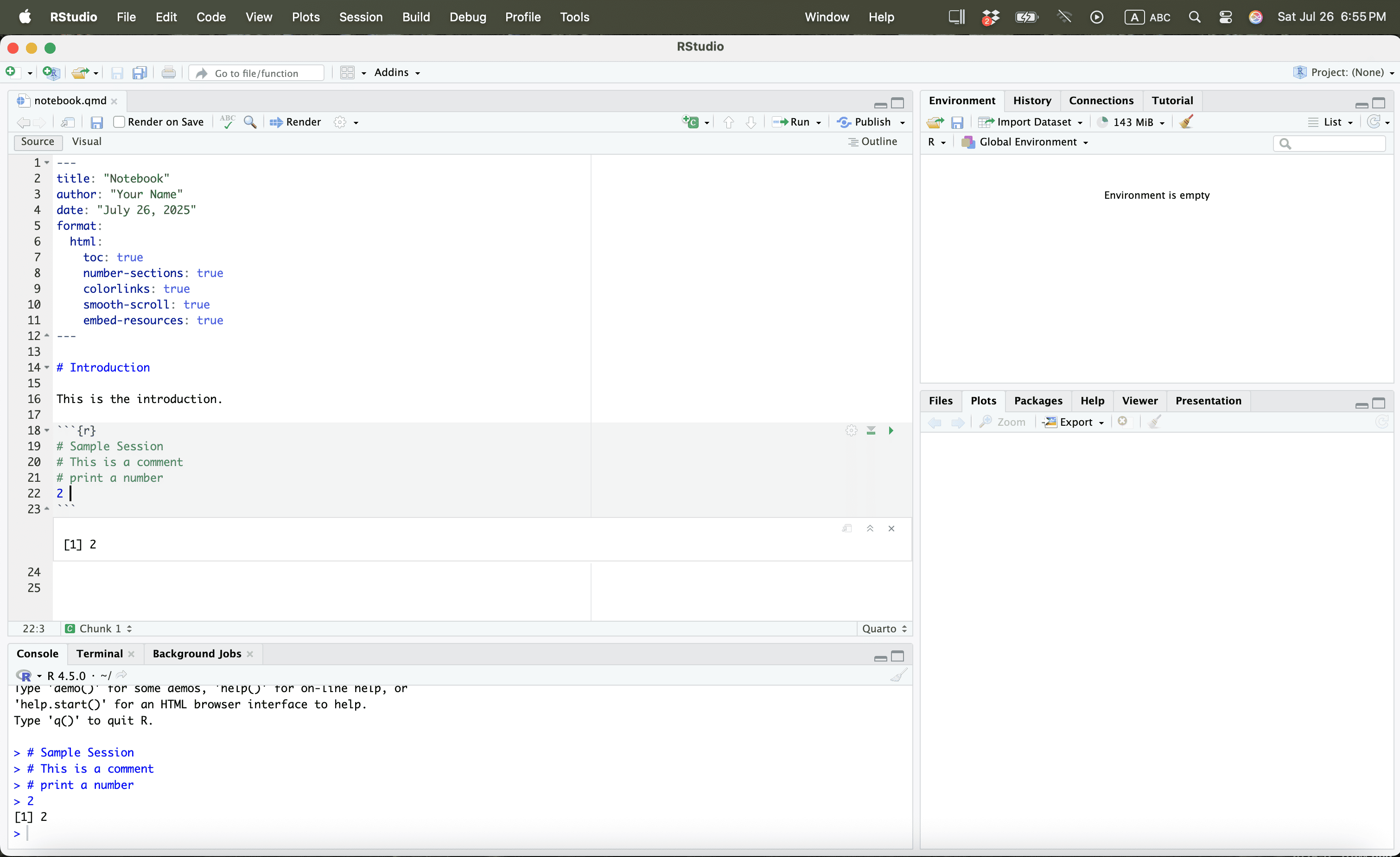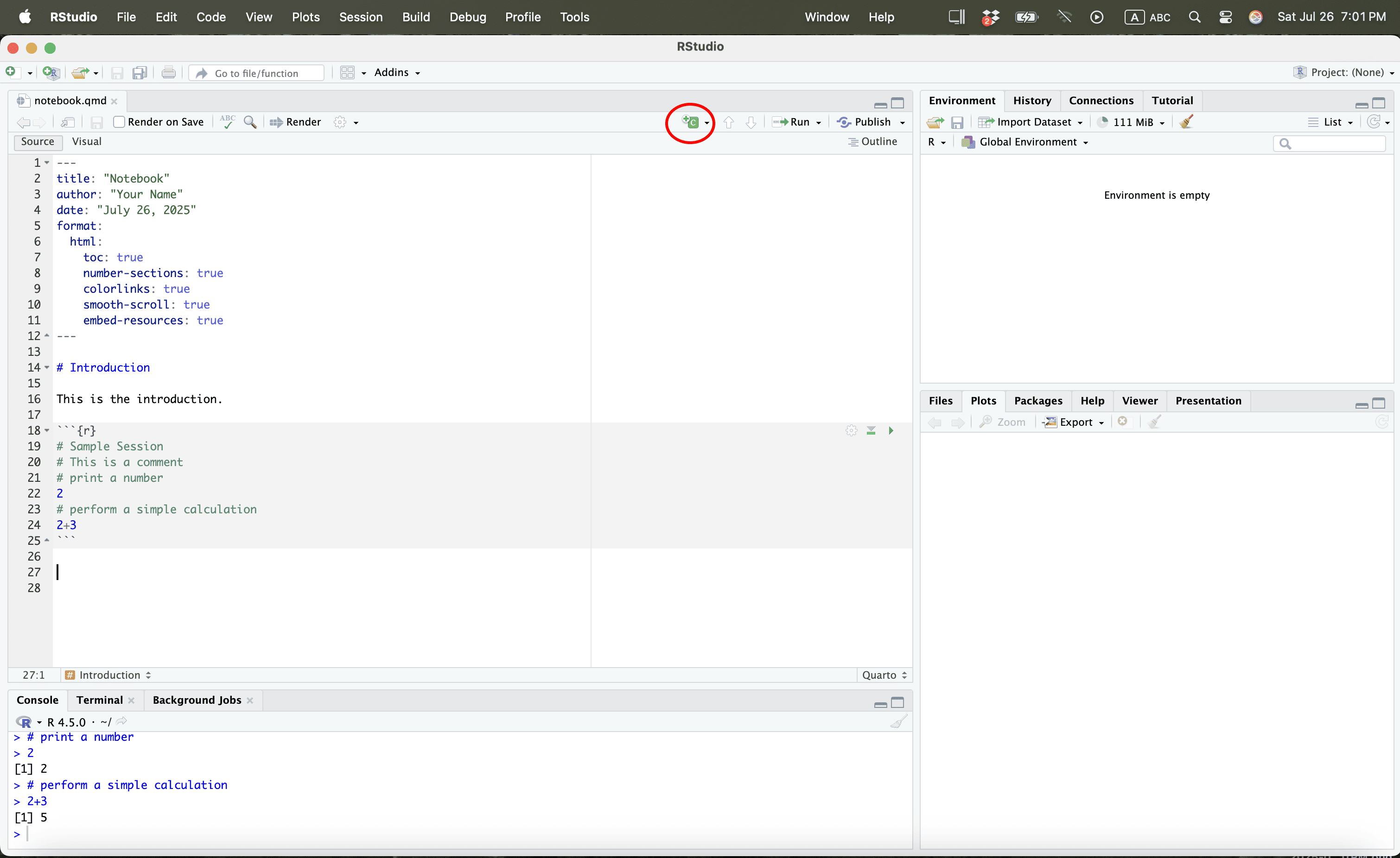 Let us save the quarto file in a work folder called “example”.