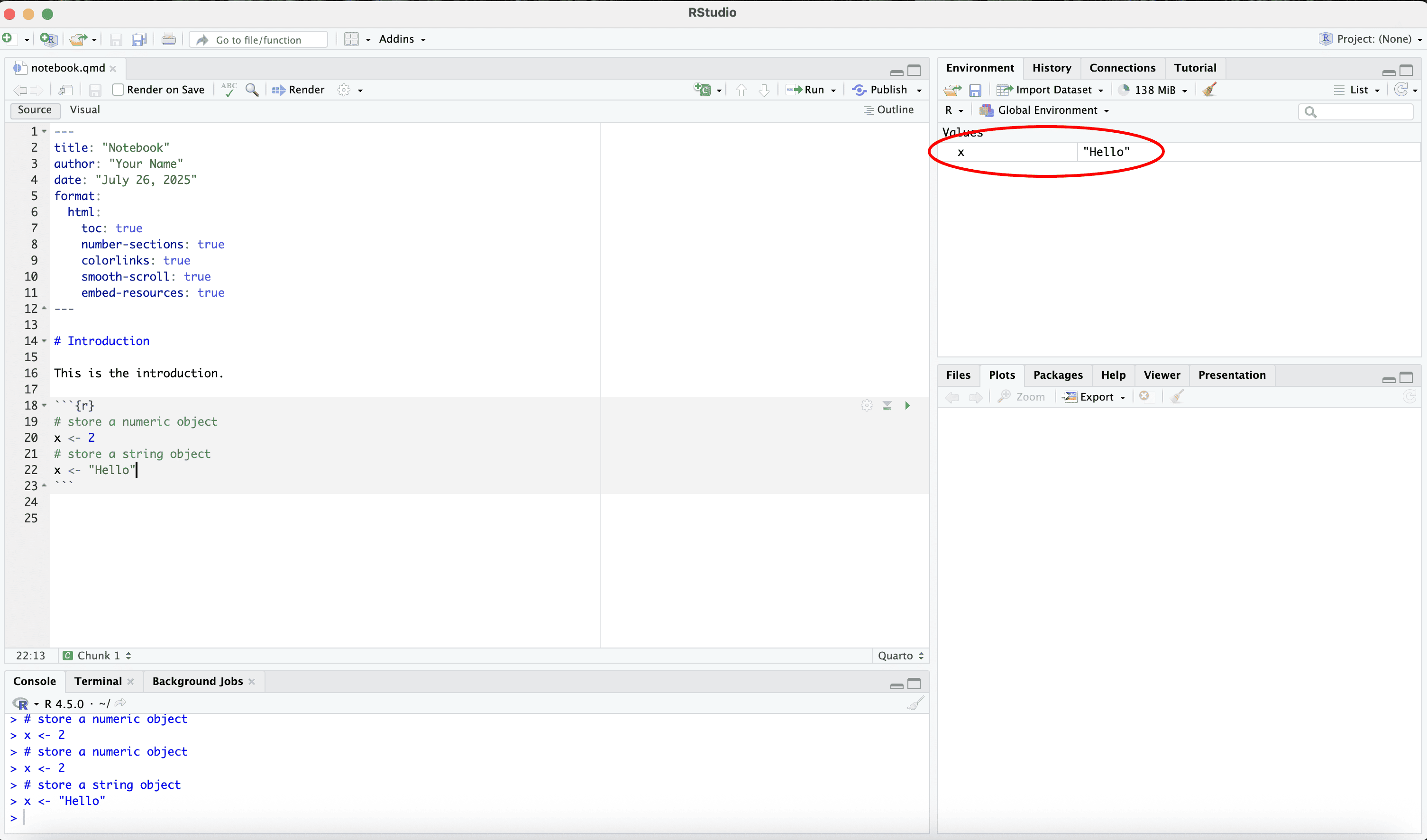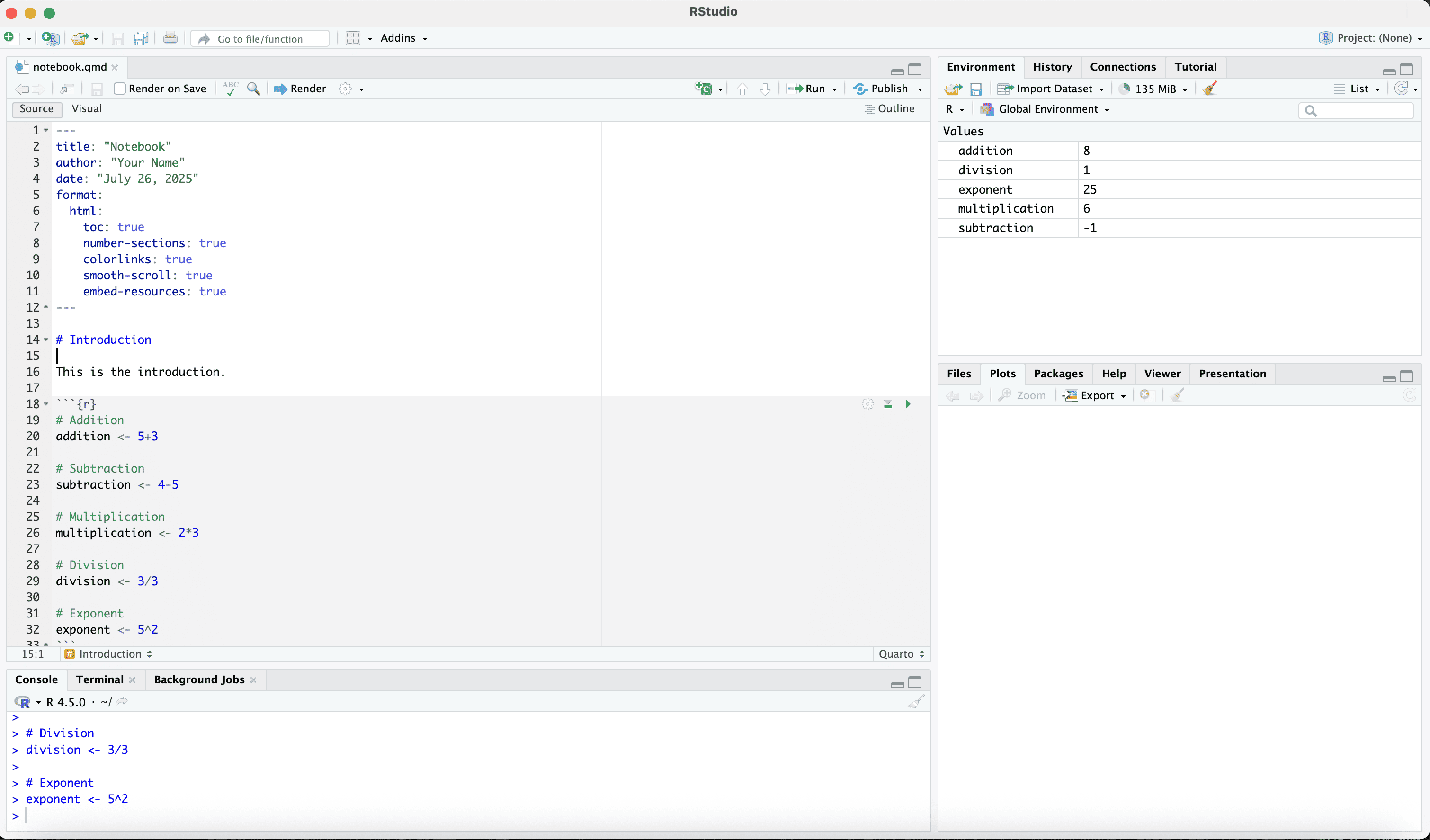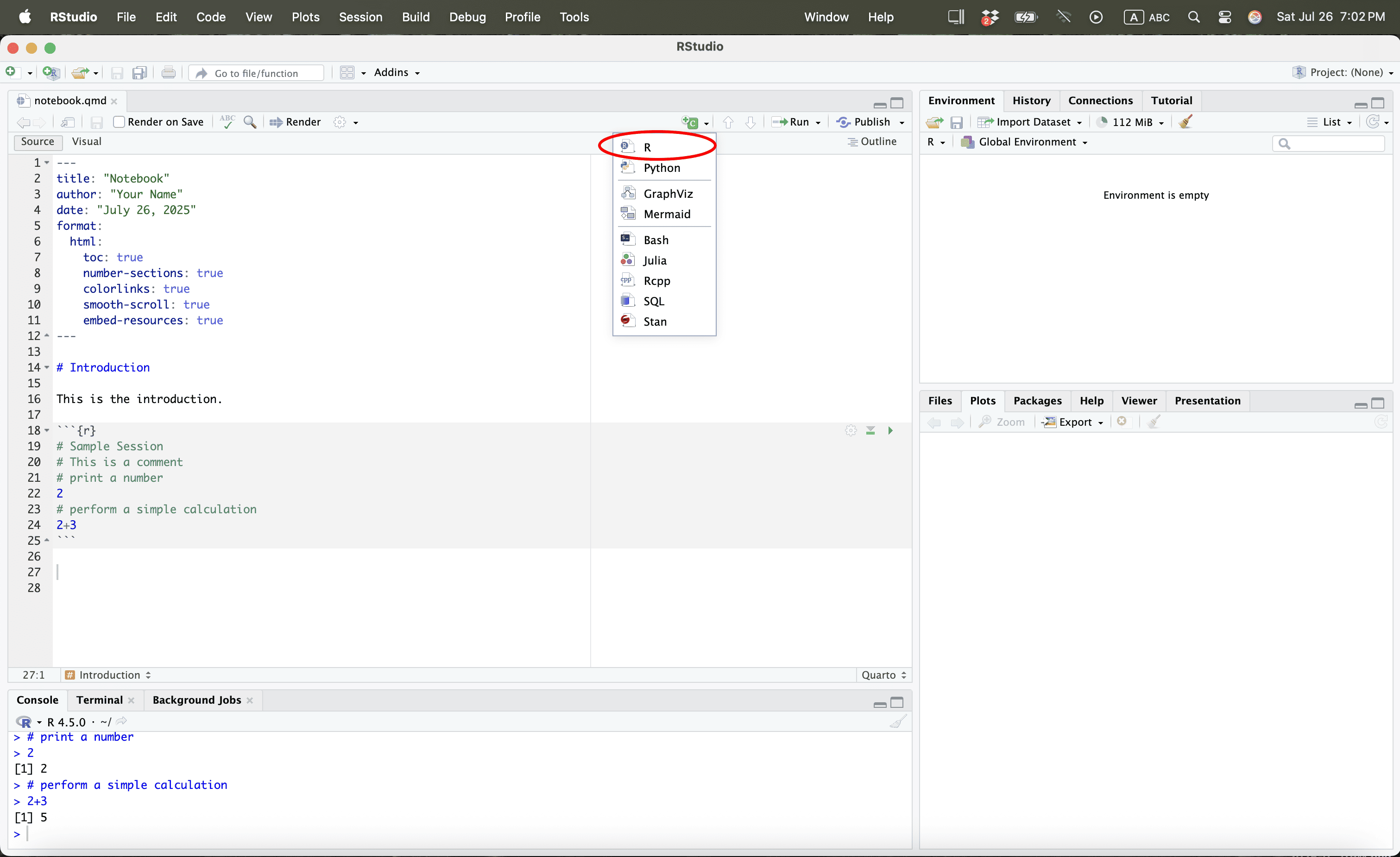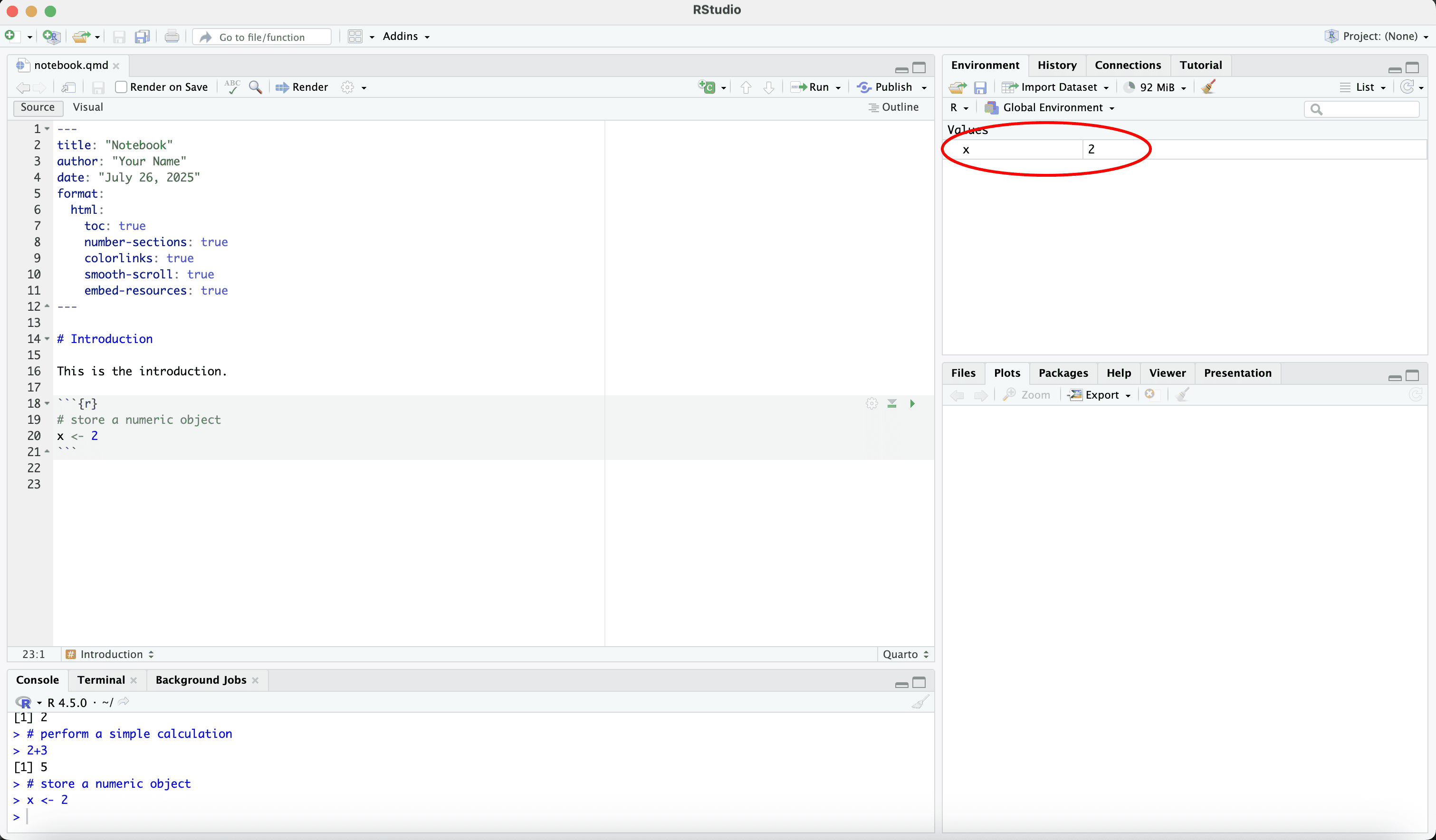 Let us save the quarto file in a work folder called “example”.