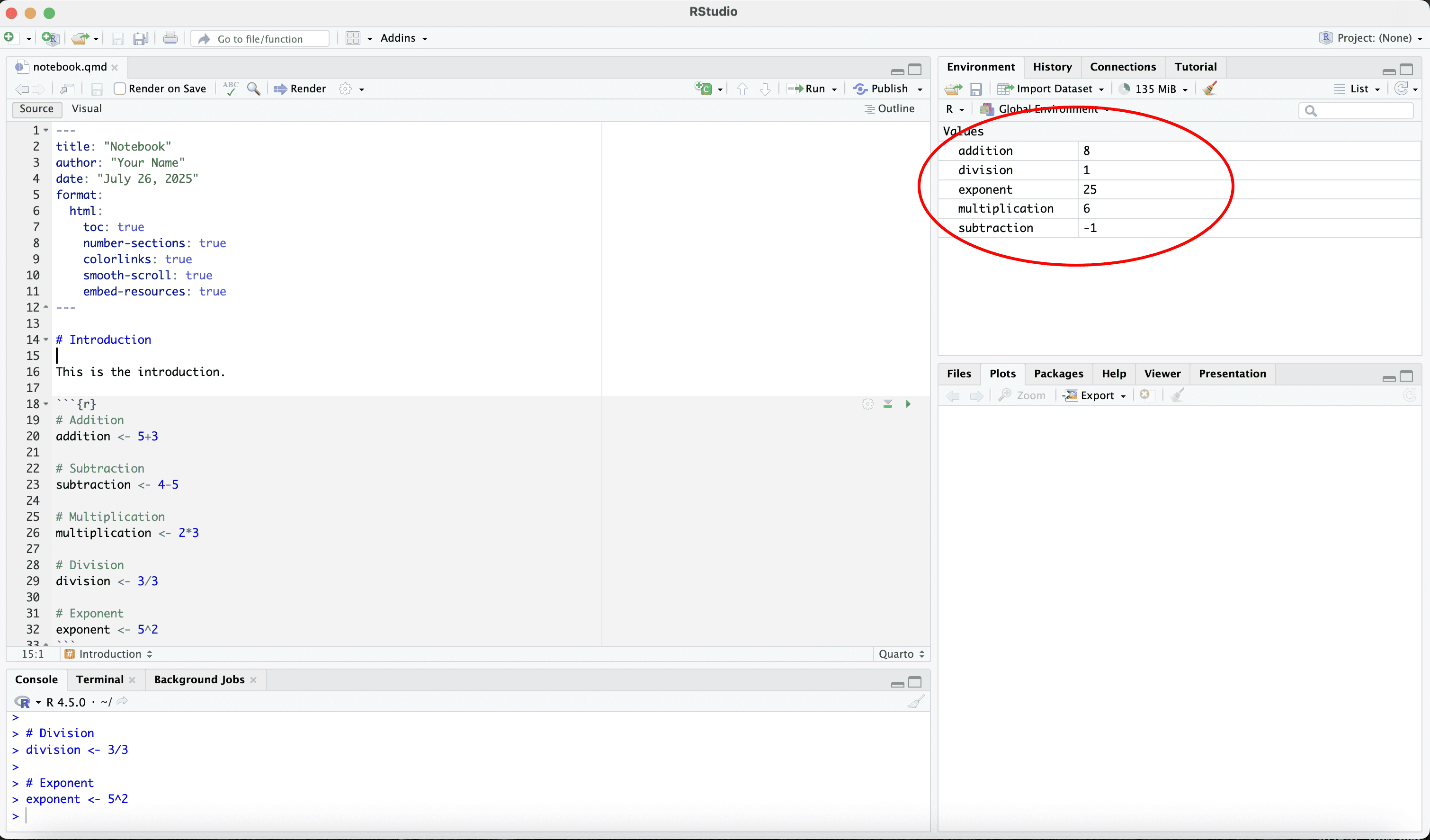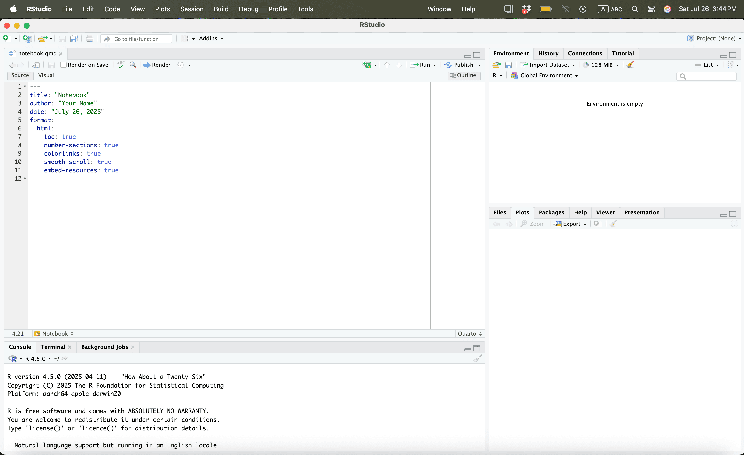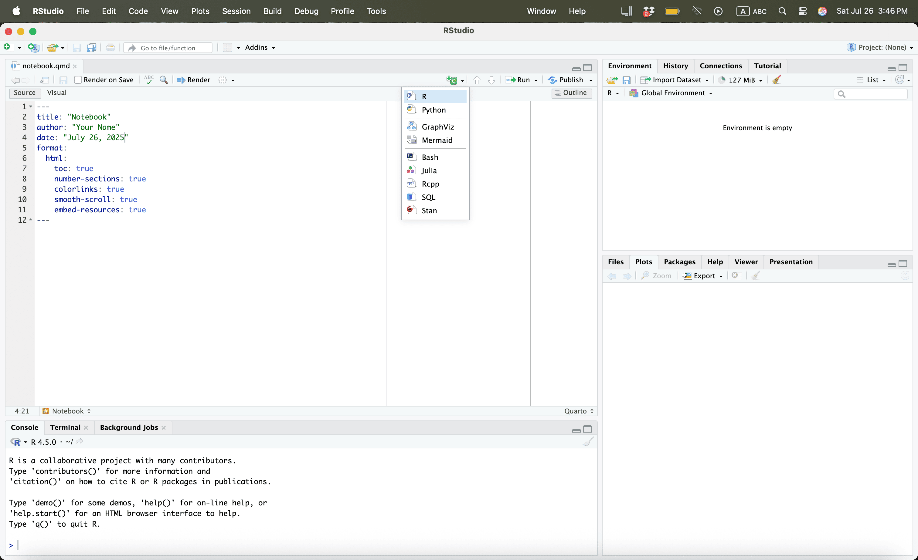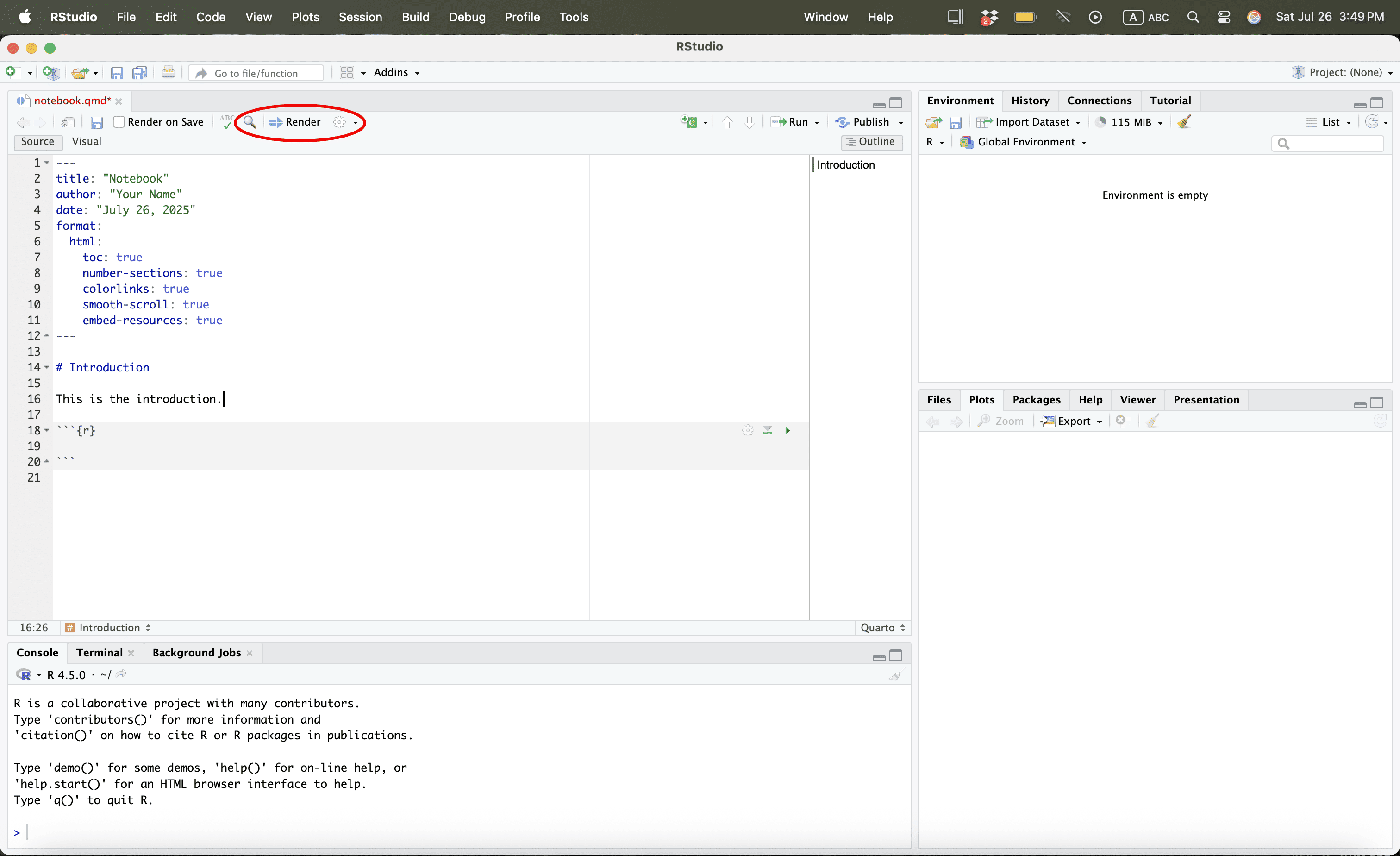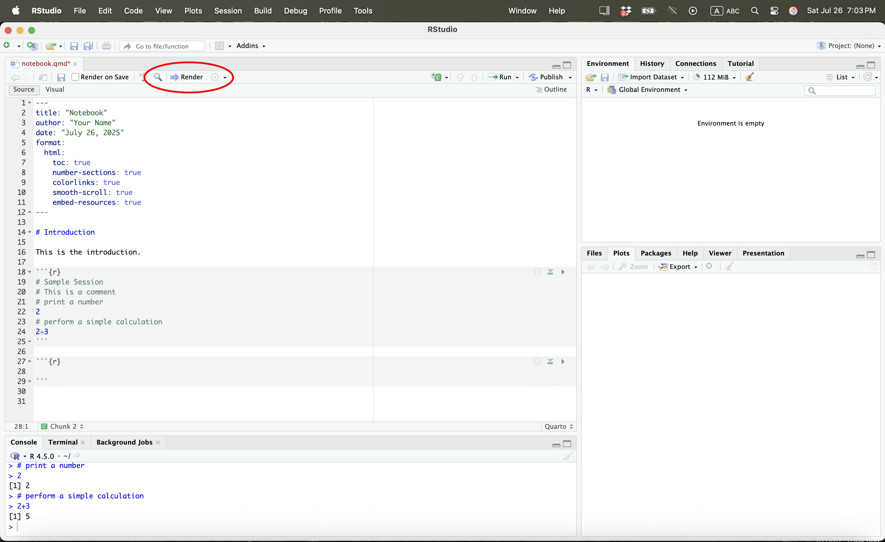Let us save the quarto file in a work folder called “example”.
