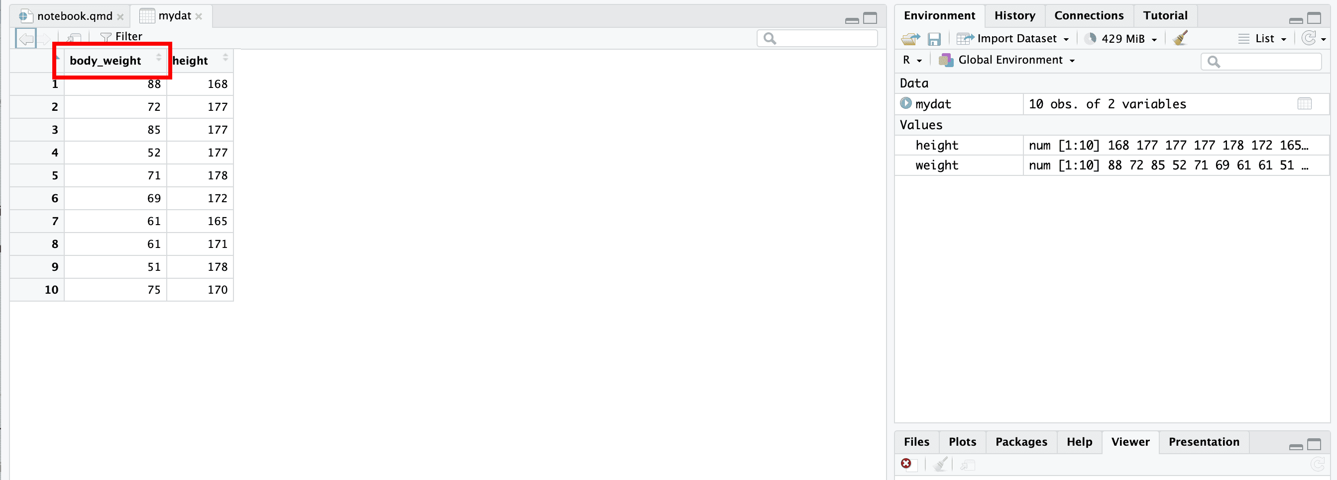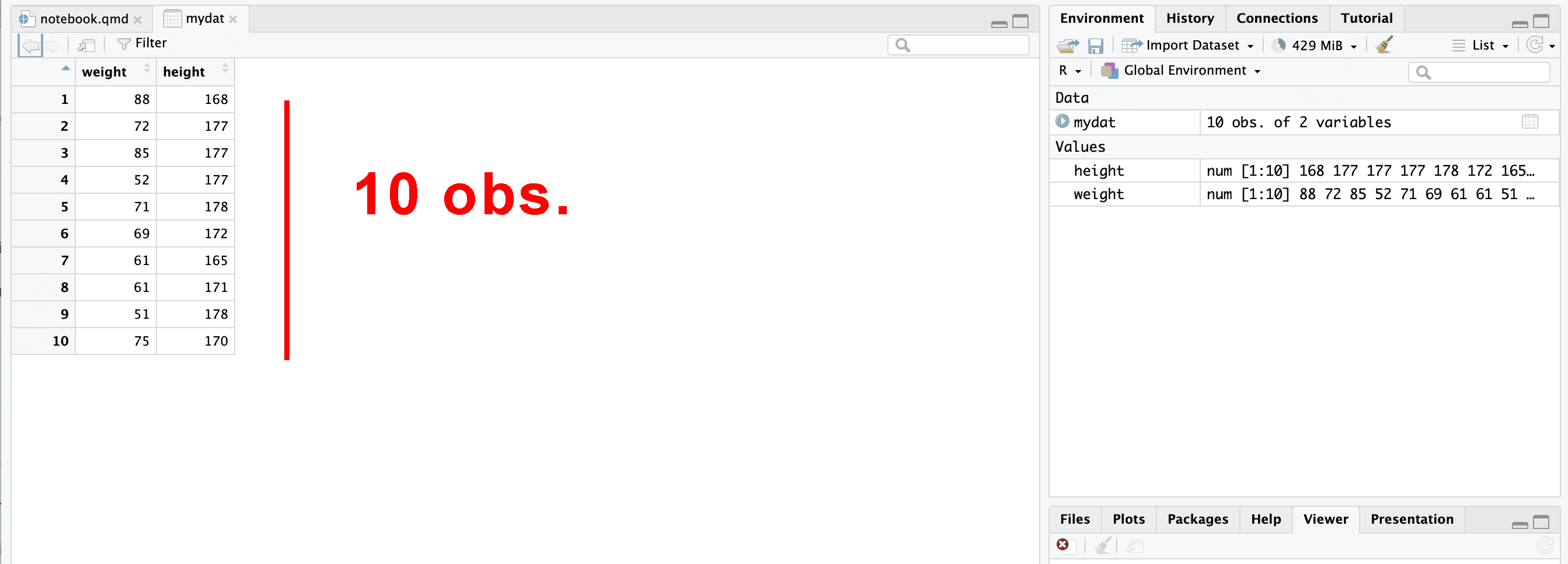 weight <- c(88, 72, 85, 52, 71, 69, 61, 61, 51, 75)