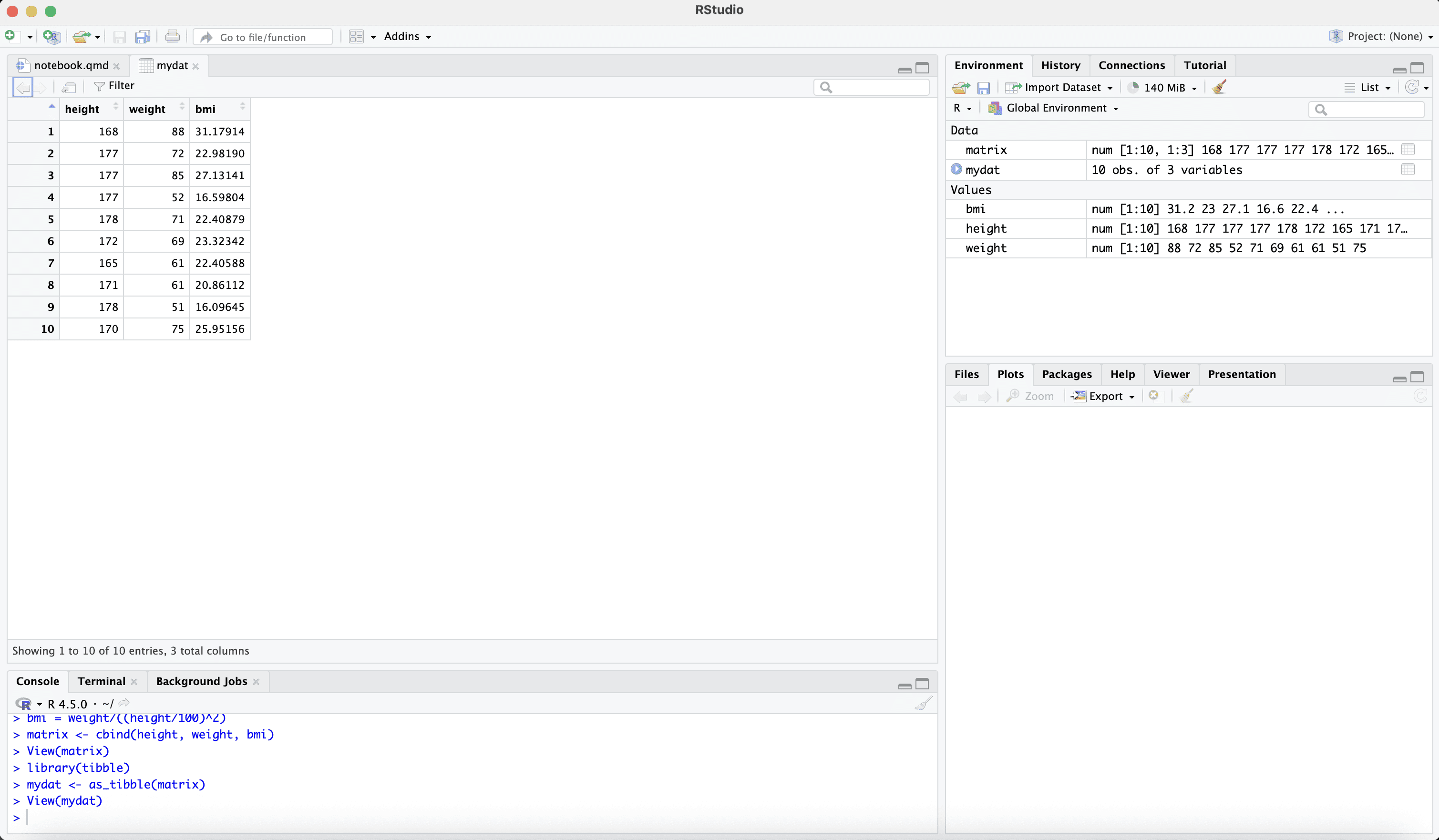 print(bmi) [1] 31.17914 22.98190 27.13141 16.59804 22.40879 23.32342 22.40588 20.86112