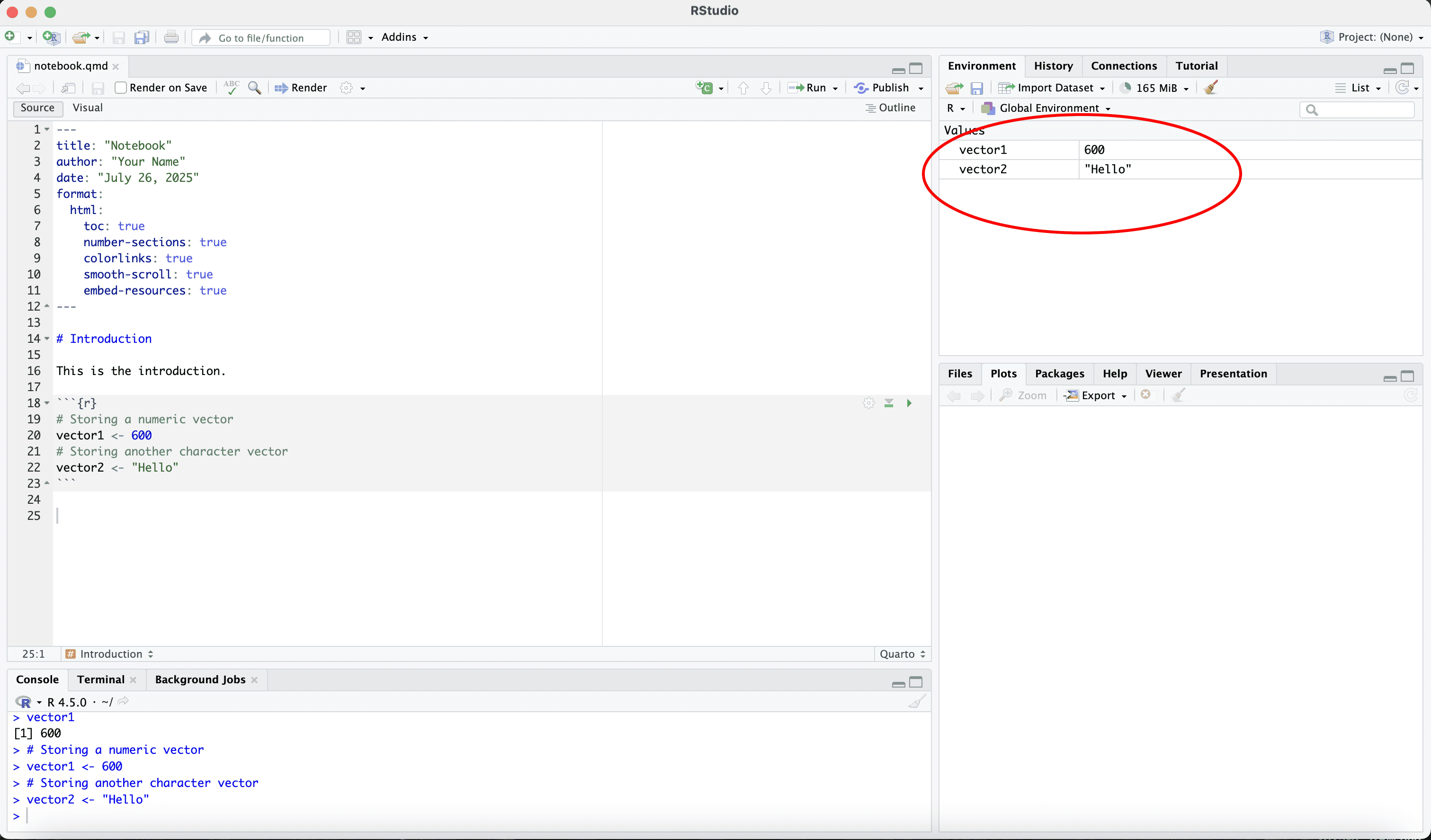 A vector of length 1 can be created by typing 600, "Hello" or TRUE.