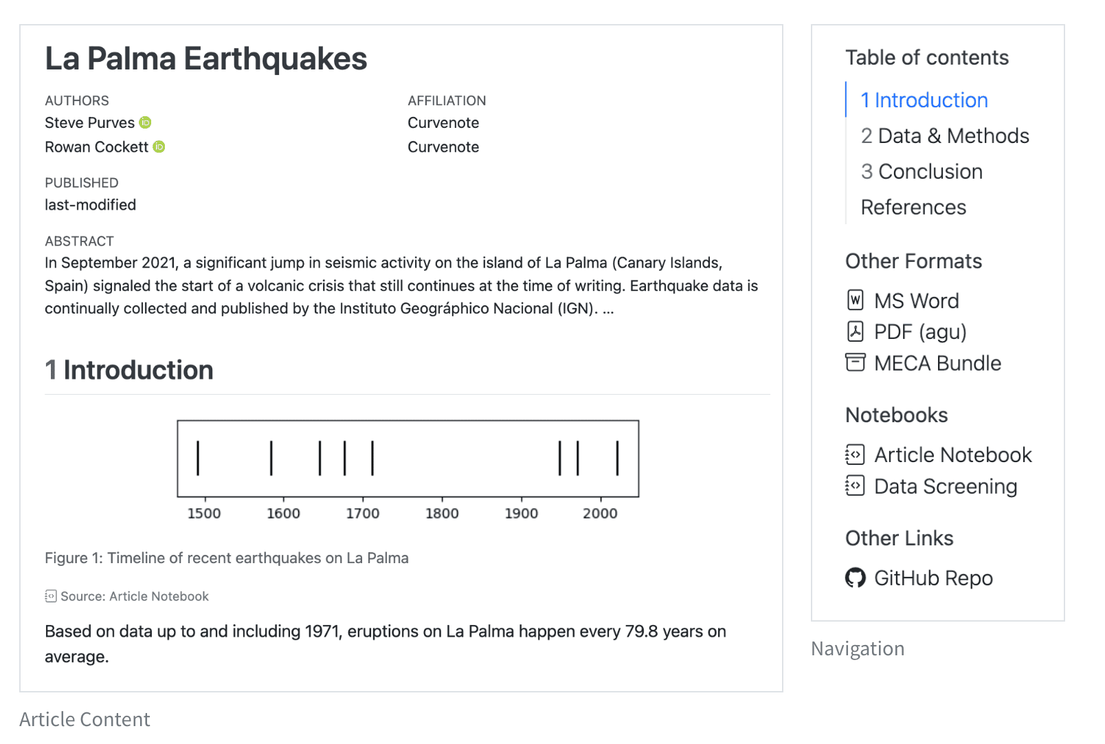 By using one or more notebooks or .qmd documents as the source of content and computations, computations can be published alongside the manuscript, allowing readers to dive into your code.