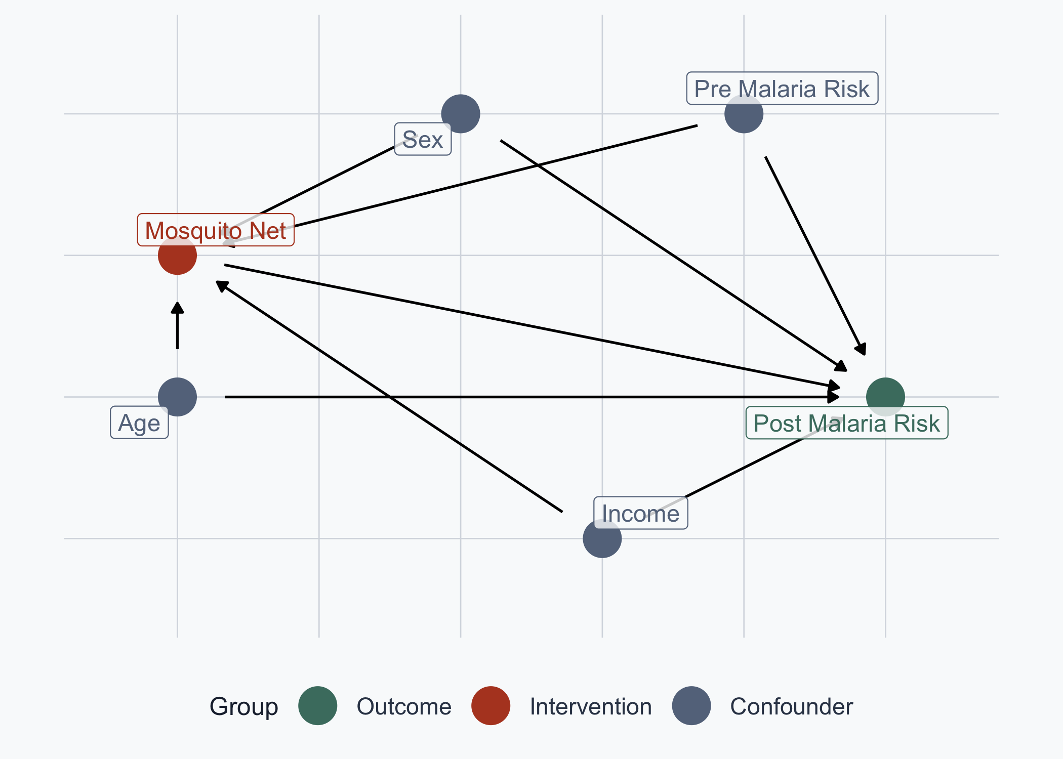 net ~ age + sex + income + pre_malaria_risk,