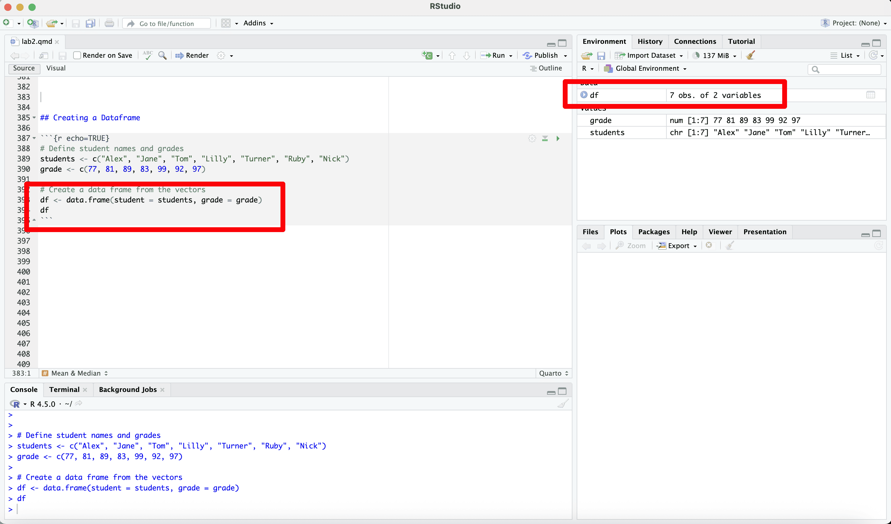 df has two variables: student and gradeThis is how we can calculate average for the two variables from the two dataframes