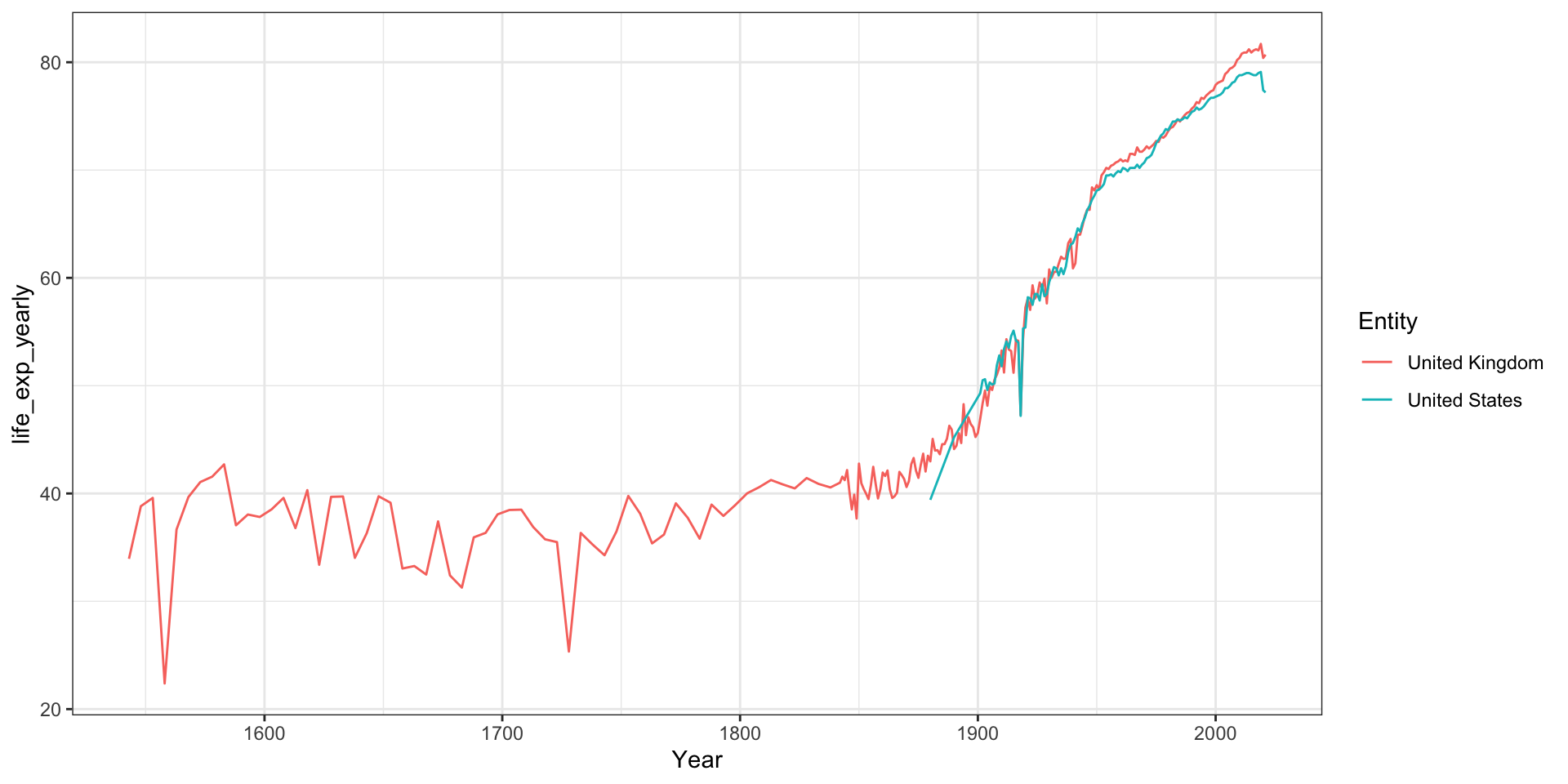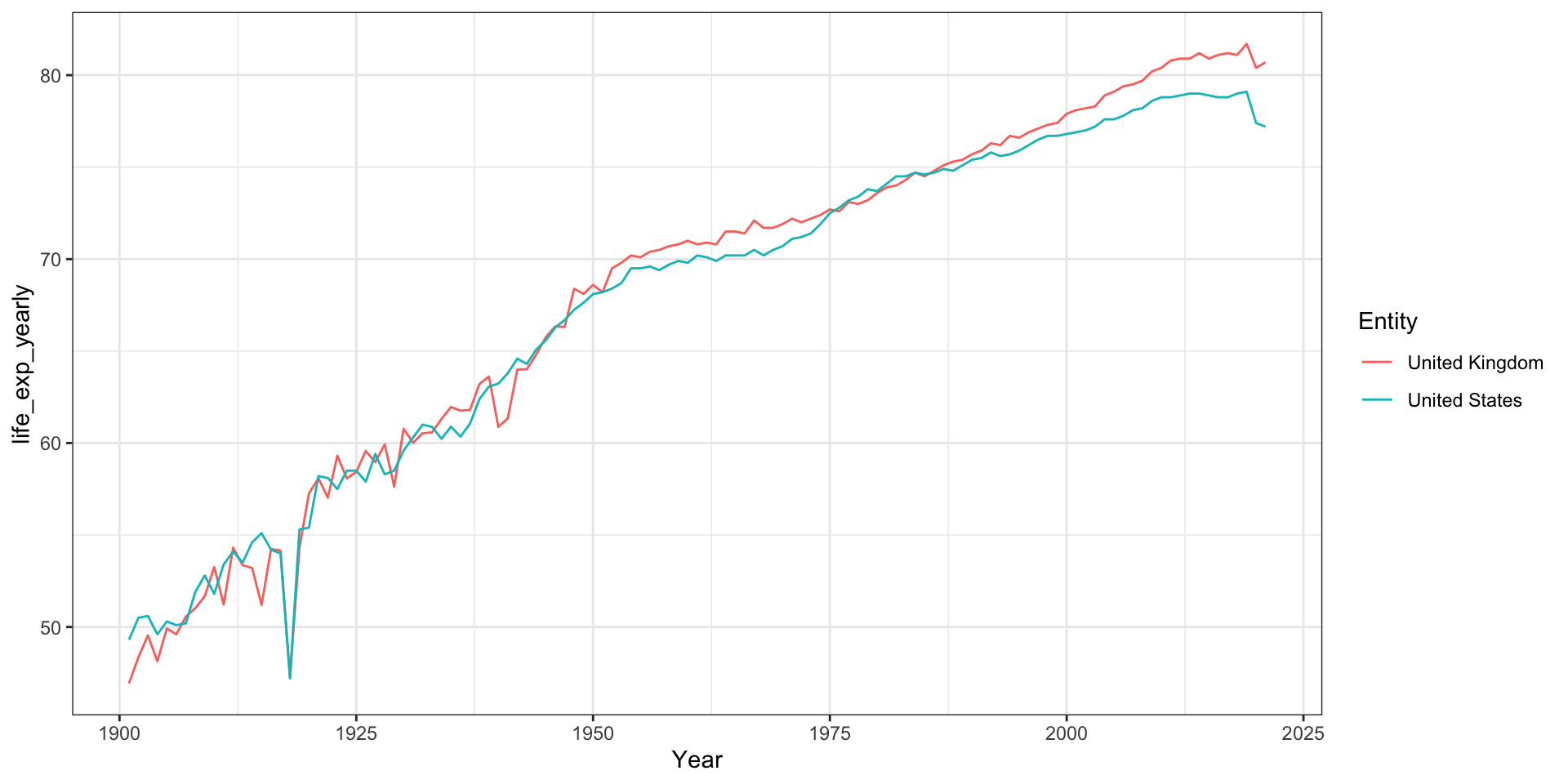 #Creating a new df with the UKdf_uk_after1900<-subset(df_us_uk_after1900, Entity=="United Kingdom")df_uk_after1900$Year[df_uk_after1900$life_exp_yearly==min(df_uk_after1900$life_exp_yearly)]