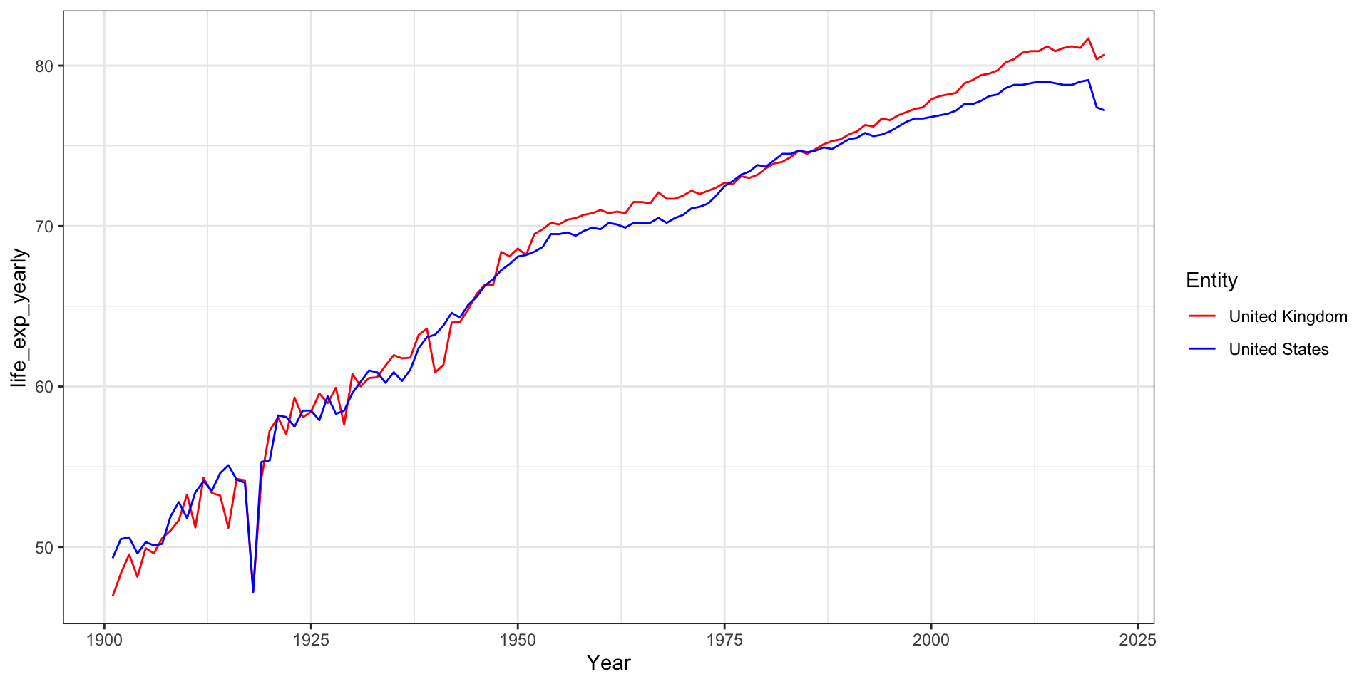#Creating a new df with the USdf_us_after1900<-subset(df_us_uk_after1900, Entity=="United States")df_us_after1900$Year[df_us_after1900$life_exp_yearly==min(df_us_after1900$life_exp_yearly)]