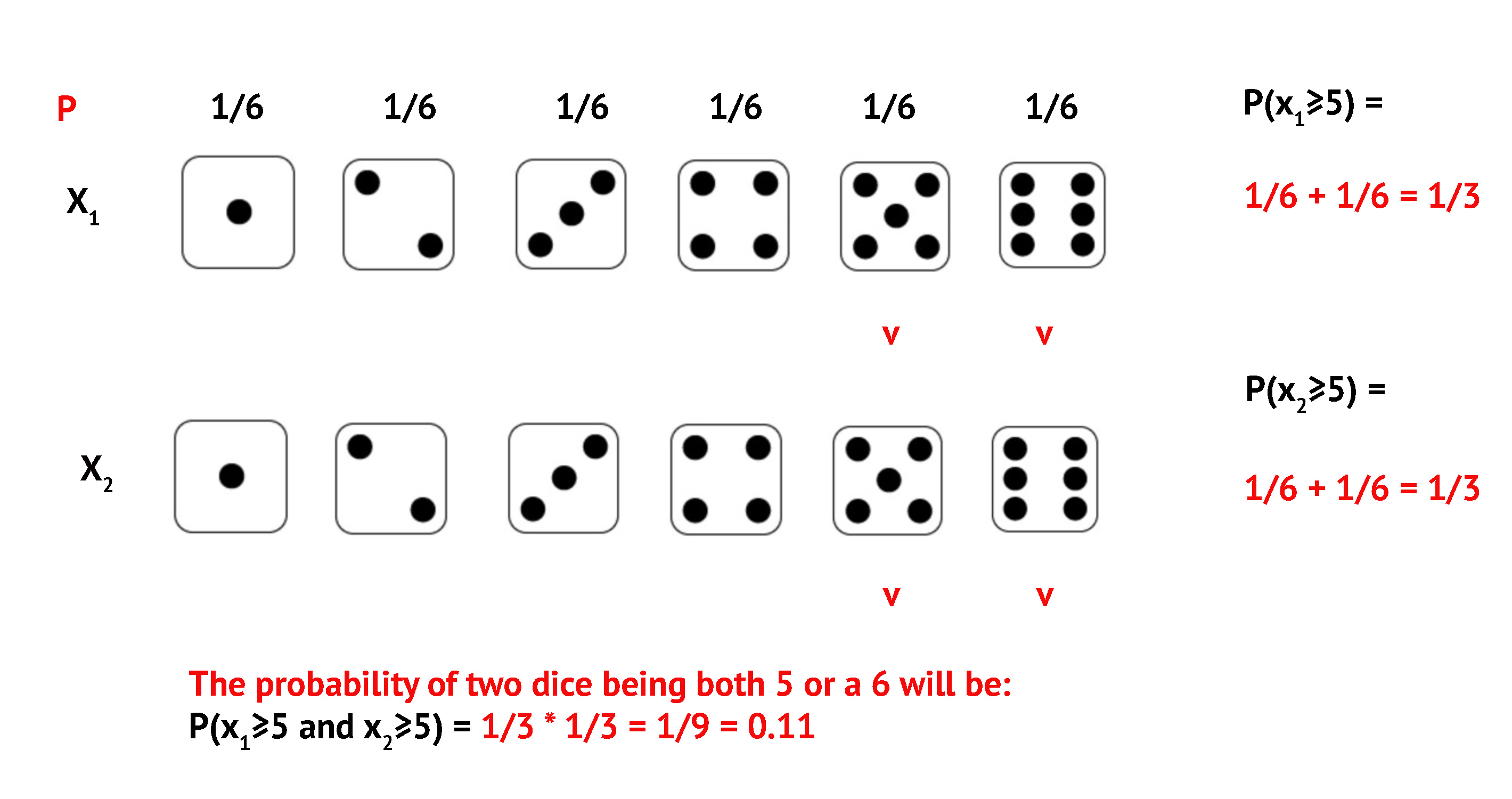 Example 3: Roll two dice. What is \(P(\text{both} \geq 5)\)?
