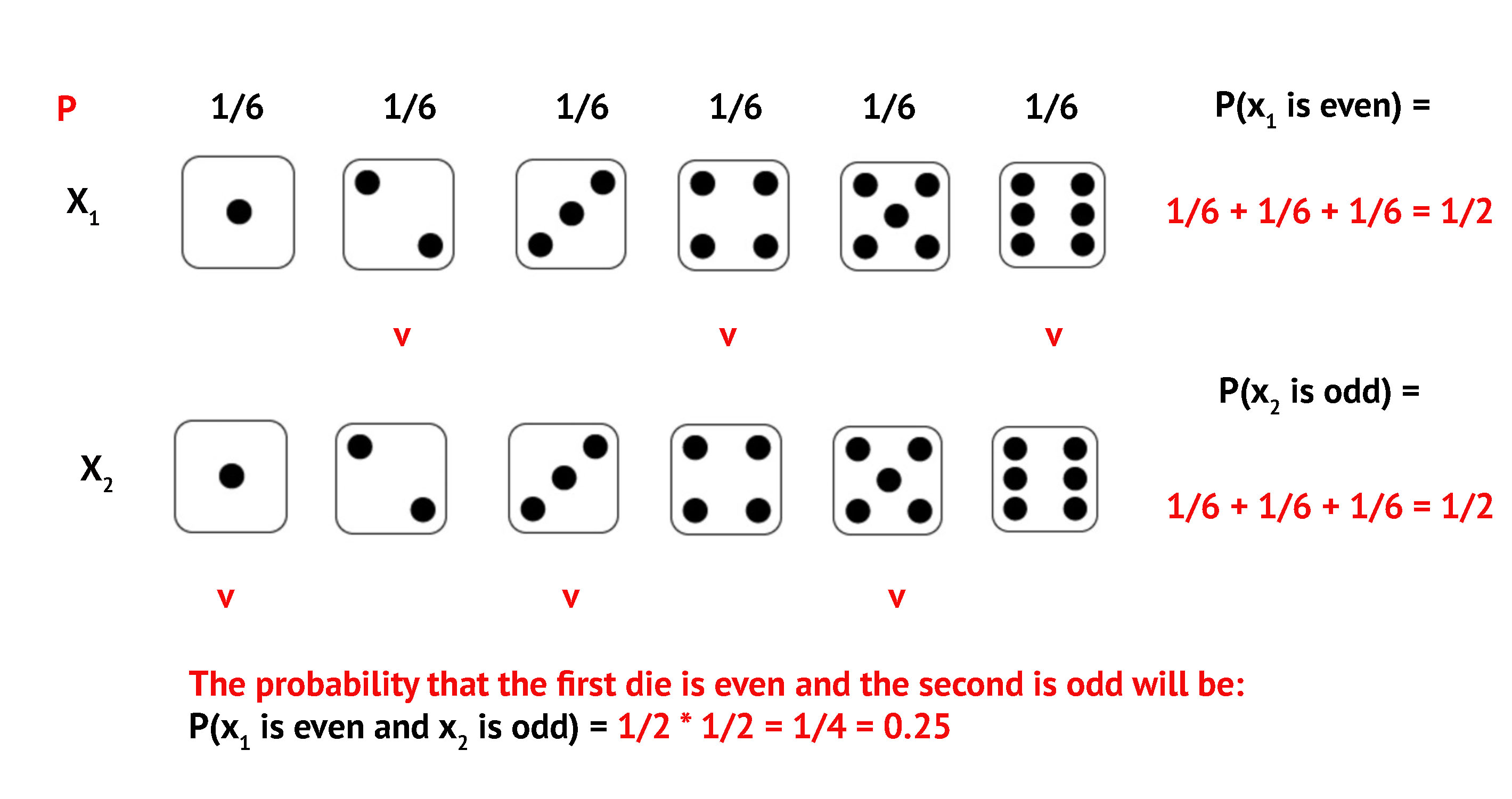 Even and Odd: \(P = 1/2 \times 1/2 = 1/4\)