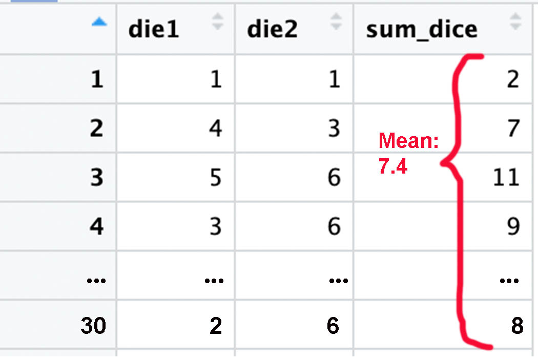 | Example | 10,000 die rolls → \(\bar{x} \to 3.5\) | 10,000 samples of 30 rolls → means form bell curve |