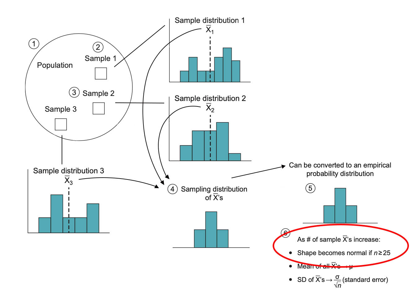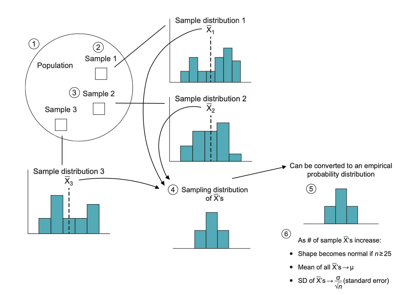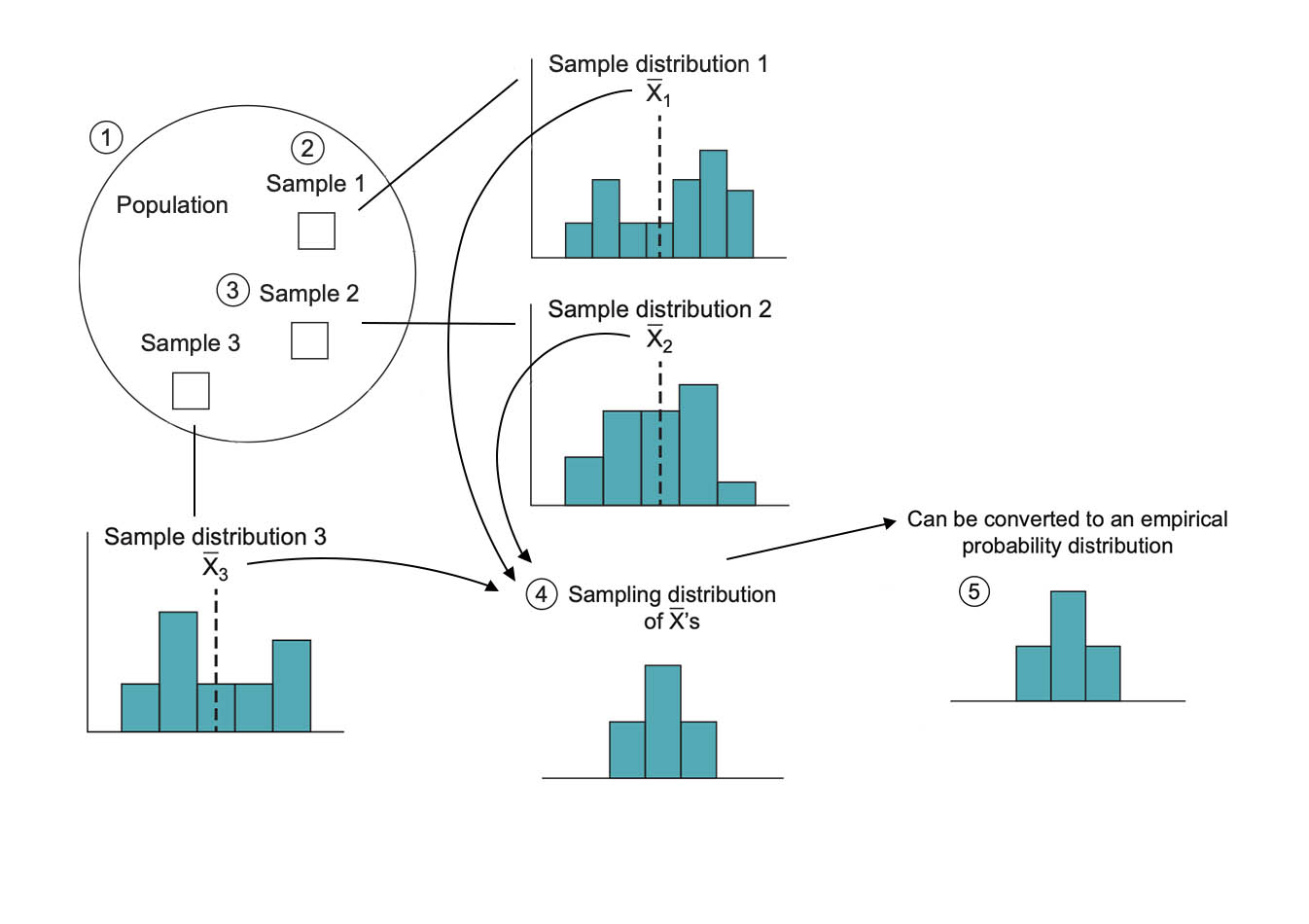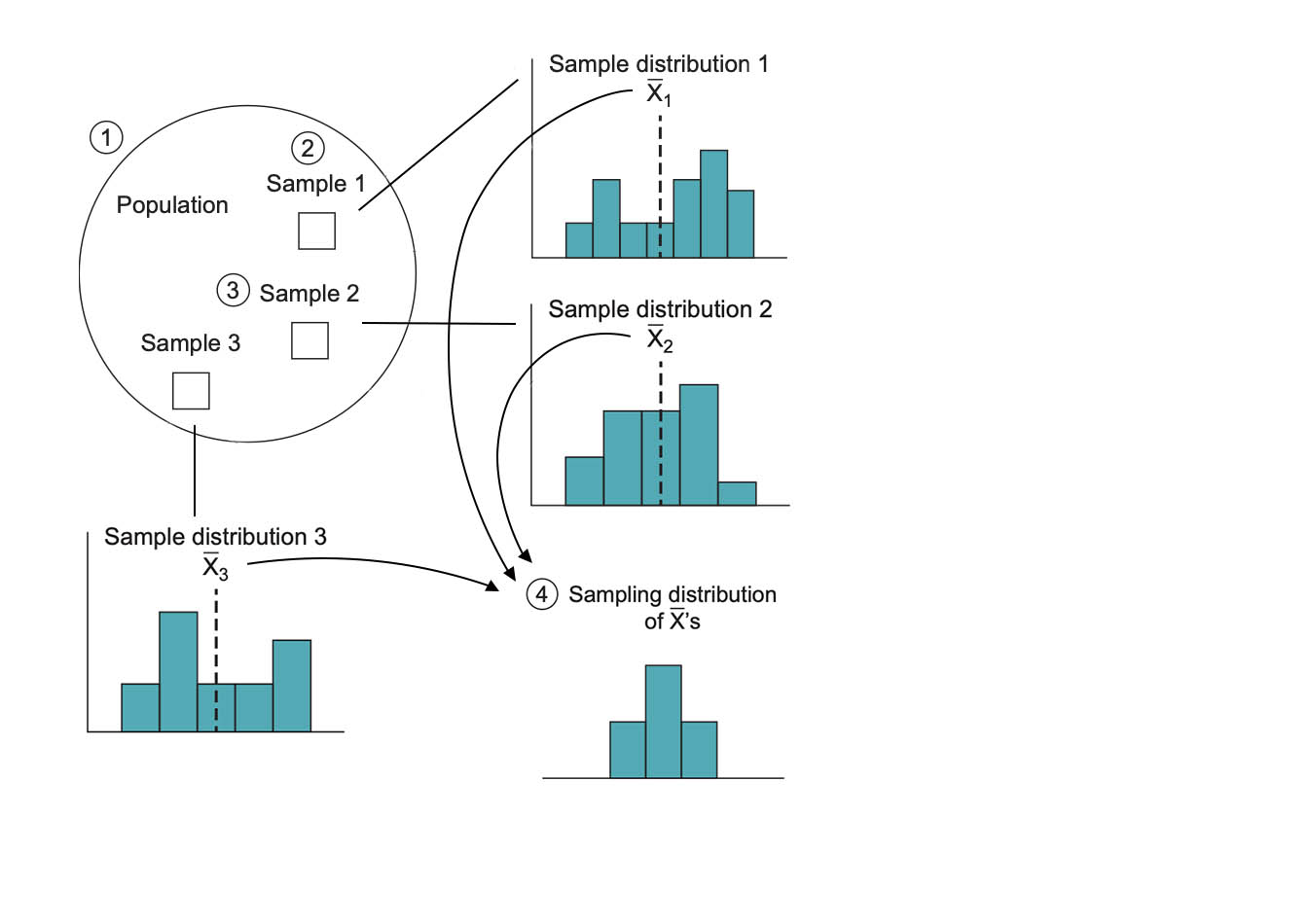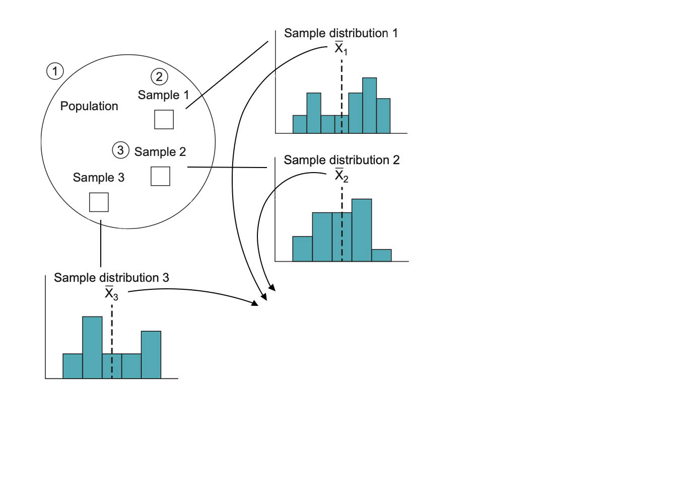 The researcher draws repeated samples: 1, 2, 3