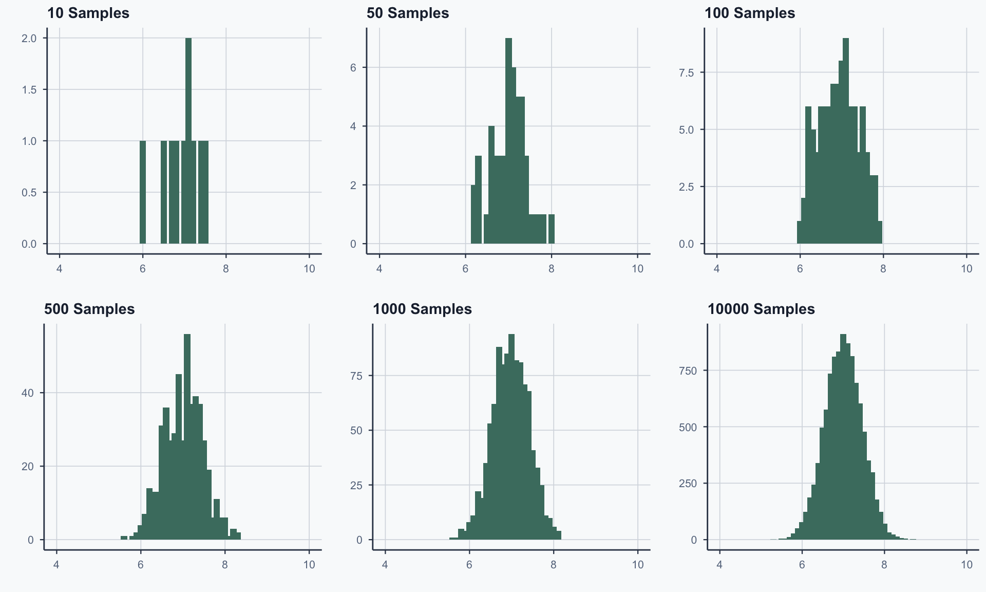 As we repeat more, the distribution of means takes shape