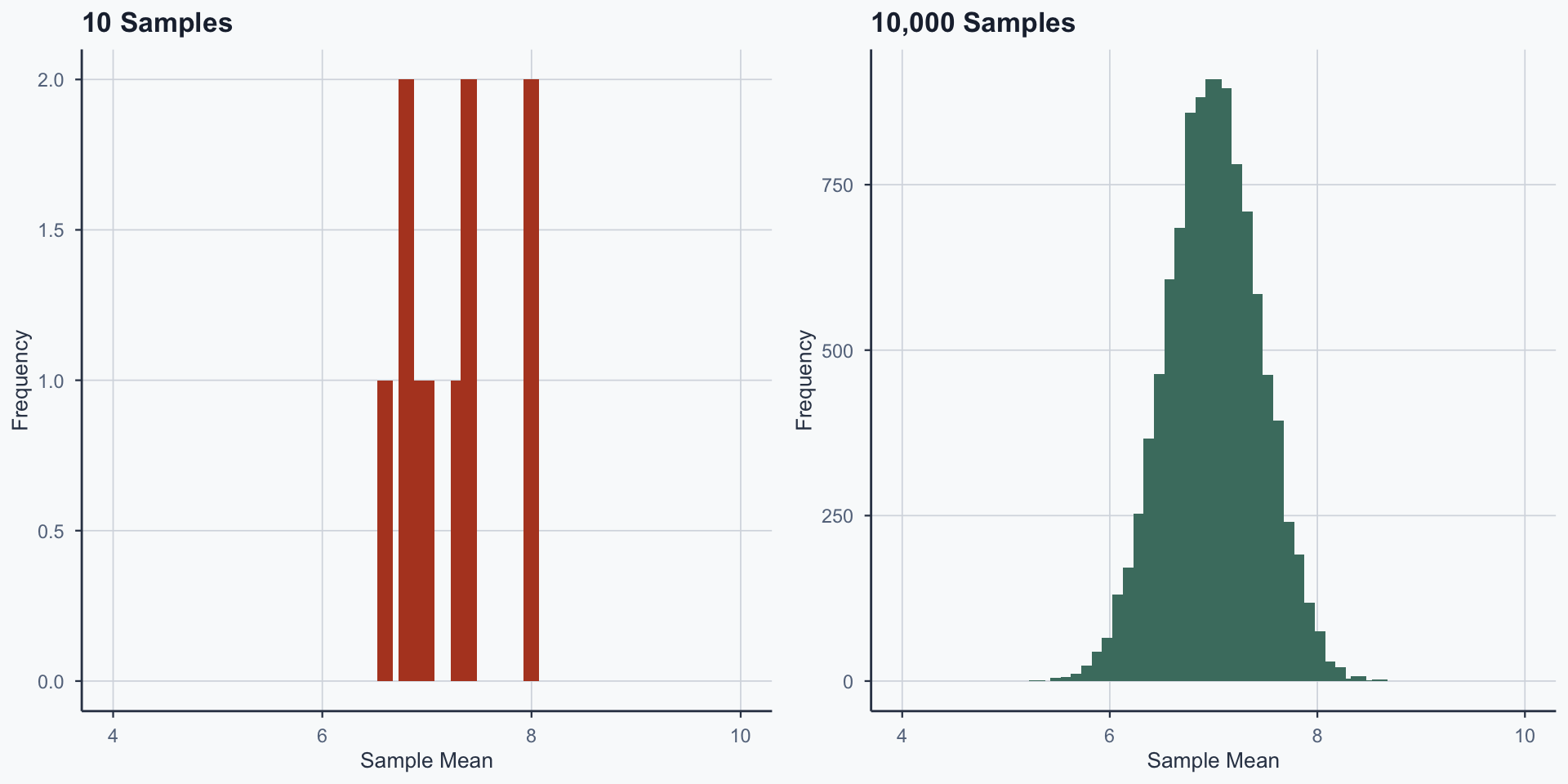 Central Limit Theorem: sample means → normal distribution