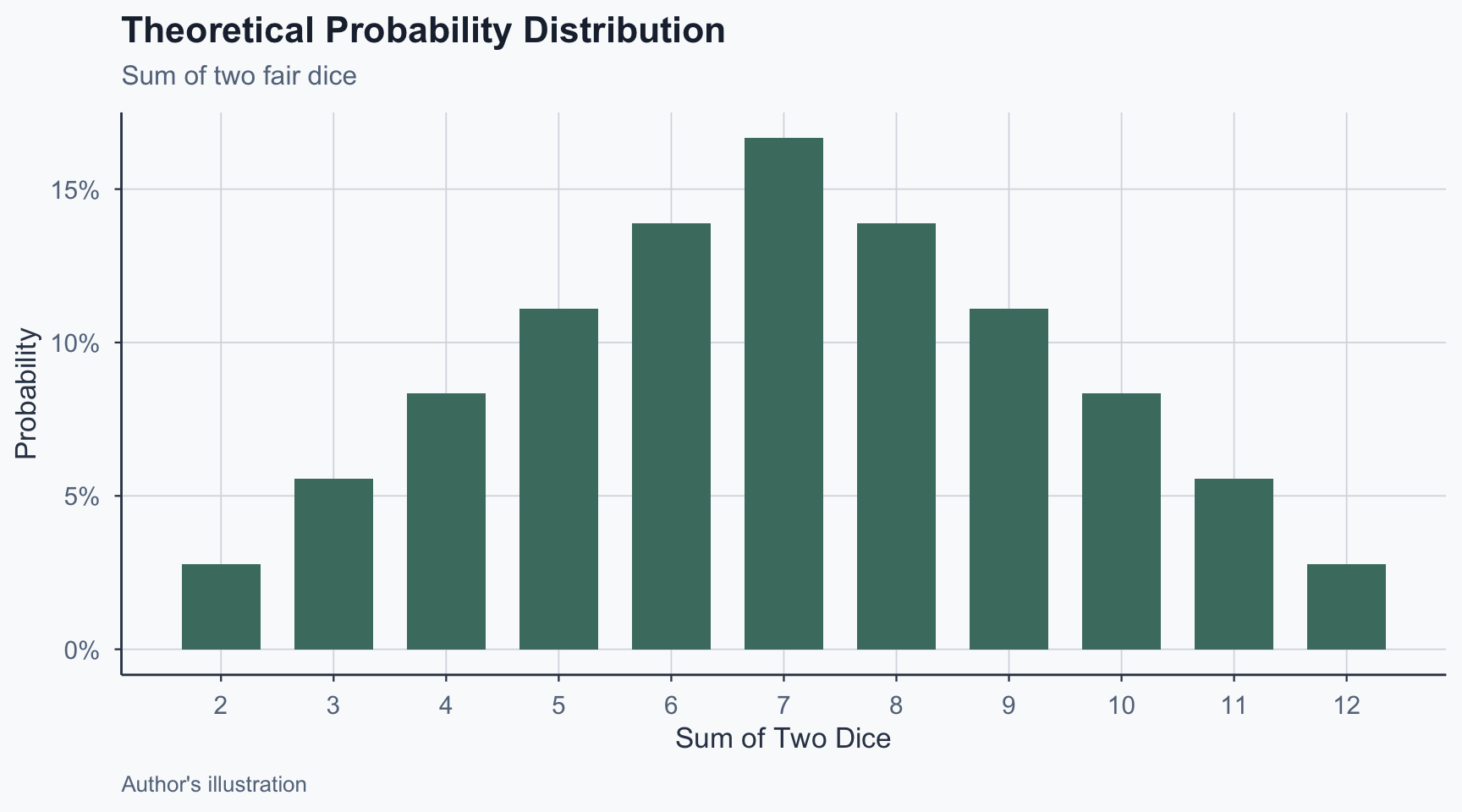 7 is the most likely sum (most combinations)