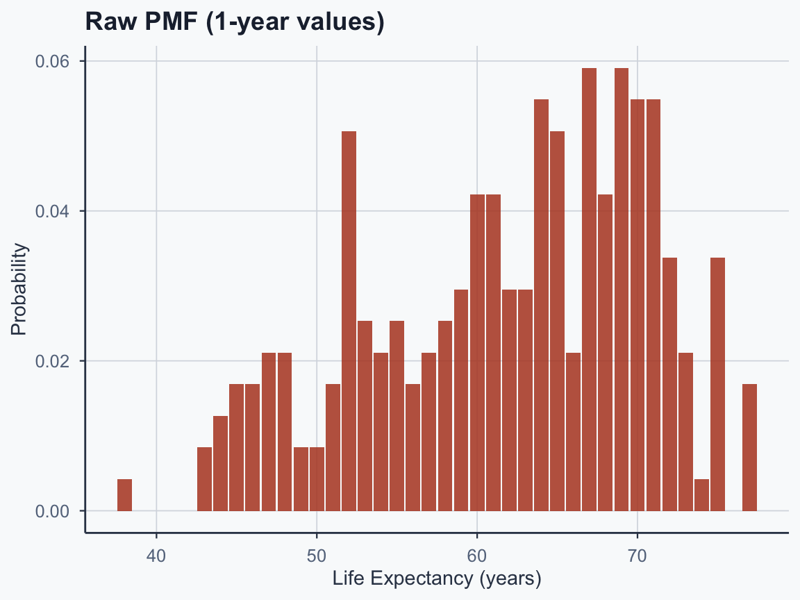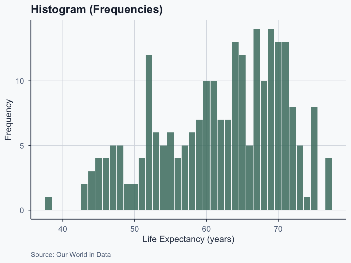 A["Raw Data"] --> B["Histogram<br/>(Frequencies)"]