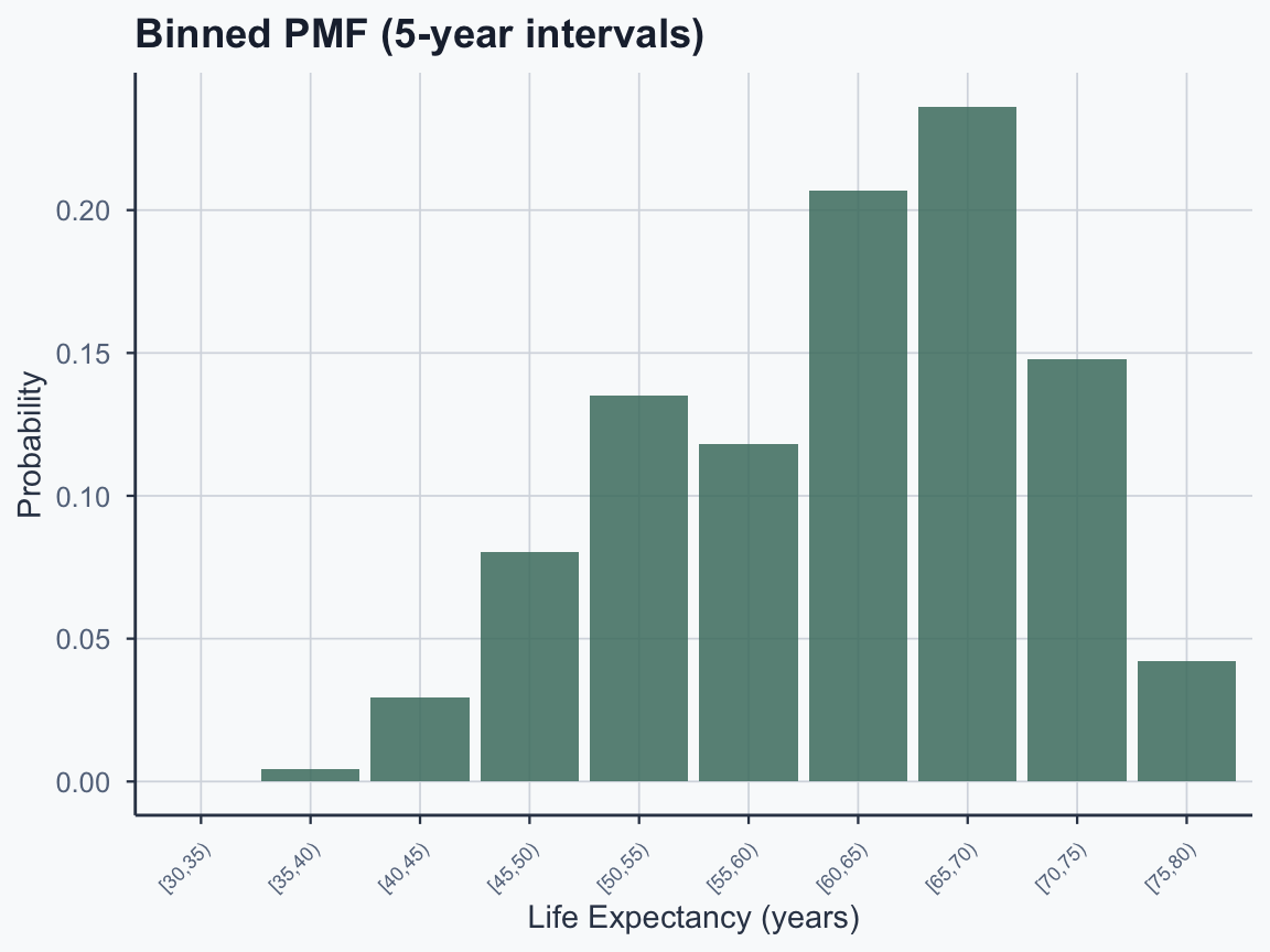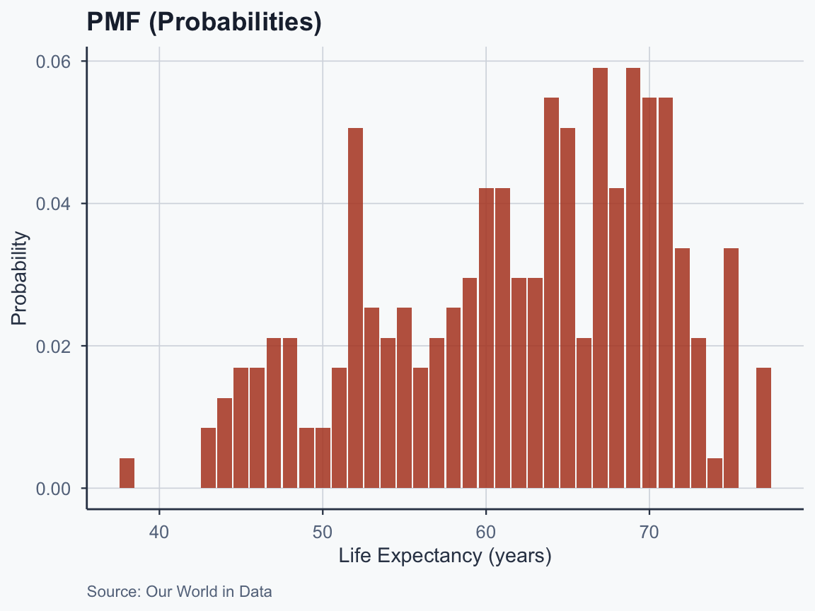 B --> C["PMF<br/>(Discrete Prob.)"]